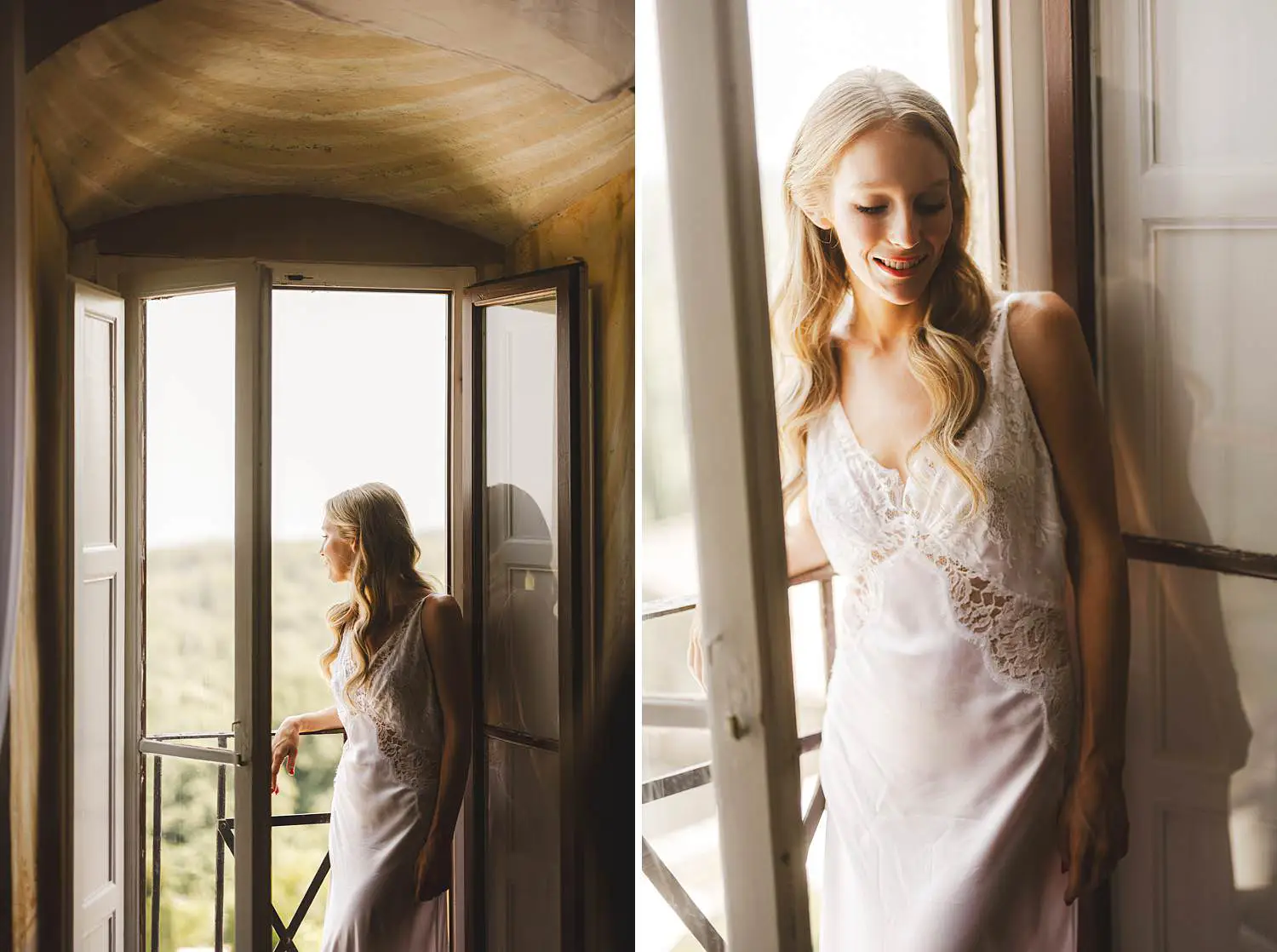 Elegant bride with wedding dress in a suite of luxury Castello di Celsa wedding in Tuscany. Photo by the Italian elegant wedding photographer in Tuscany Gabriele Fani