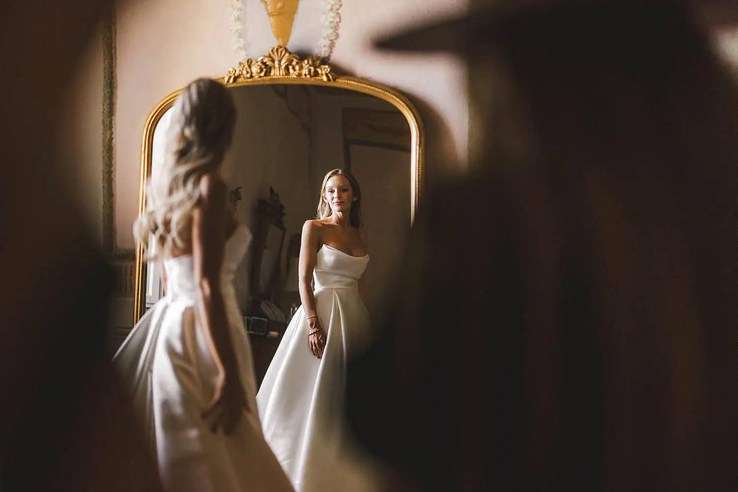 Elegant bride in gown candid photo while she’s looking herself in a mirror for the final touches at Castello di Celsa. Photo by the Italian elegant wedding photographer in Tuscany Gabriele Fani