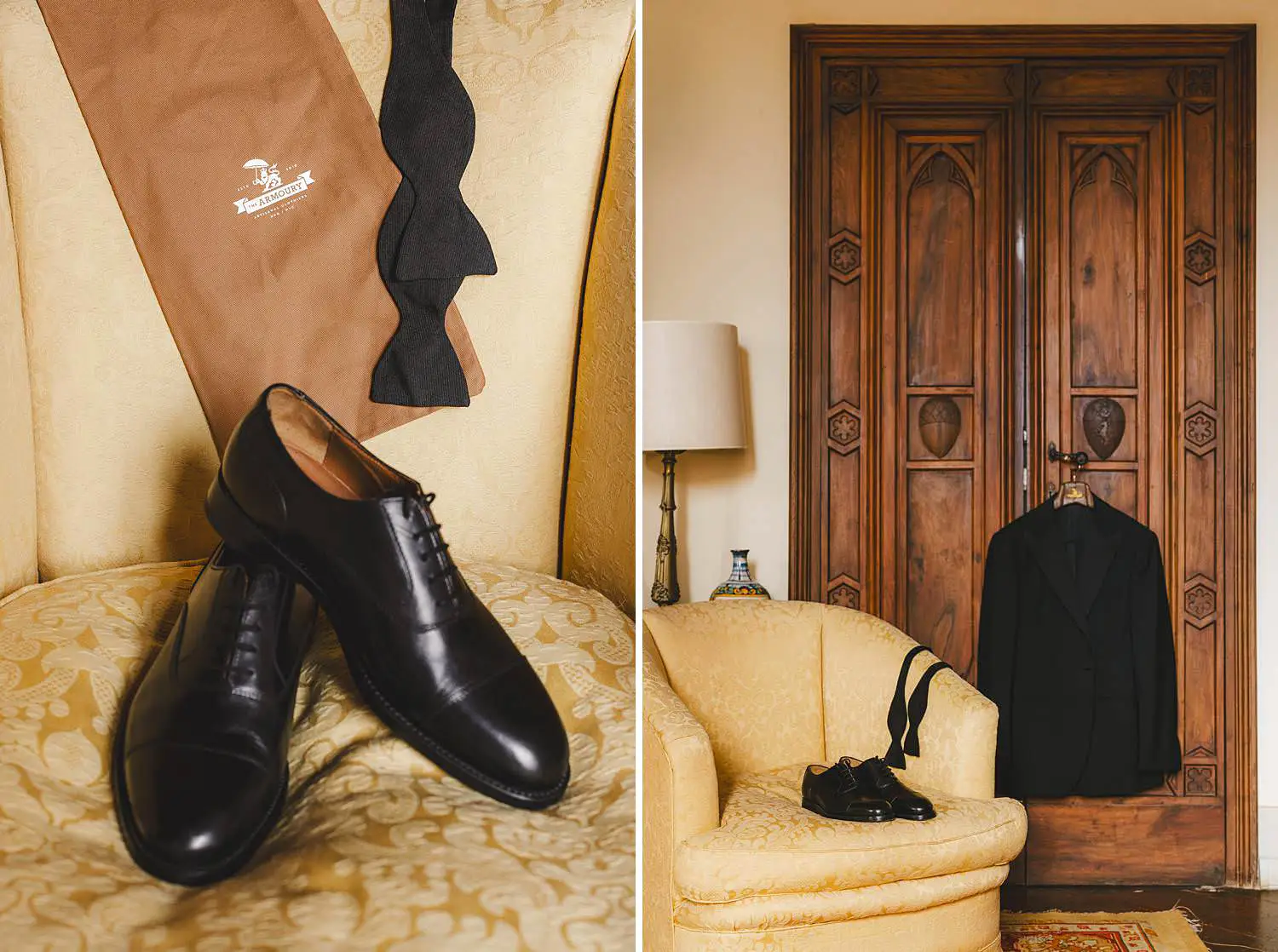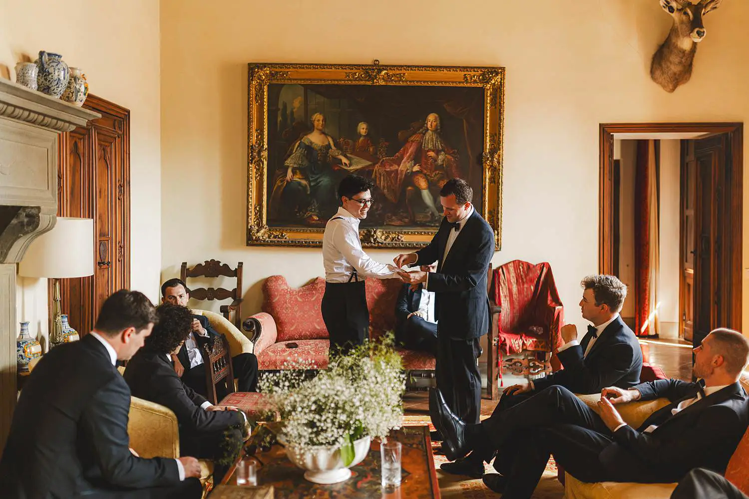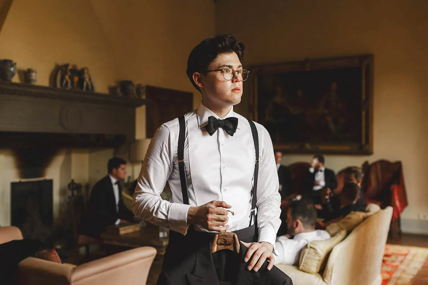 Groom get ready at luxury Castello di Celsa just before the first look with the bride. Photo by the Italian elegant wedding photographer in Tuscany Gabriele Fani