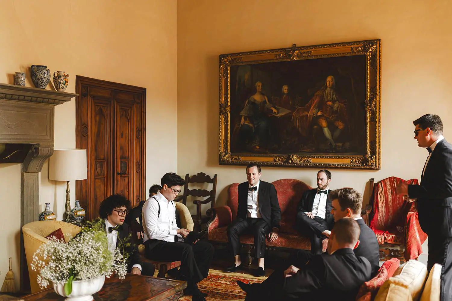 Groom and groomsmen ready for the unforgettable wedding ceremony at Castello di Celsa in Tuscany. Photo by the Italian elegant wedding photographer in Tuscany Gabriele Fani
