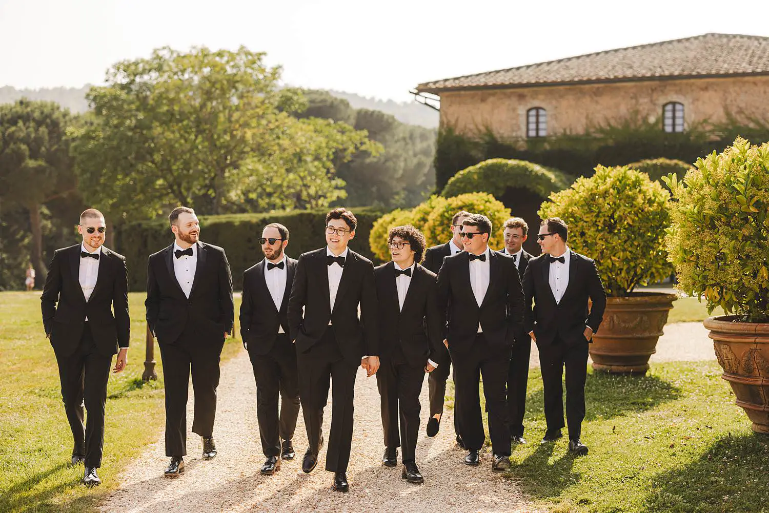 The groom shares a relaxed walk with his best men in the scenic grounds of Castello di Celsa. Photo by the Italian elegant wedding photographer in Tuscany Gabriele Fani