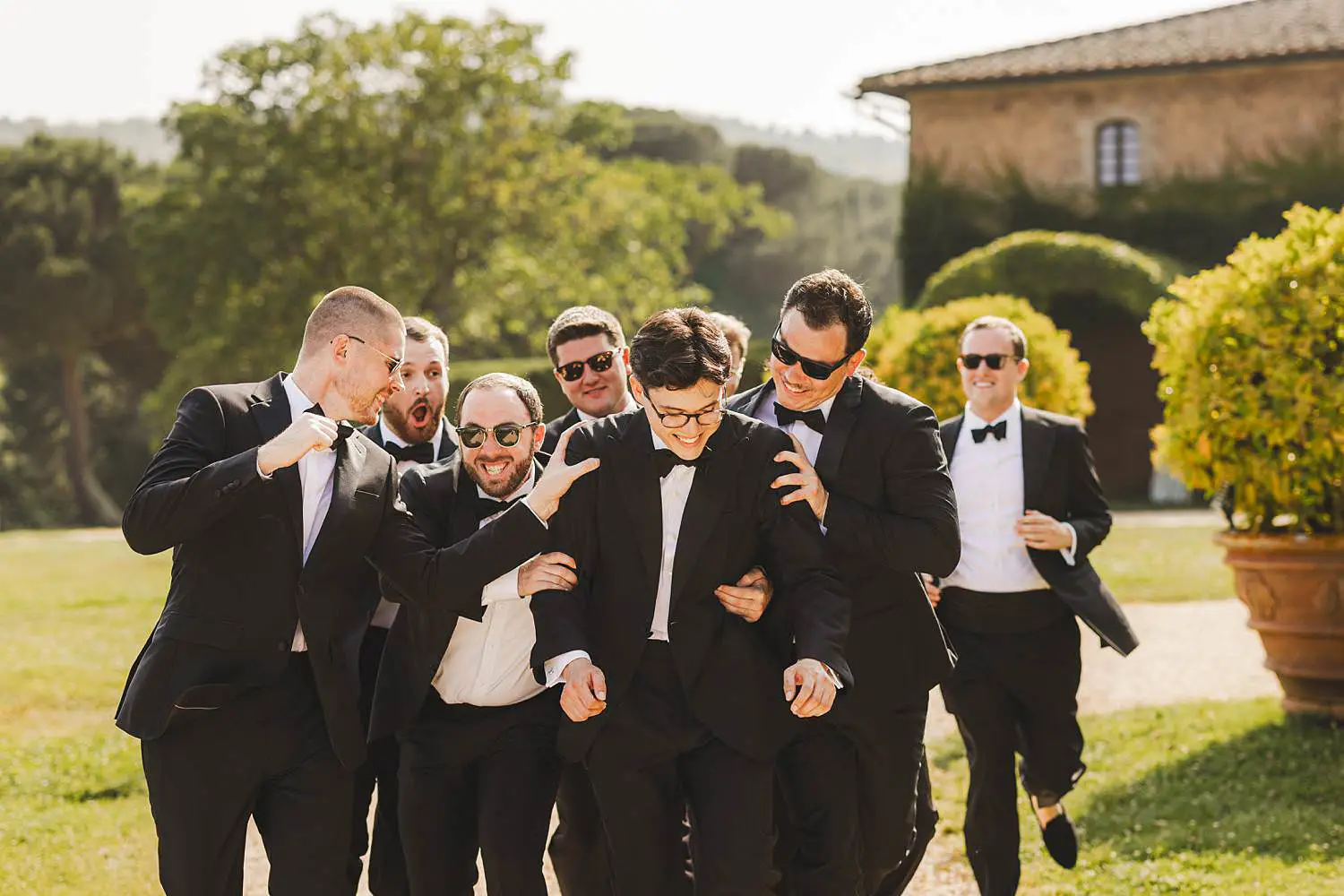 The groom shares a joyful moment with his best men in the scenic grounds of Castello di Celsa. Photo by the Italian elegant wedding photographer in Tuscany Gabriele Fani