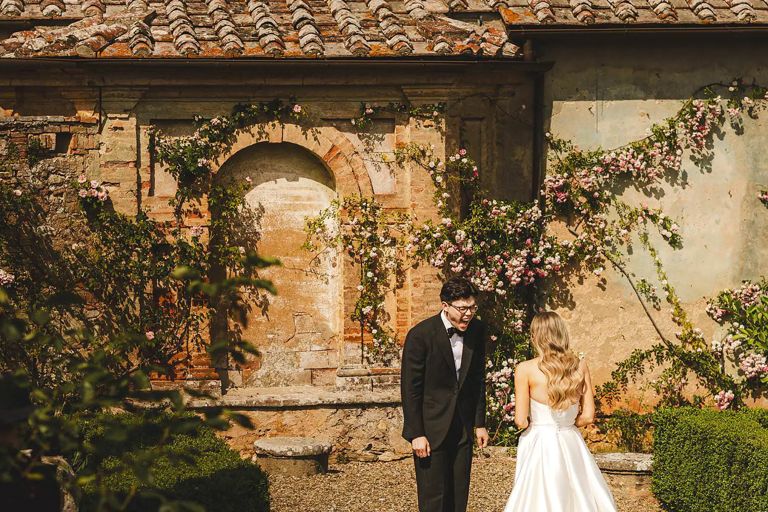 Bride and groom first look at Castello di Celsa, luxury wedding venue in Tuscany. Photo by the Italian elegant wedding photographer in Tuscany Gabriele Fani