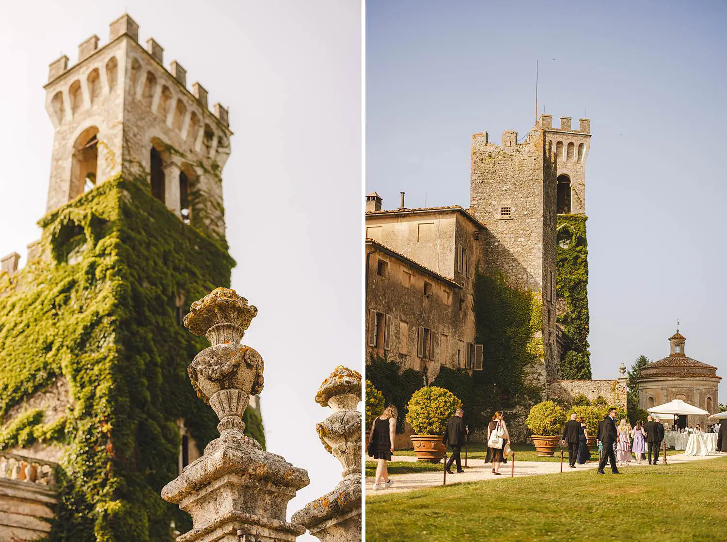 After the ceremony, we explored the castle grounds for couple portraits, making use of hidden courtyards, ivy-covered walls and architectural details unique to this extraordinary Tuscan wedding venue. The surrounding countryside, with its rolling hills and warm tones, added a timeless and ethereal quality to the images.