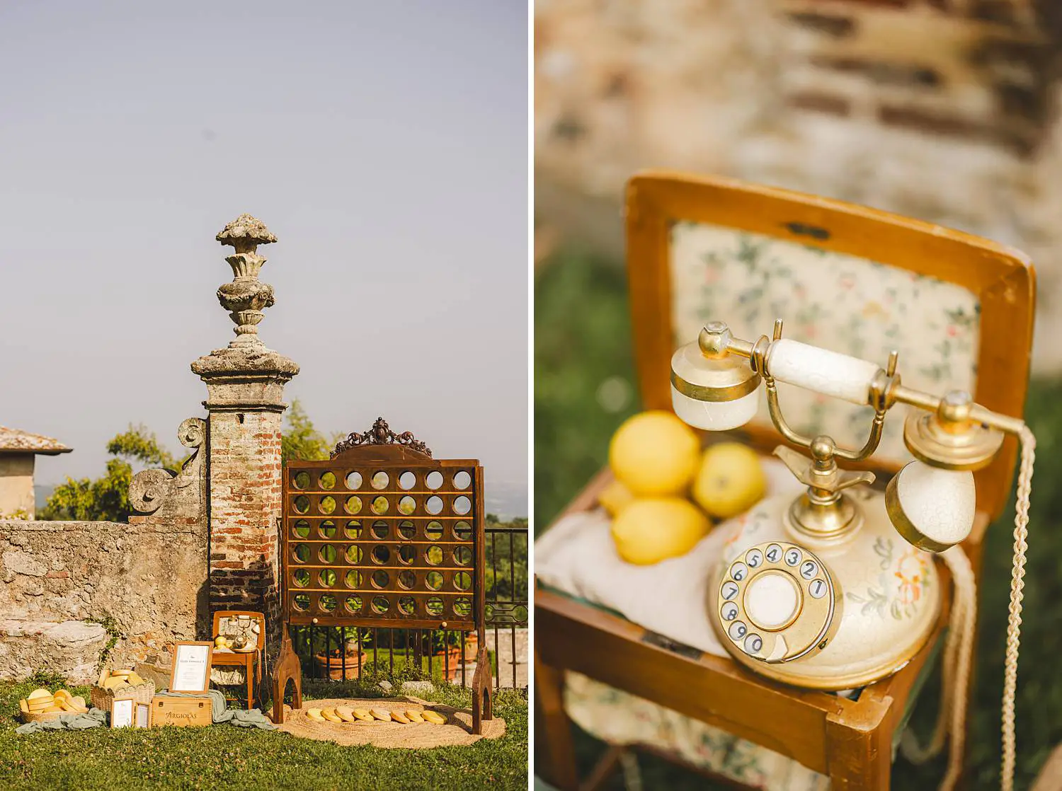 Elegant and refined luxury wedding reception cocktail decoration setup at Castello di Celsa in Tuscany. Photo by the Italian elegant wedding photographer in Tuscany Gabriele Fani