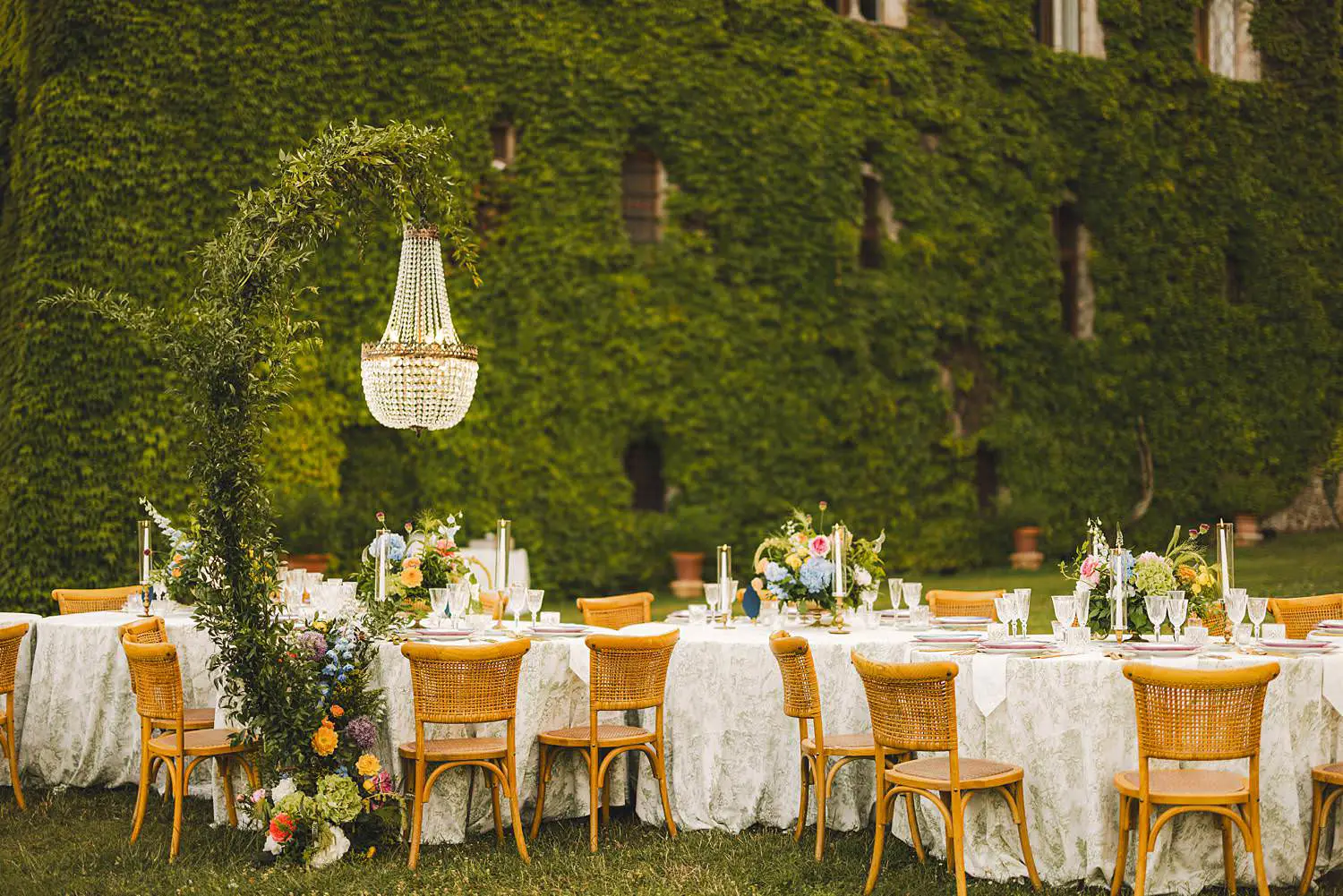 A dreamy long-table wedding look cascading florals, woven chairs, chandeliers floating above the greenery, and the softest evening light at Castello di Celsa. Photo by the Italian elegant wedding photographer in Tuscany Gabriele Fani