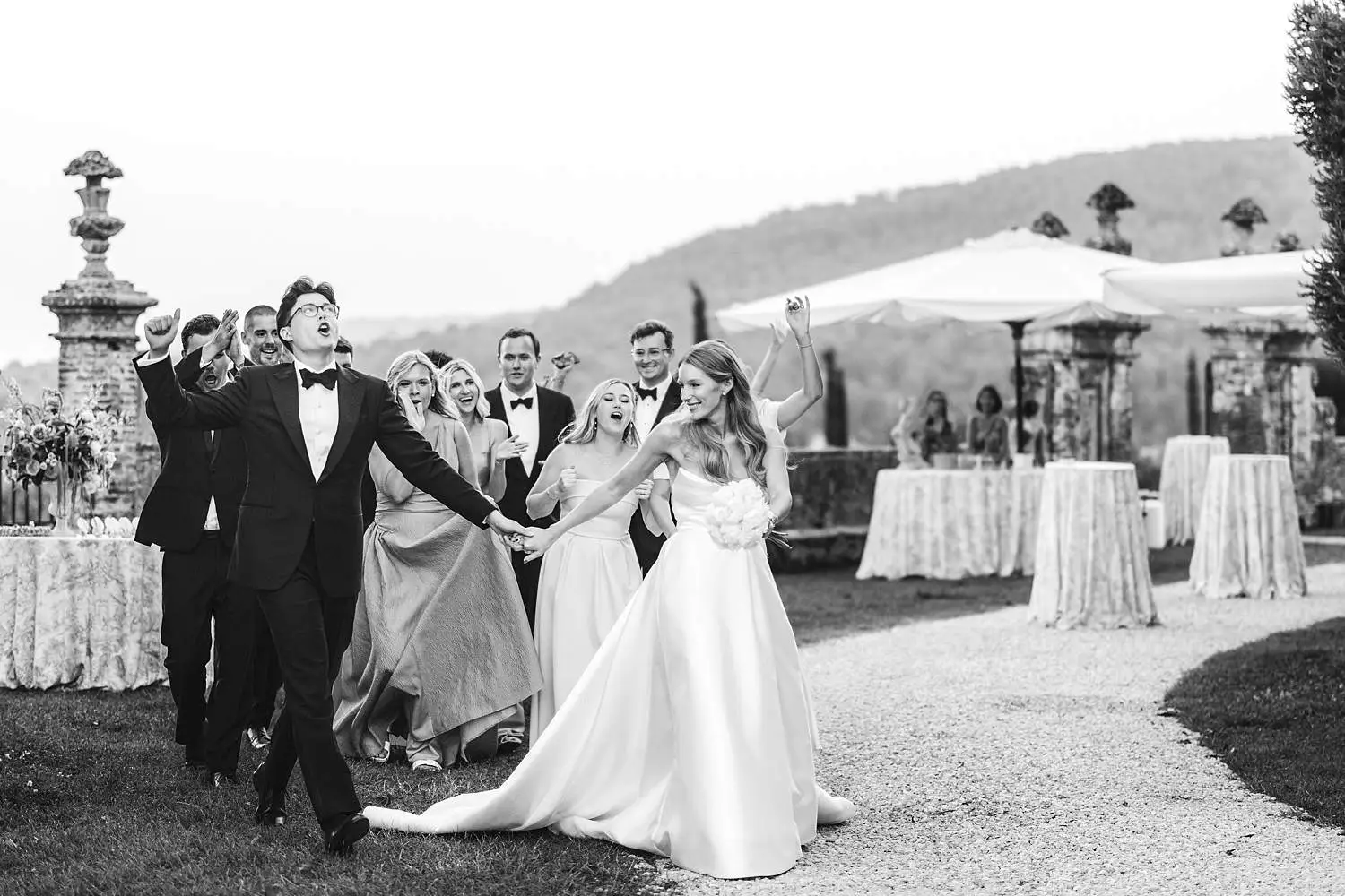 Exciting and fun bride and groom bridal party wedding photo in the staircase of Castello di Celsa luxury venue in Tuscany. Photo by the Italian elegant wedding photographer in Tuscany Gabriele Fani