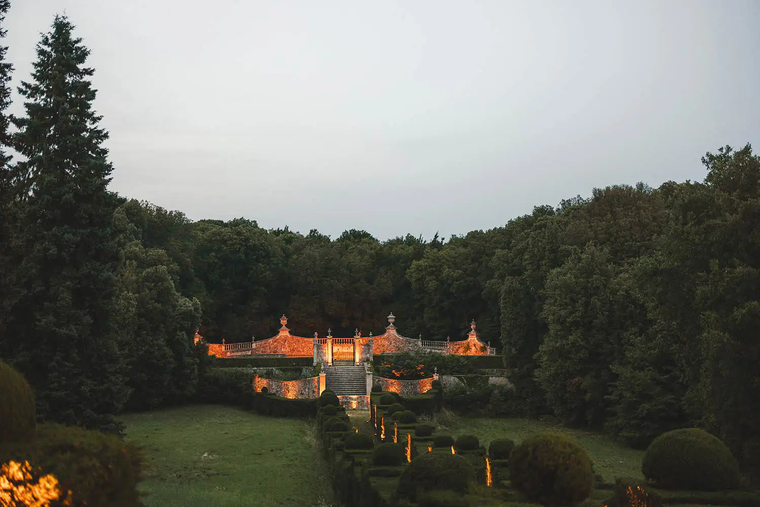 As sunset approached, guests gathered to the side of the castle’s grand courtyard entrance for an imperial-style dinner. A long table, styled with understated elegance and illuminated by arched chandelier lights, created a magical atmosphere. Heartfelt speeches, laughter and emotional toasts filled the evening, followed by gorgeous fireworks as surprise for all the guest under the stars.