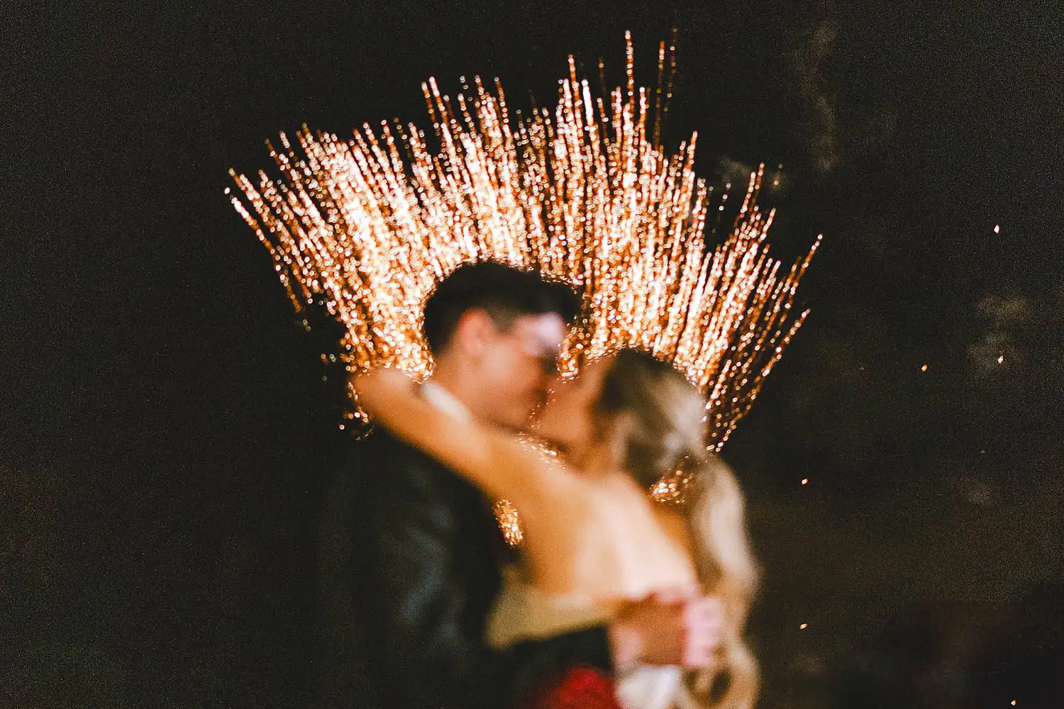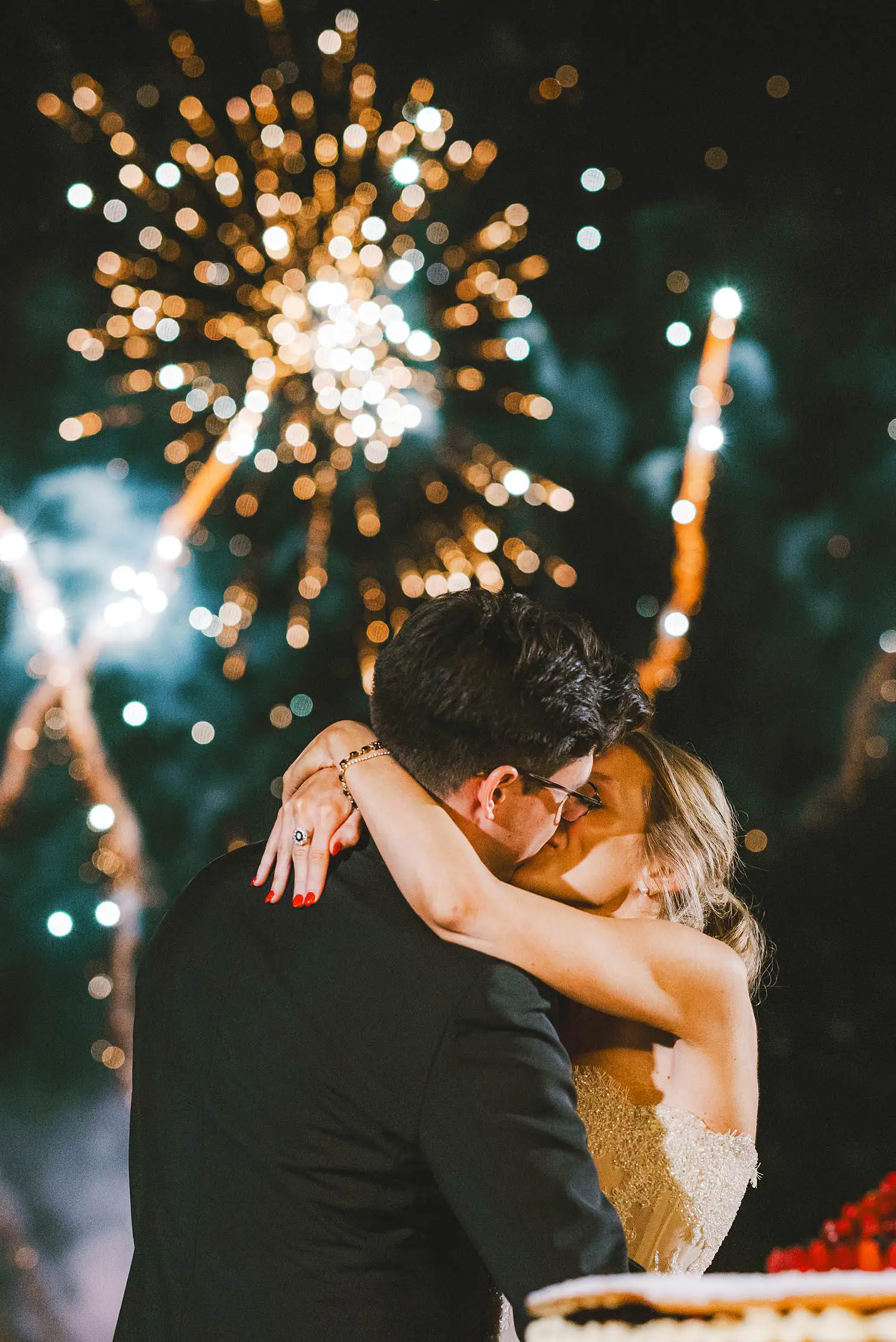 Bride and groom kiss with fireworks illuminating the night sky at luxury wedding at Castello di Celsa in Tuscany. Photo by the Italian elegant wedding photographer in Tuscany Gabriele Fani