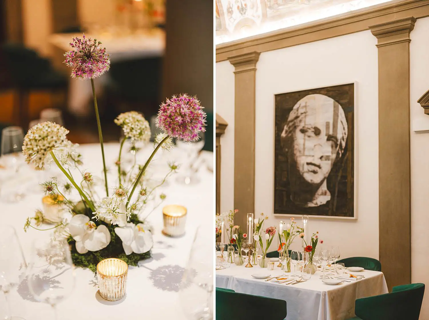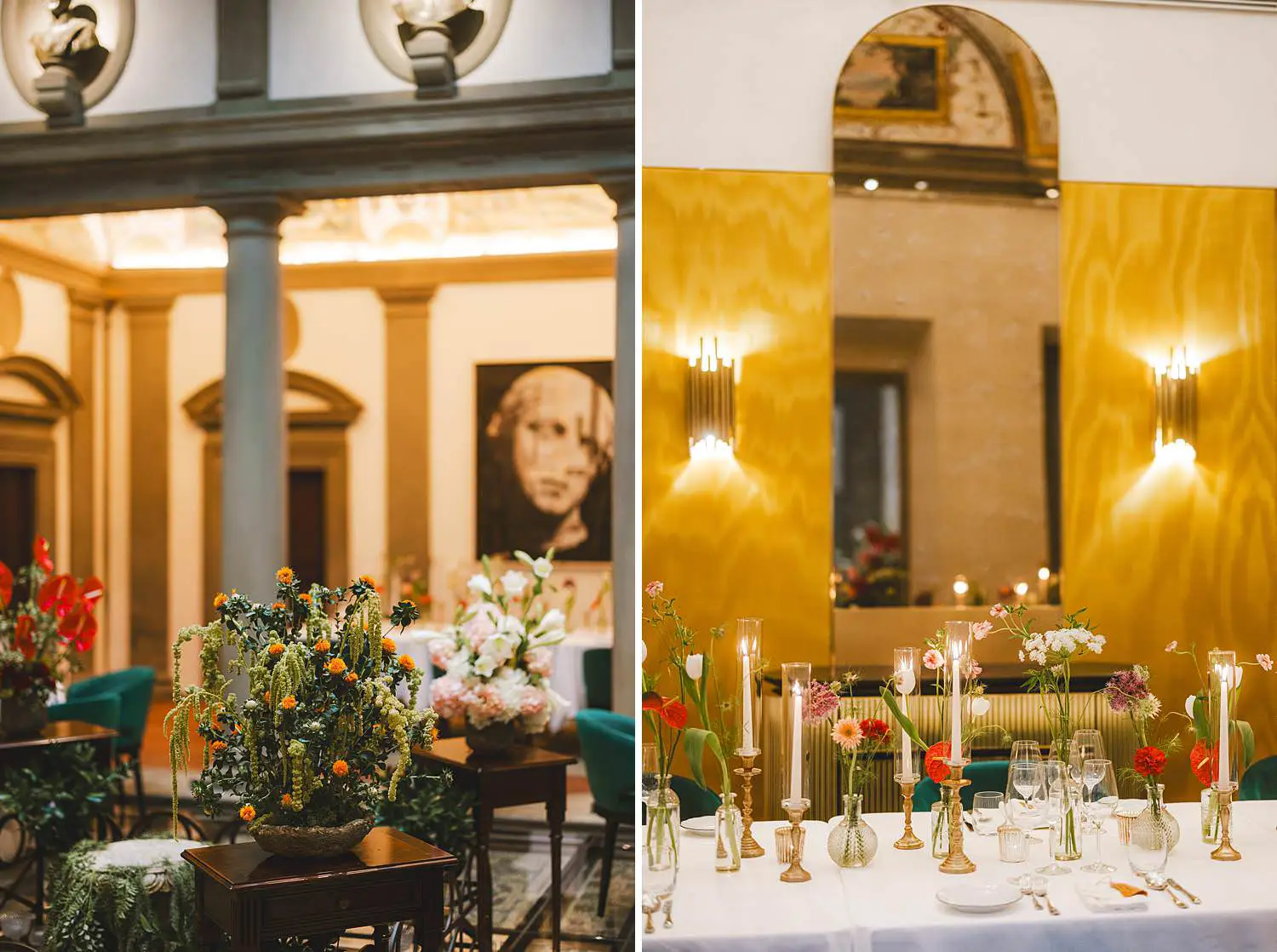 Luxury and elegant rehearsal dinner setup at Atto di Vito Mollica restaurant in Palazzo Portinari Salviati in Florence. Photo by the Italian wedding photographer in Tuscany based in Florence Gabriele Fani