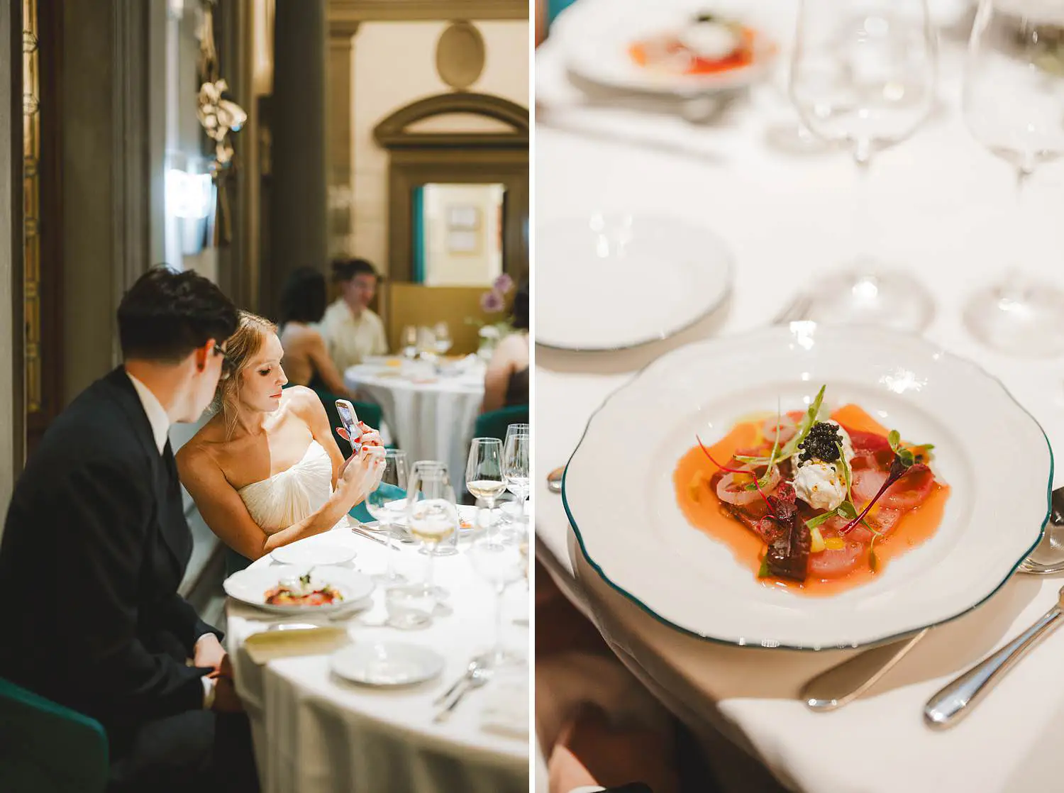Elegant bride and groom photo during rehearsal dinner at Atto di Vito Mollica stellar restaurant in Palazzo Portinari Salviati. Photo by the Italian wedding photographer in Tuscany based in Florence Gabriele Fani