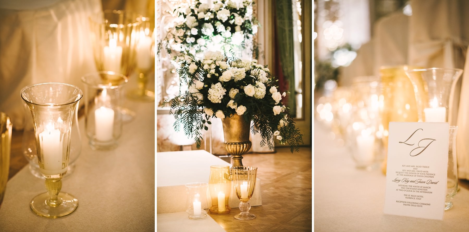 Amazing and elegant destination wedding decor at St. Regis wedding in Florence at Sala delle Feste ballroom. Photo by the Italian elegant and modern wedding photographer in Tuscany based Florence Gabriele Fani