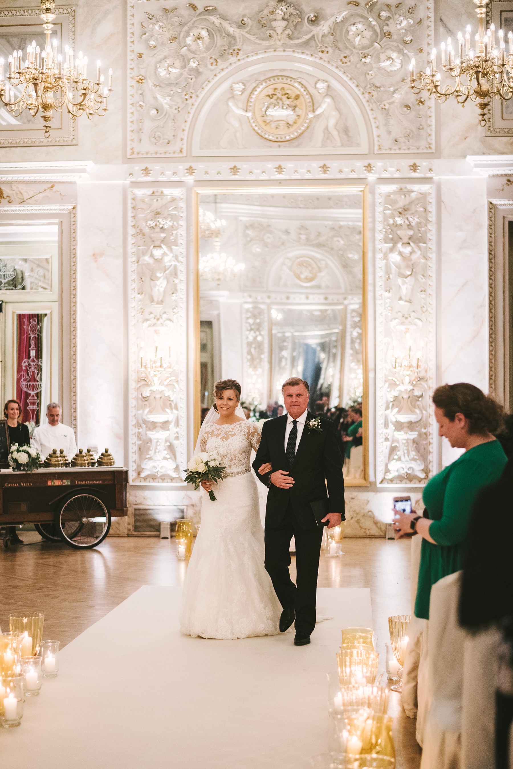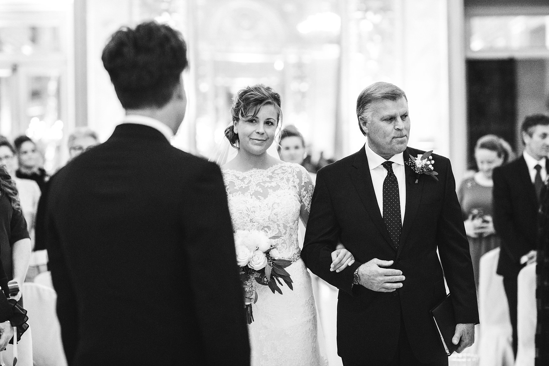 Lovely bride Lacey walks down the aisle at luxury hotel St. Regis Florence intimate destination wedding. Photo by the Italian elegant and modern wedding photographer in Tuscany based Florence Gabriele Fani