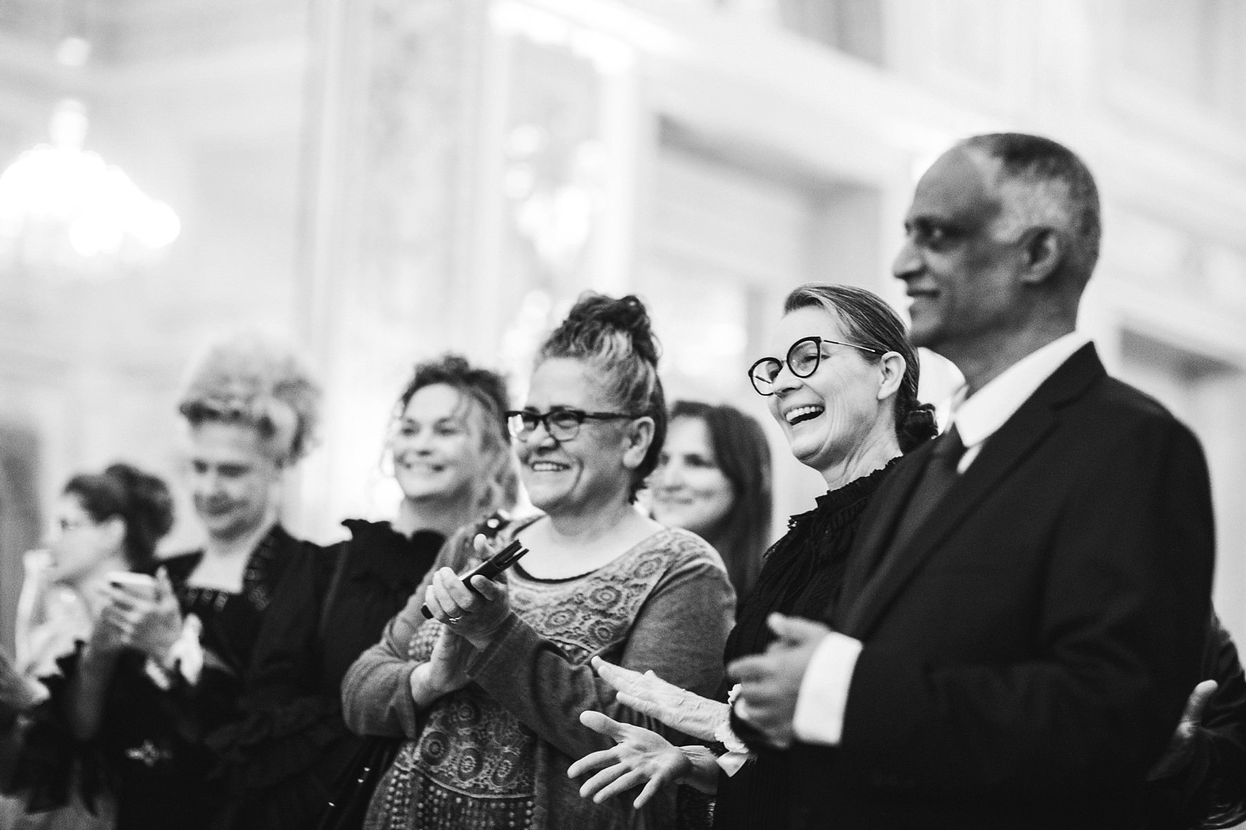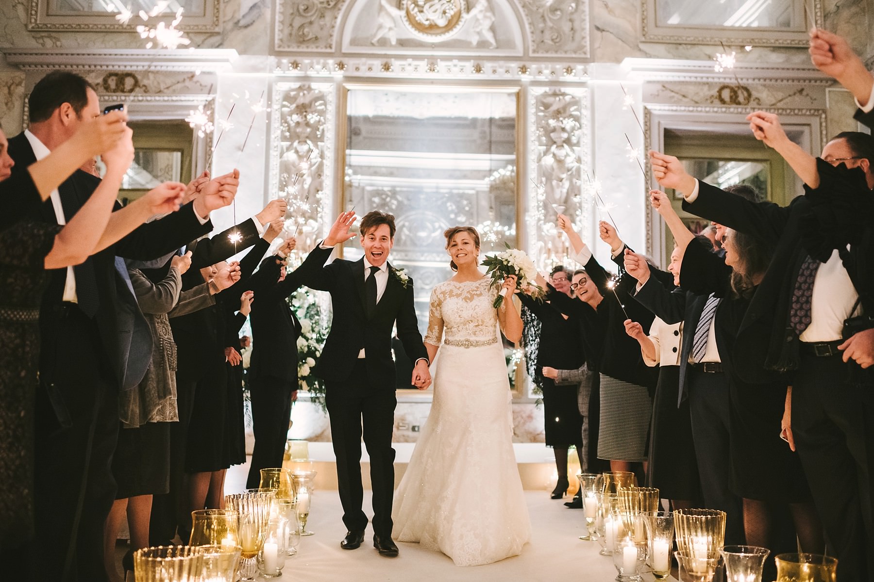Lovely bride and groom are enjoying sparkles with guests into Sala delle Feste ballroom at Hotel St. Regis Florence. Photo by the Italian elegant and modern wedding photographer in Tuscany based Florence Gabriele Fani
