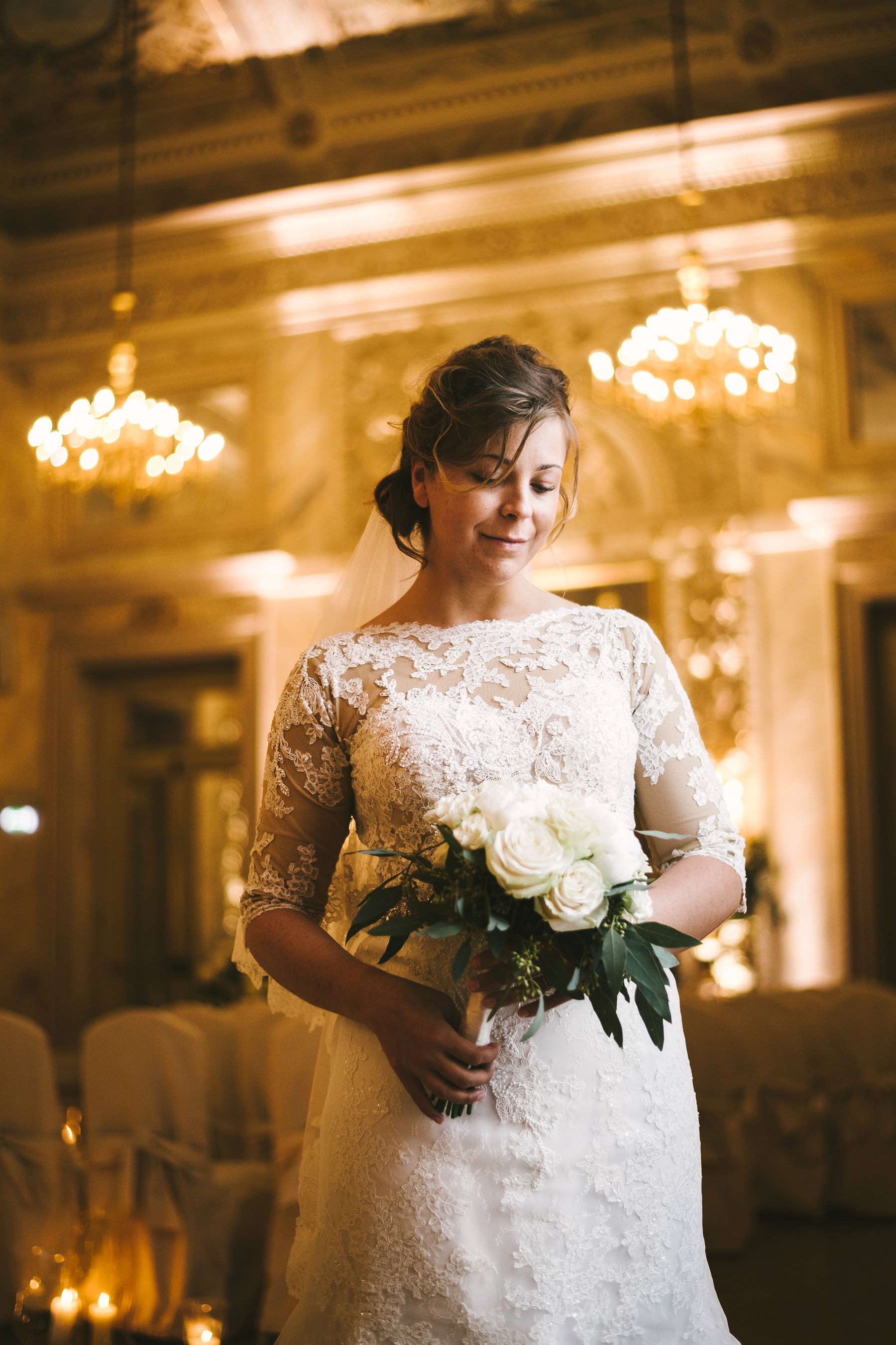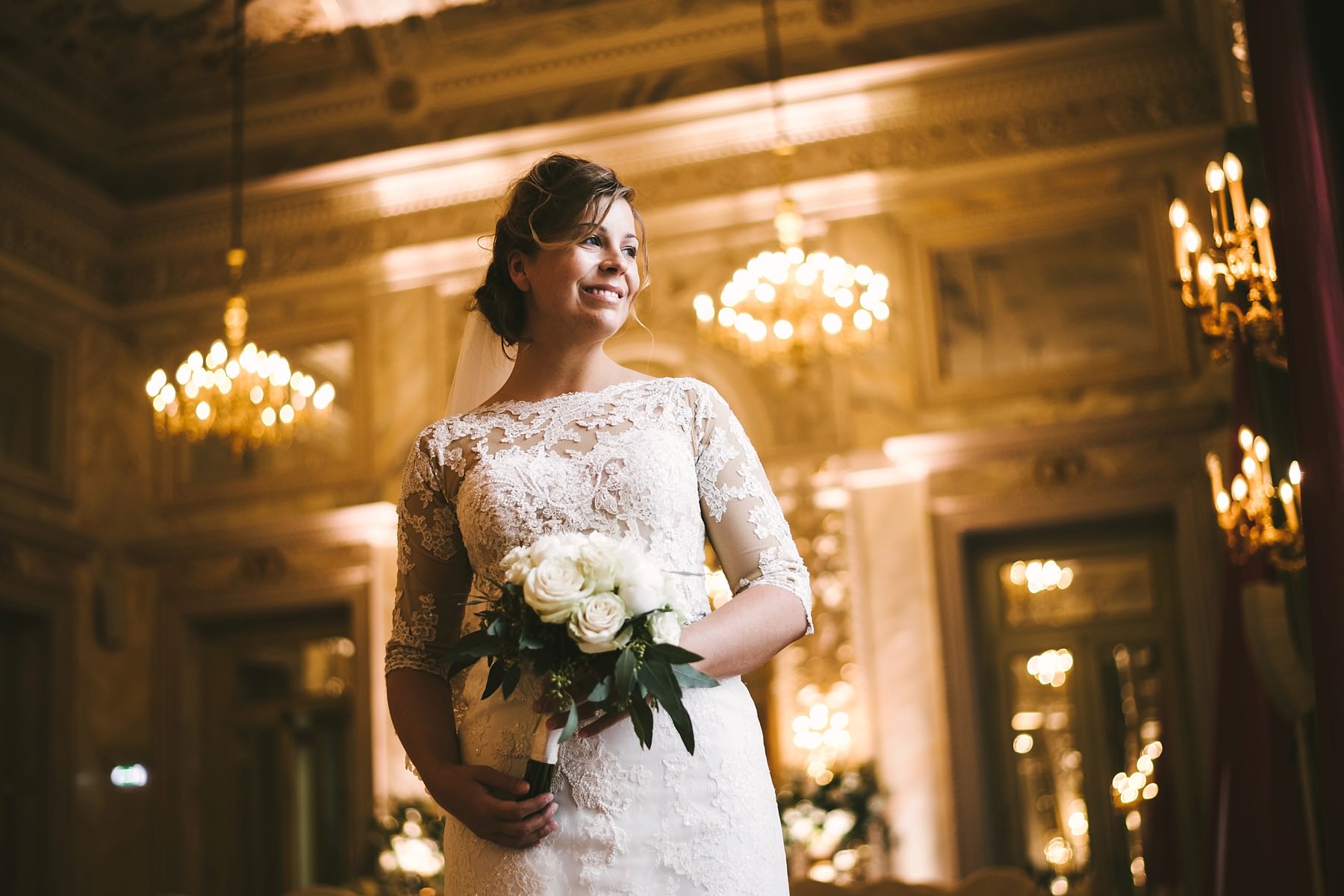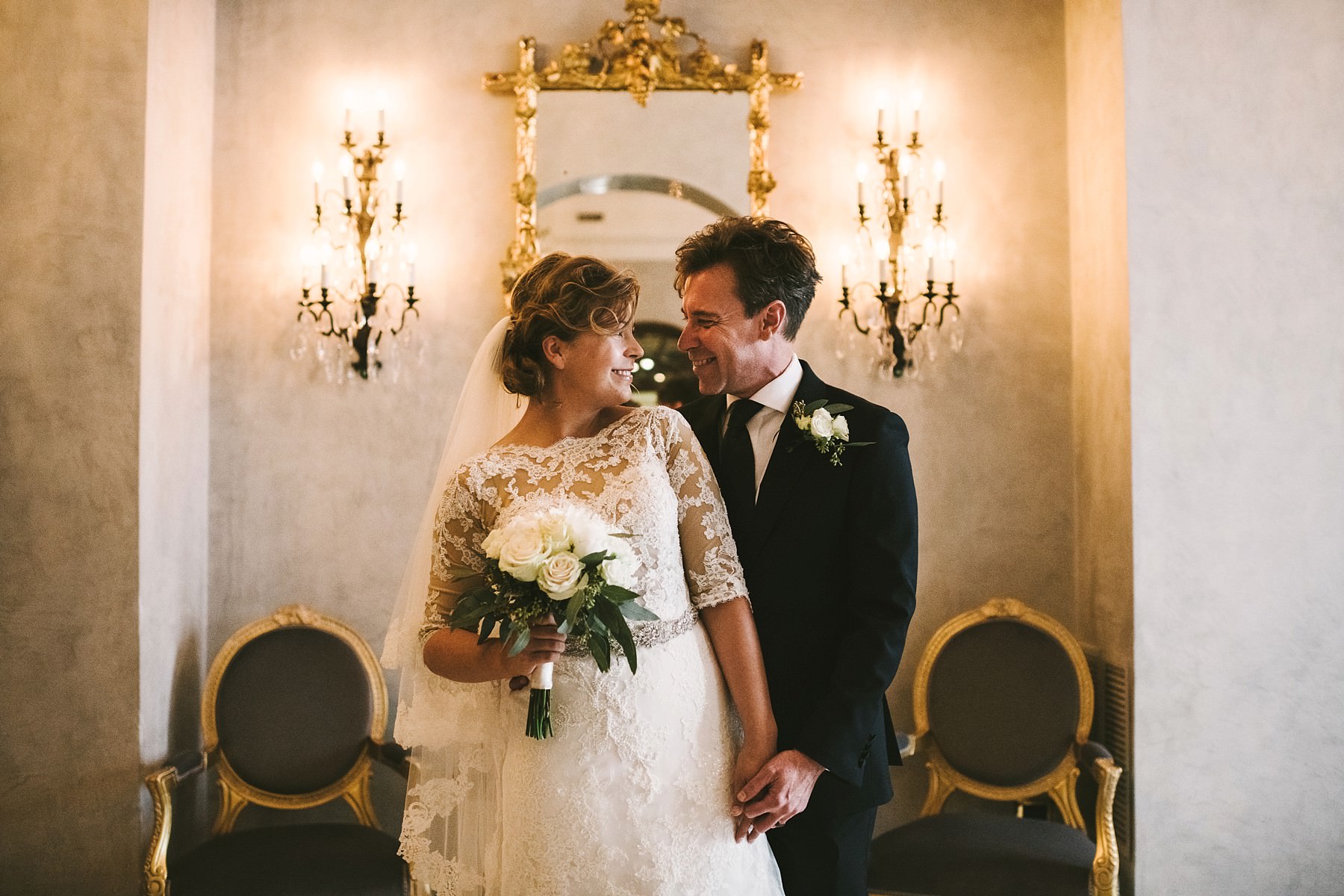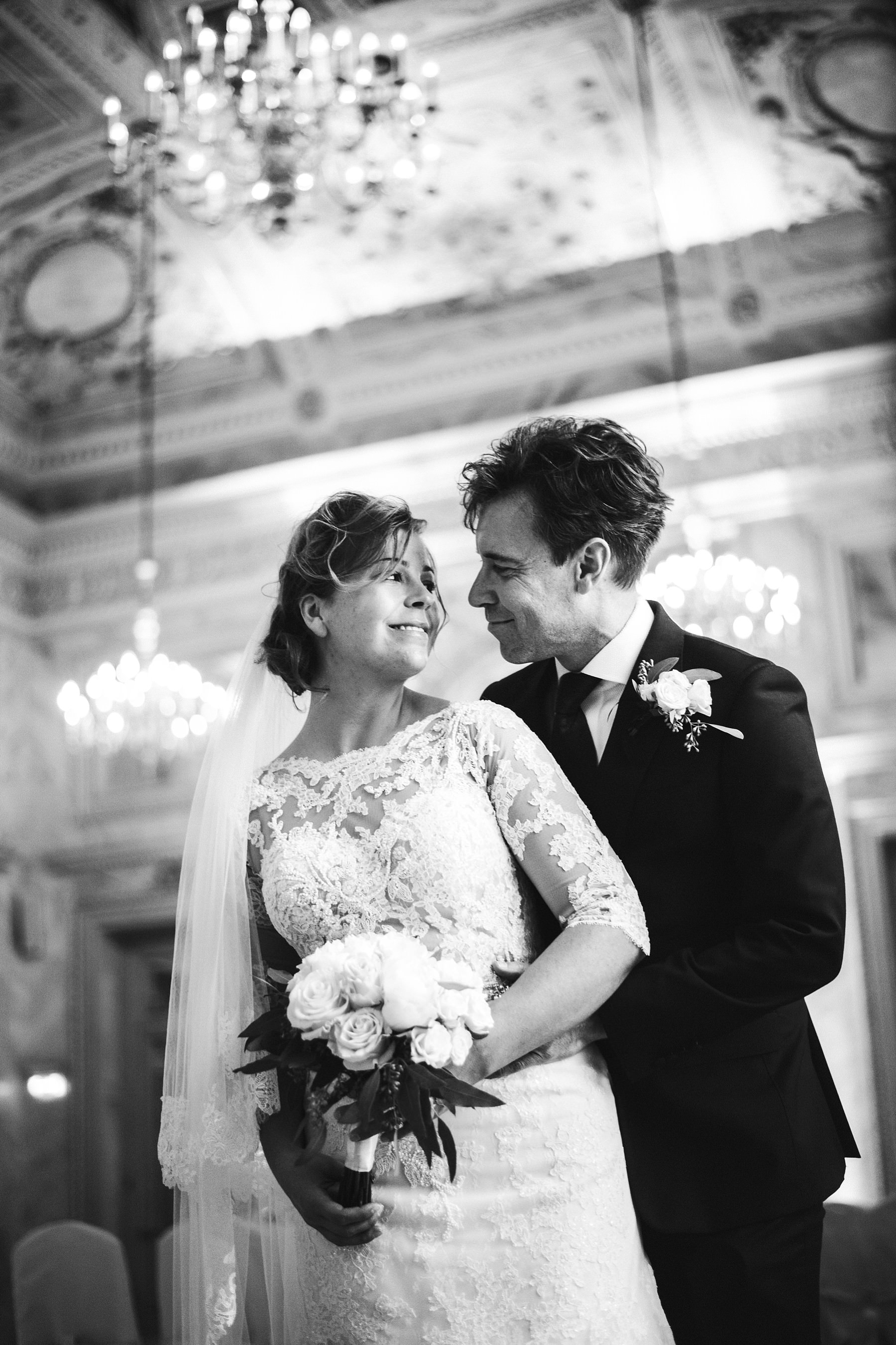 Lovely bride and groom portrait in Sala delle Feste ballroom at luxury hotel St. Regis Florence. Photo by the Italian elegant and modern wedding photographer in Tuscany based Florence Gabriele Fani