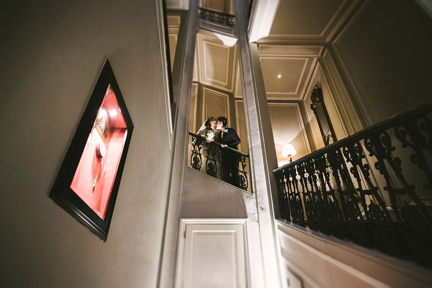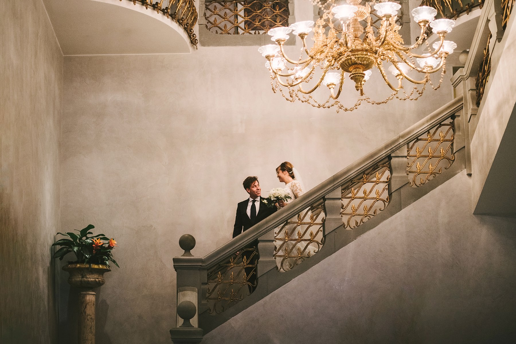 Candid wedding photo with bride and groom walk down the staircase from Sala delle Feste Ballroom at Luxury hotel St. Regis Florence. Photo by the Italian elegant and modern wedding photographer in Tuscany based Florence Gabriele Fani