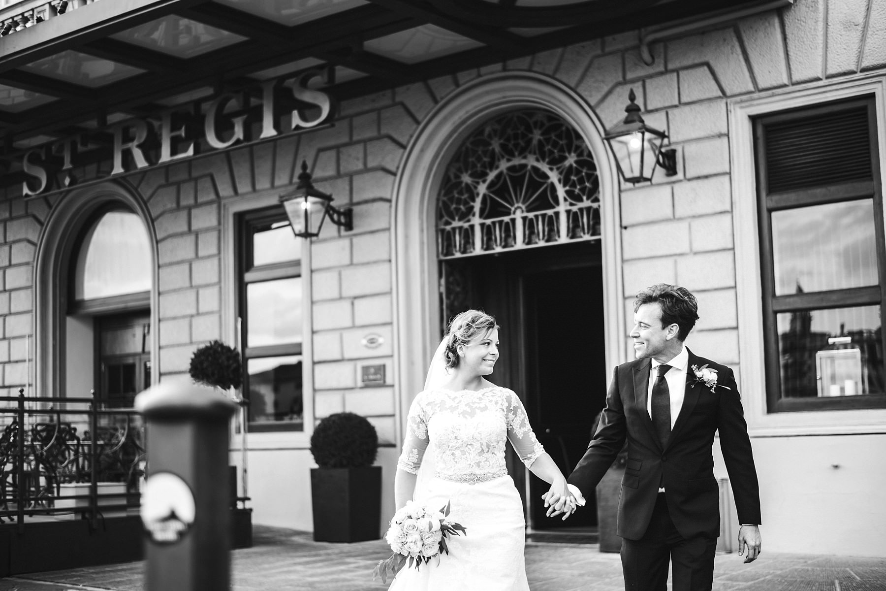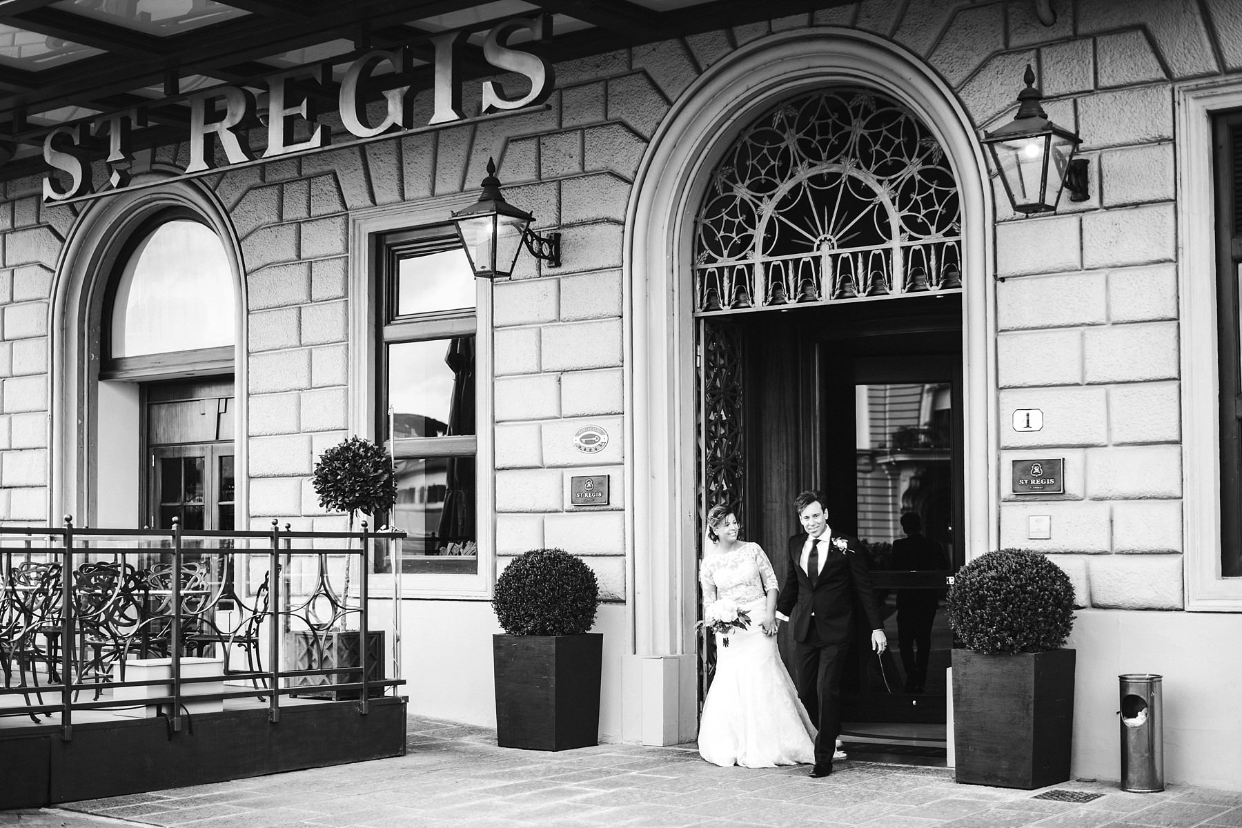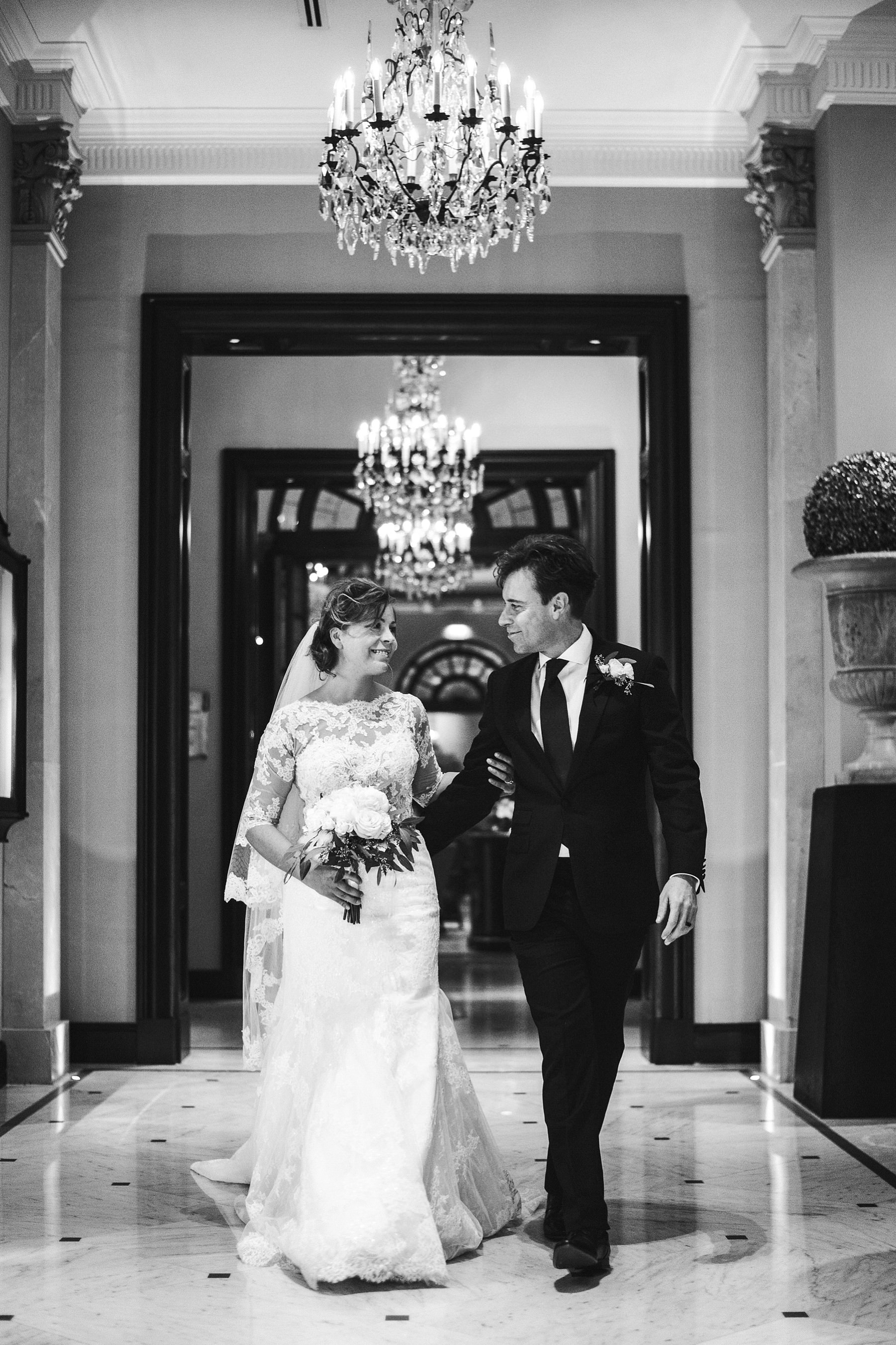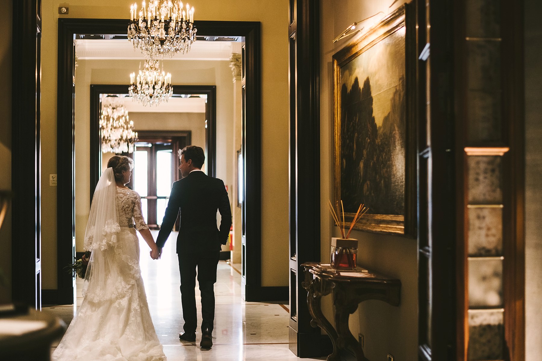 Bride and groom walk away into the luxury hotel St. Regis Florence hall. Photo by the Italian elegant and modern wedding photographer in Tuscany based Florence Gabriele Fani