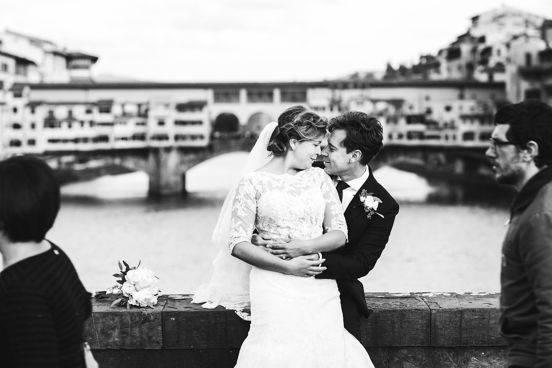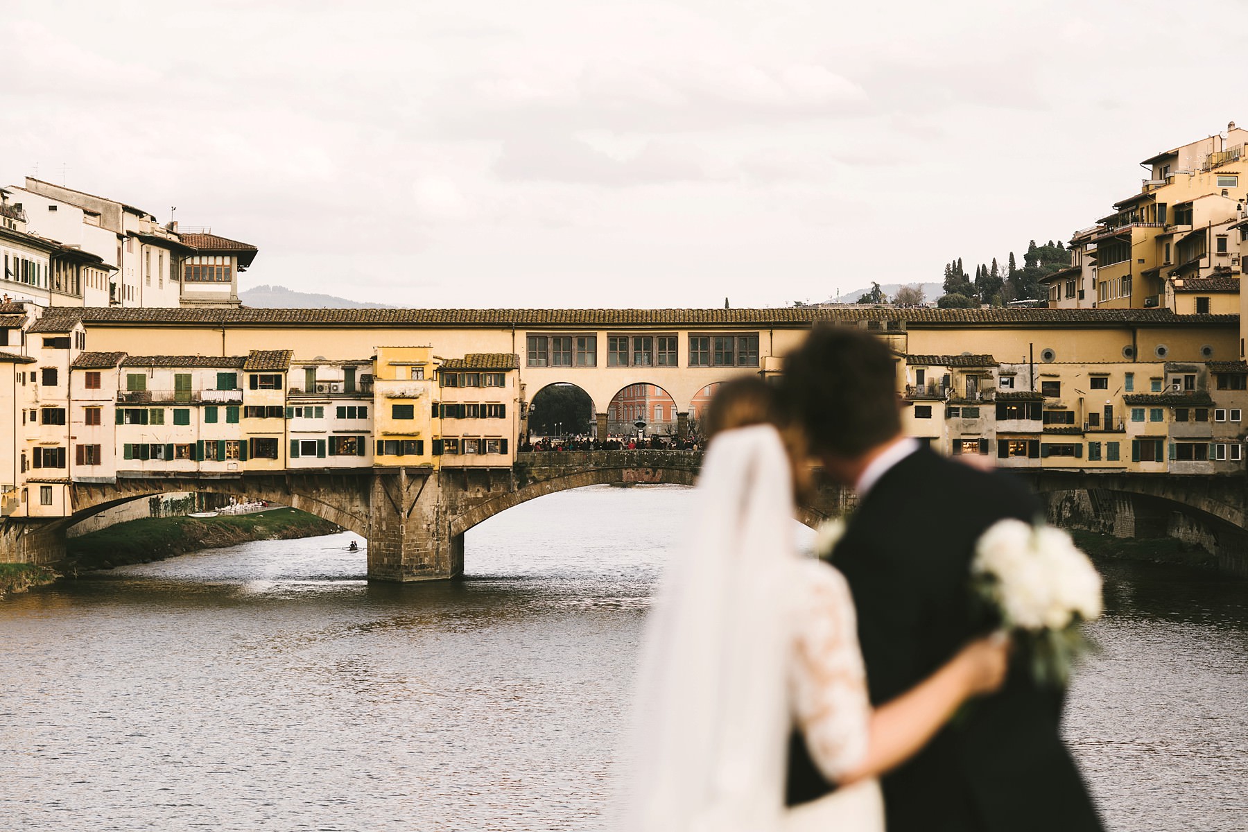 Lovely bride and groom wedding photo at Ponte Vecchio near Uffizi museum. Intimate and elegant destination wedding at luxury hotel St. Regis Florence. Photo by the Italian elegant and modern wedding photographer in Tuscany based Florence Gabriele Fani