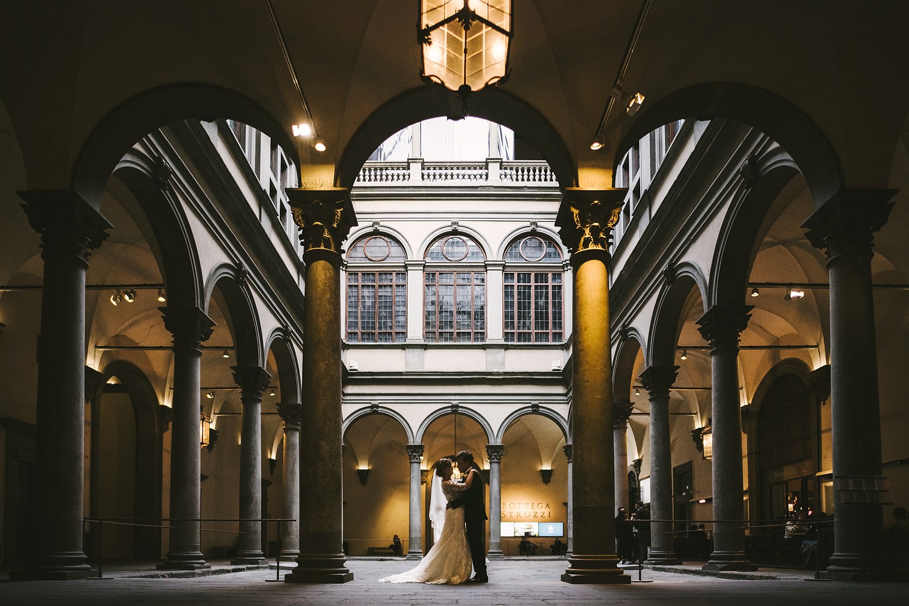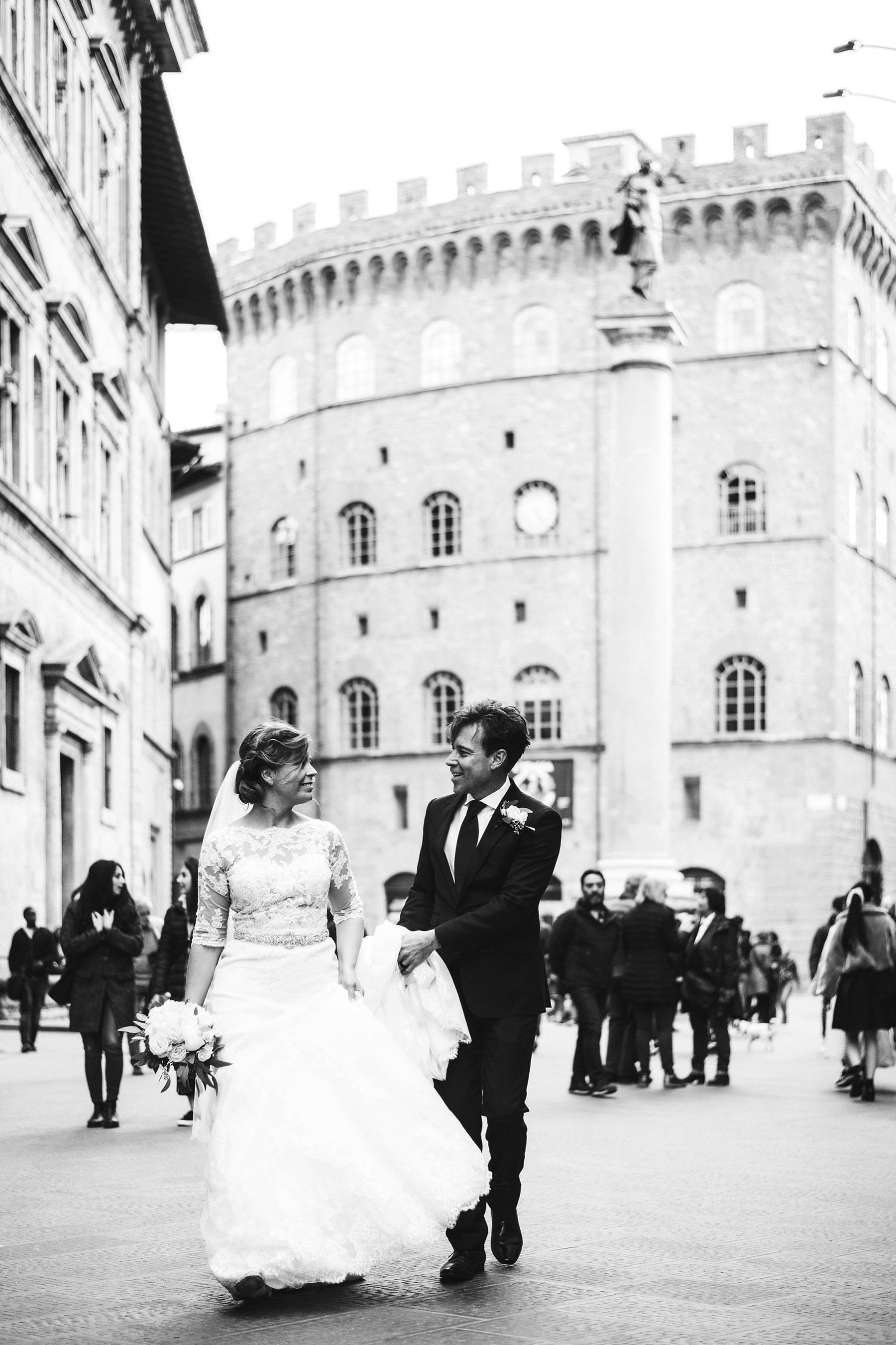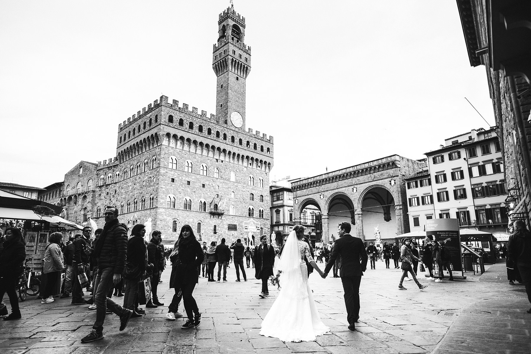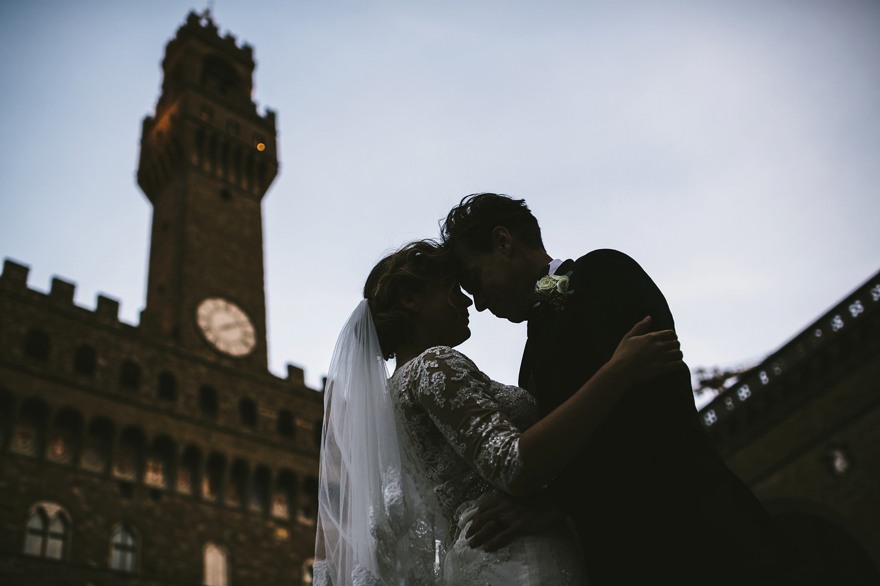 Elegant and intimate wedding photo at Palazzo Vecchio in Piazza della Signoria near Uffizi museum. Intimate and elegant destination wedding at luxury hotel St. Regis Florence. Photo by the Italian elegant and modern wedding photographer in Tuscany based Florence Gabriele Fani