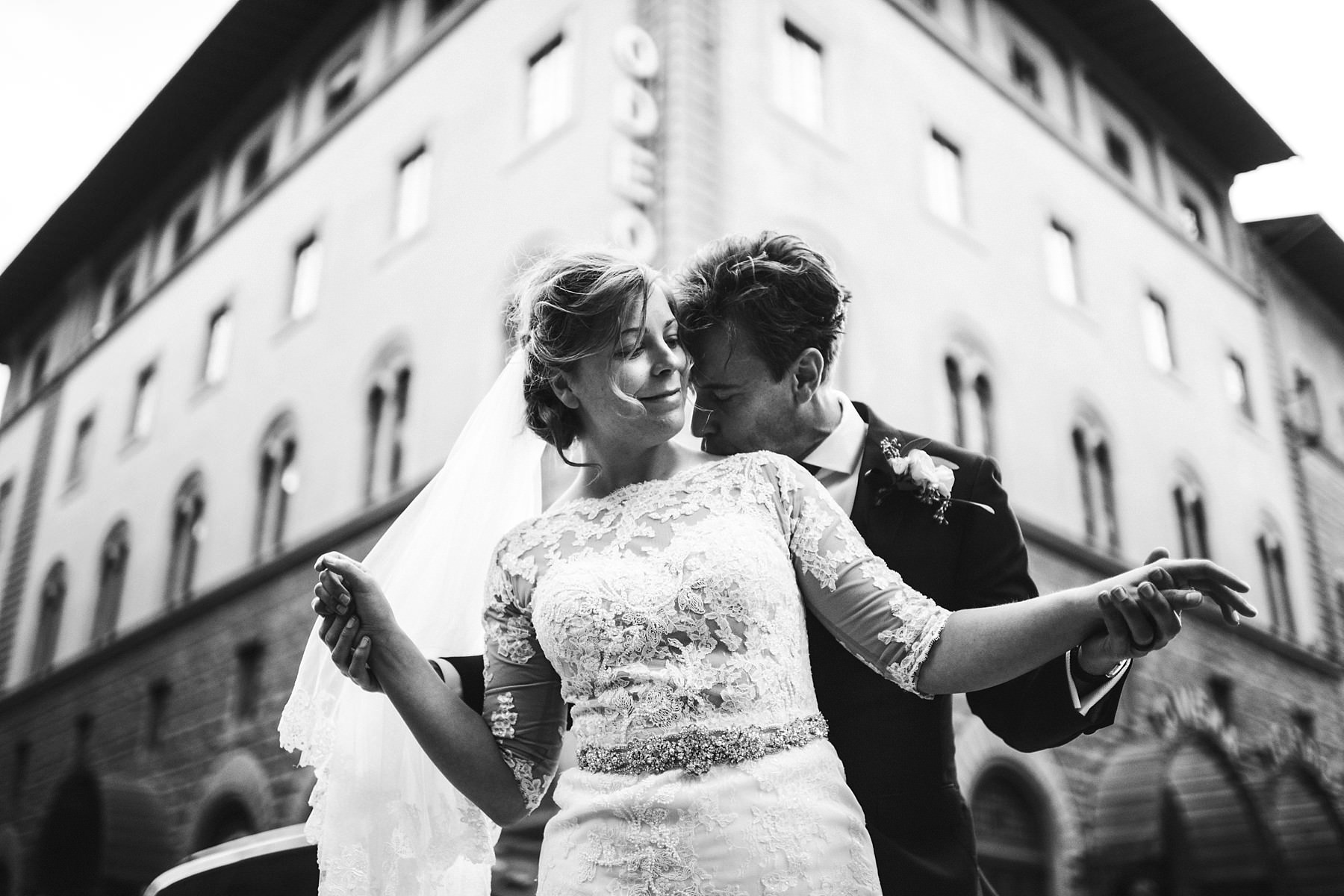 Bride and groom at their intimate wedding in Florence celebrated at the luxury hotel St. Regis. Photo by the Italian elegant and modern wedding photographer in Tuscany based Florence Gabriele Fani