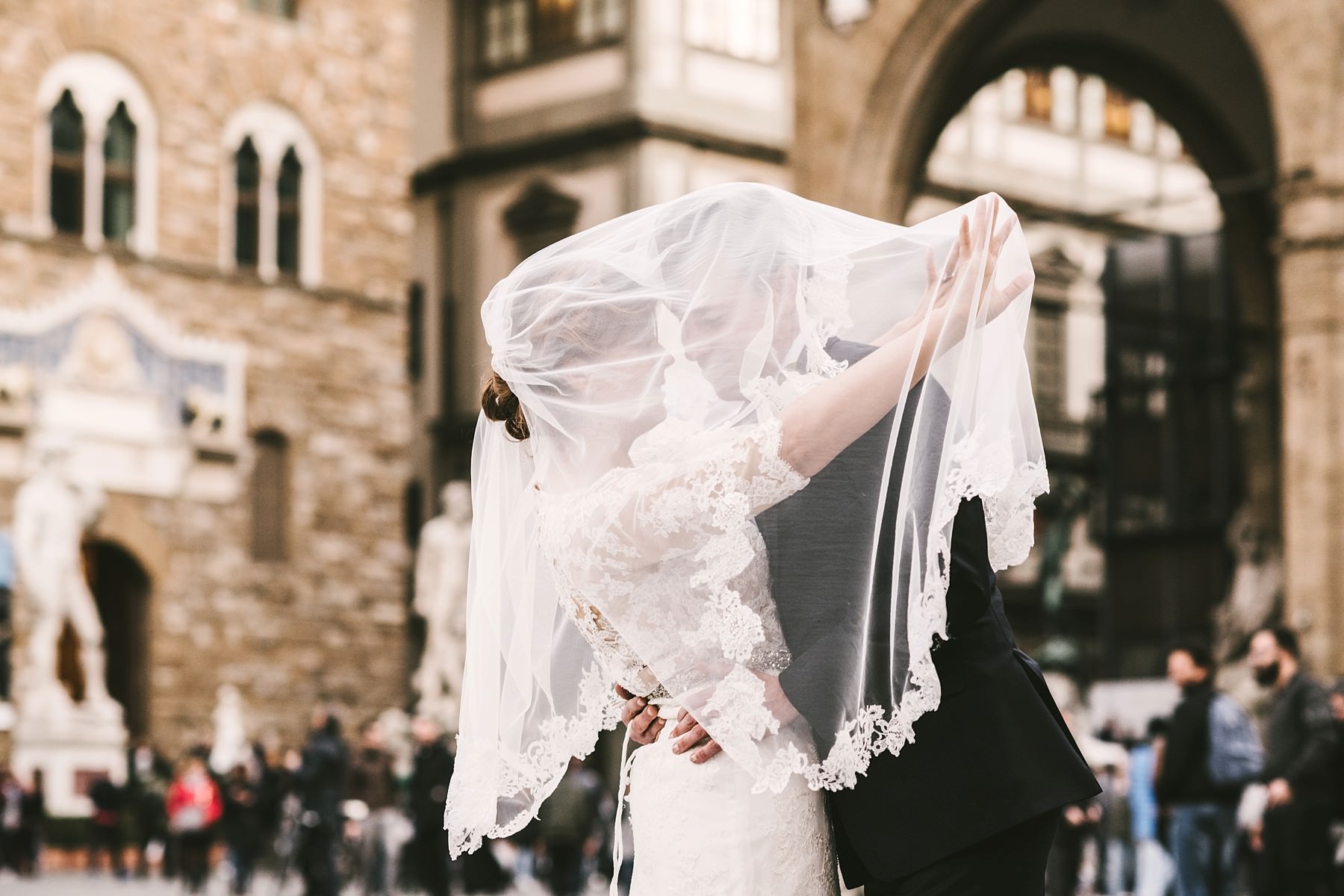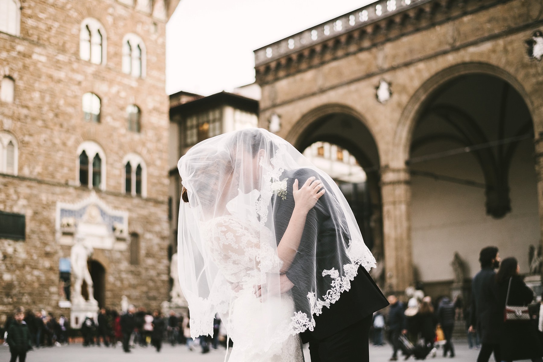 Lovely bride and groom wedding photo at Palazzo Vecchio in Piazza della Signoria near Uffizi museum. Intimate and elegant destination wedding at luxury hotel St. Regis Florence. Photo by the Italian elegant and modern wedding photographer in Tuscany based Florence Gabriele Fani