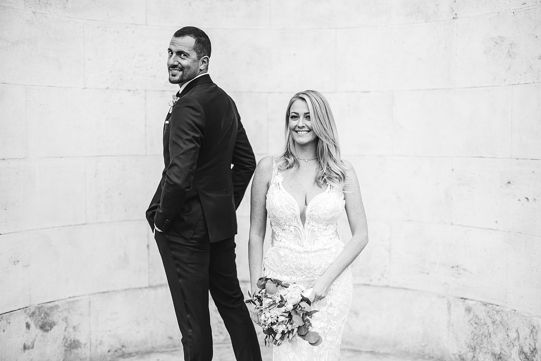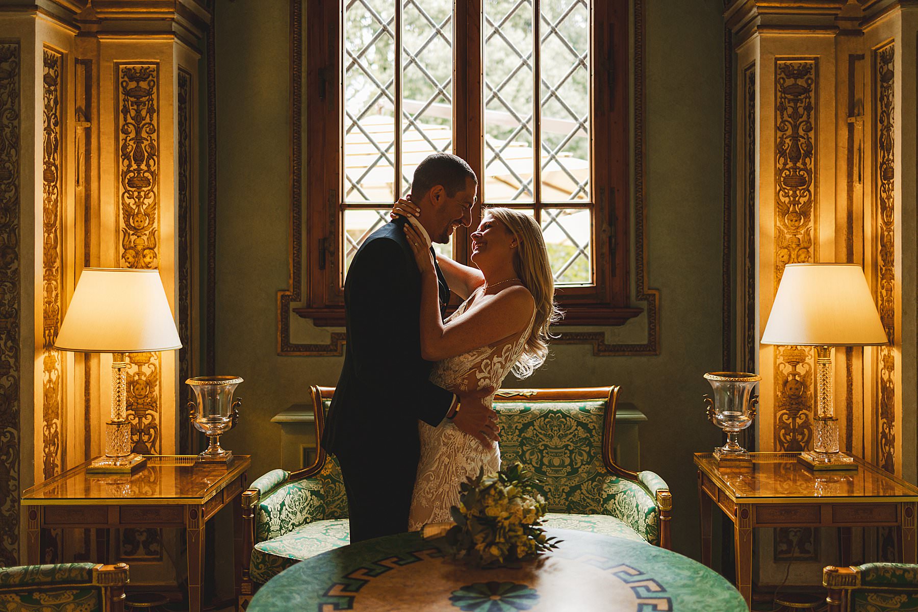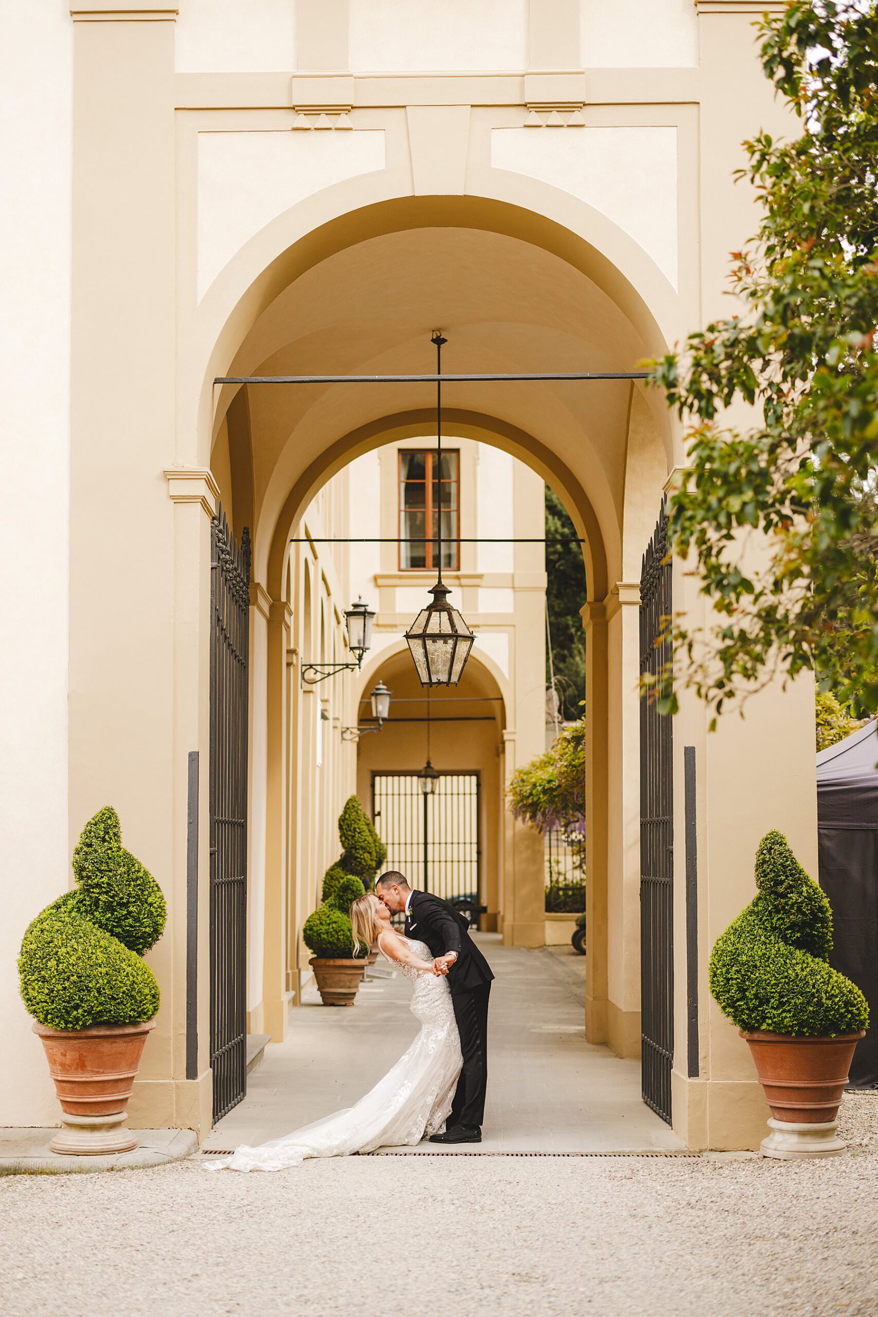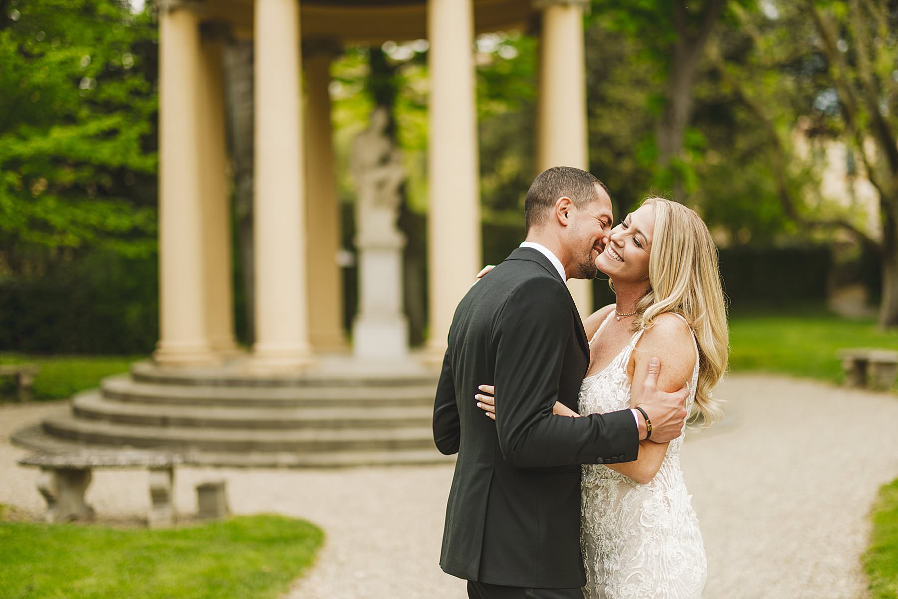 Lovely elopement portrait with bride and groom at luxury Hotel Four Seasons Florence. Photo by the Italian elopement photographer in Tuscany based Florence Gabriele Fani.
