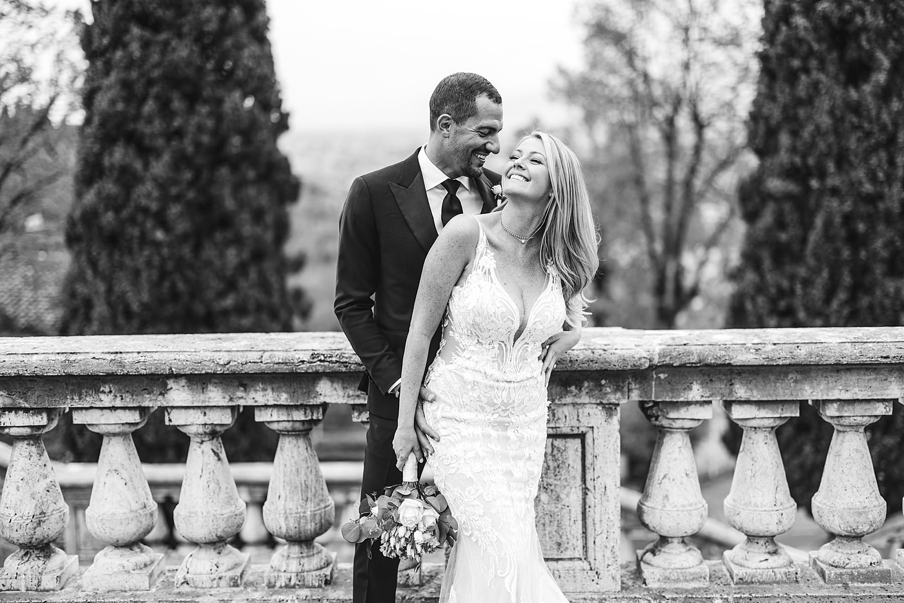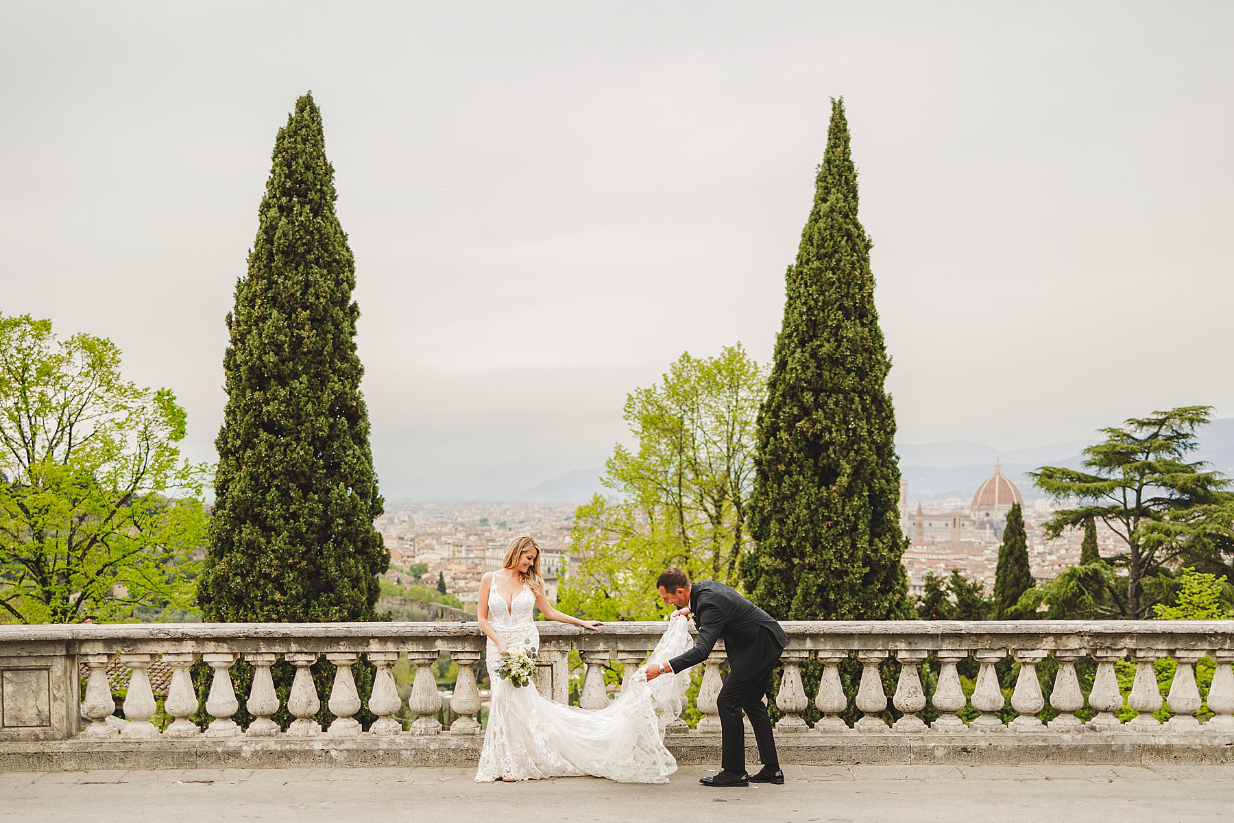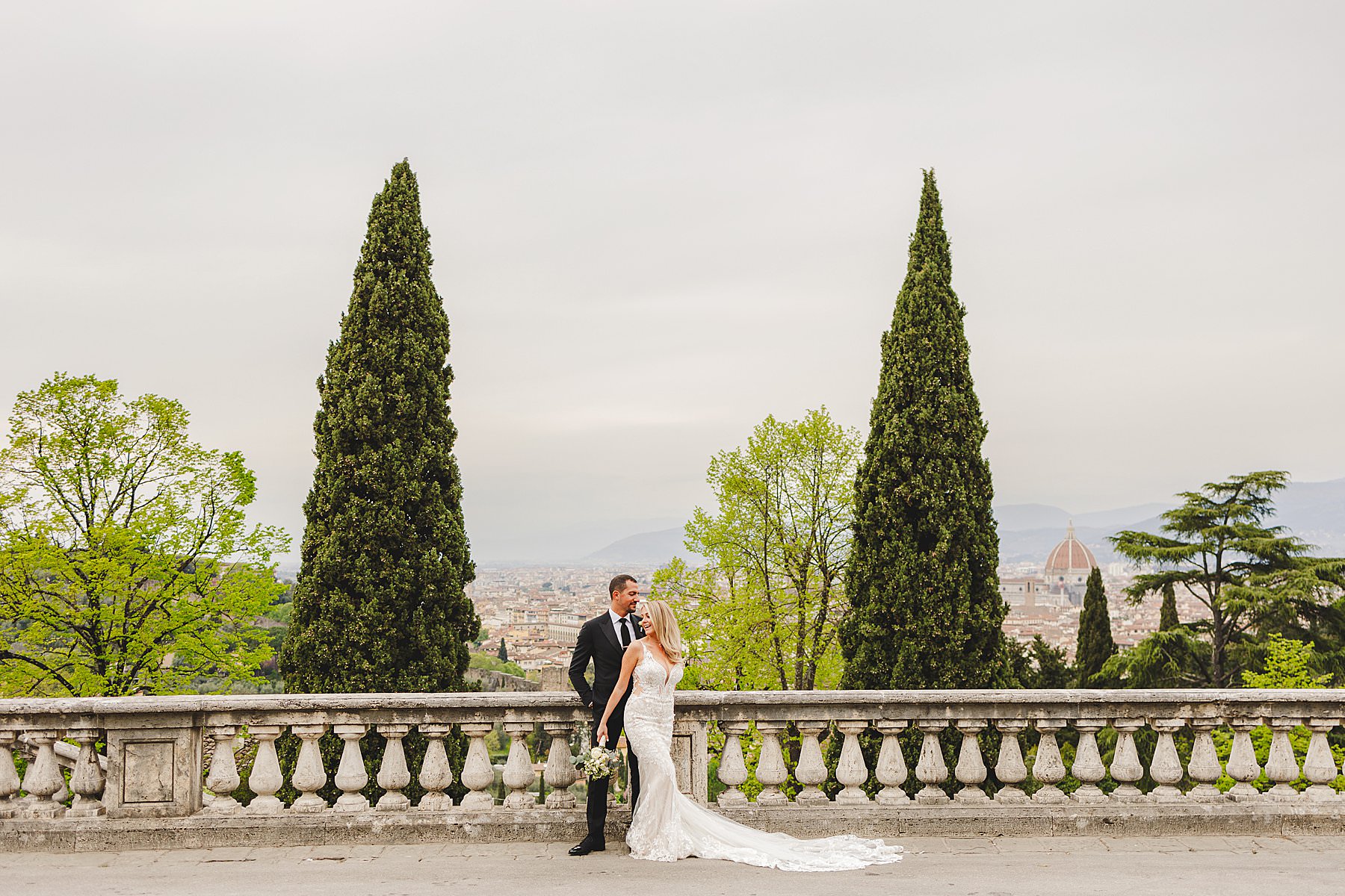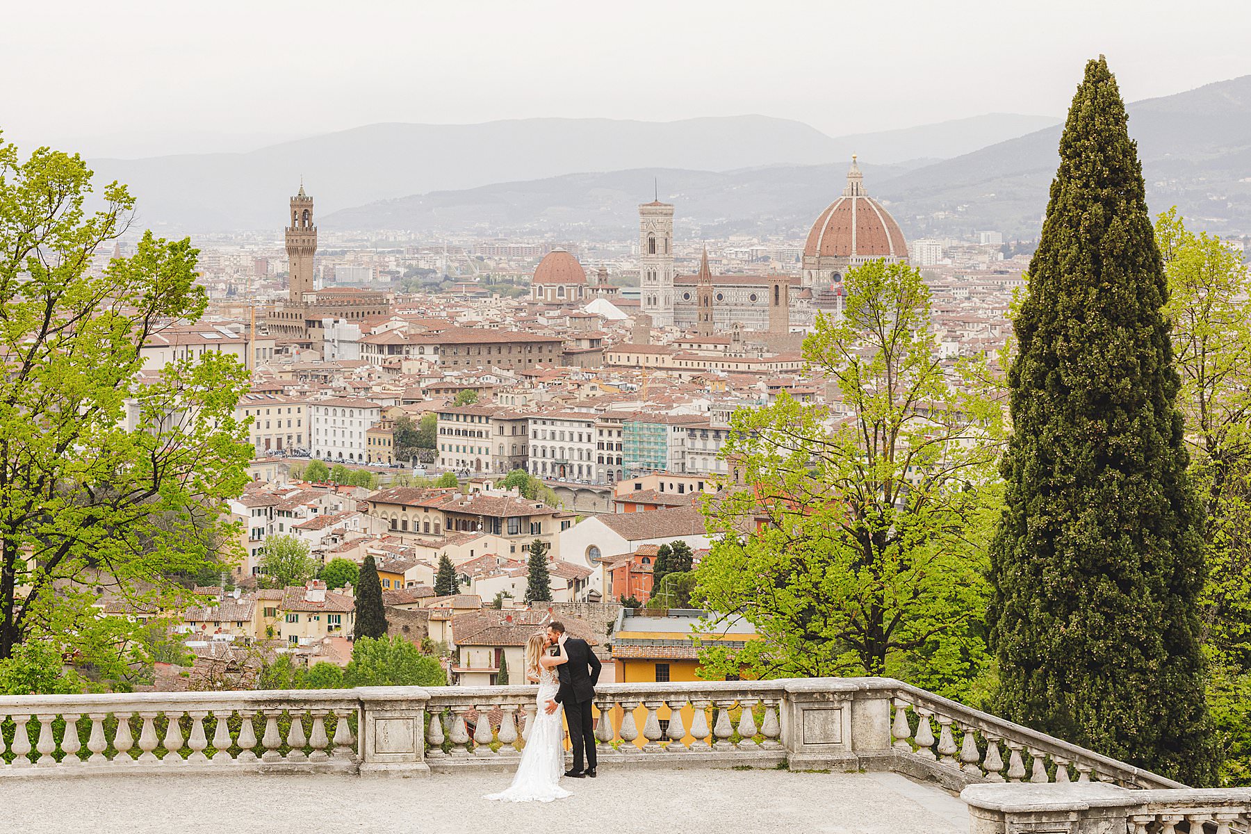 Bride and groom elopement photo at San Miniato al Monte, the most breathtaking panoramic point in Florence. Photo by the Italian elopement photographer in Tuscany based Florence Gabriele Fani.