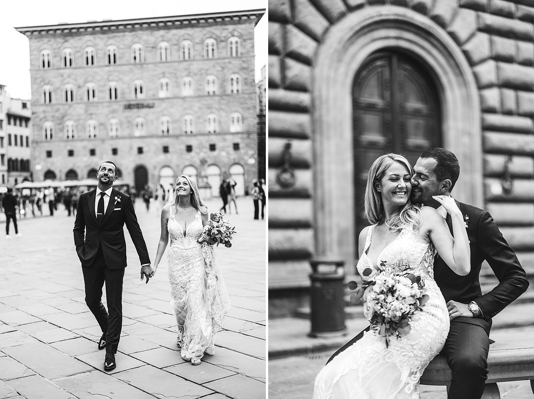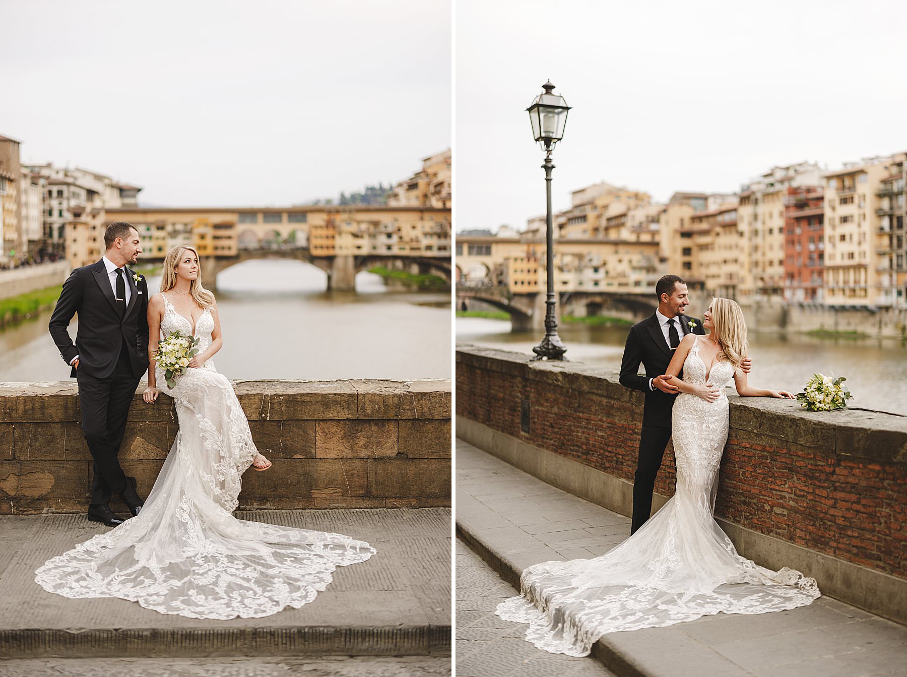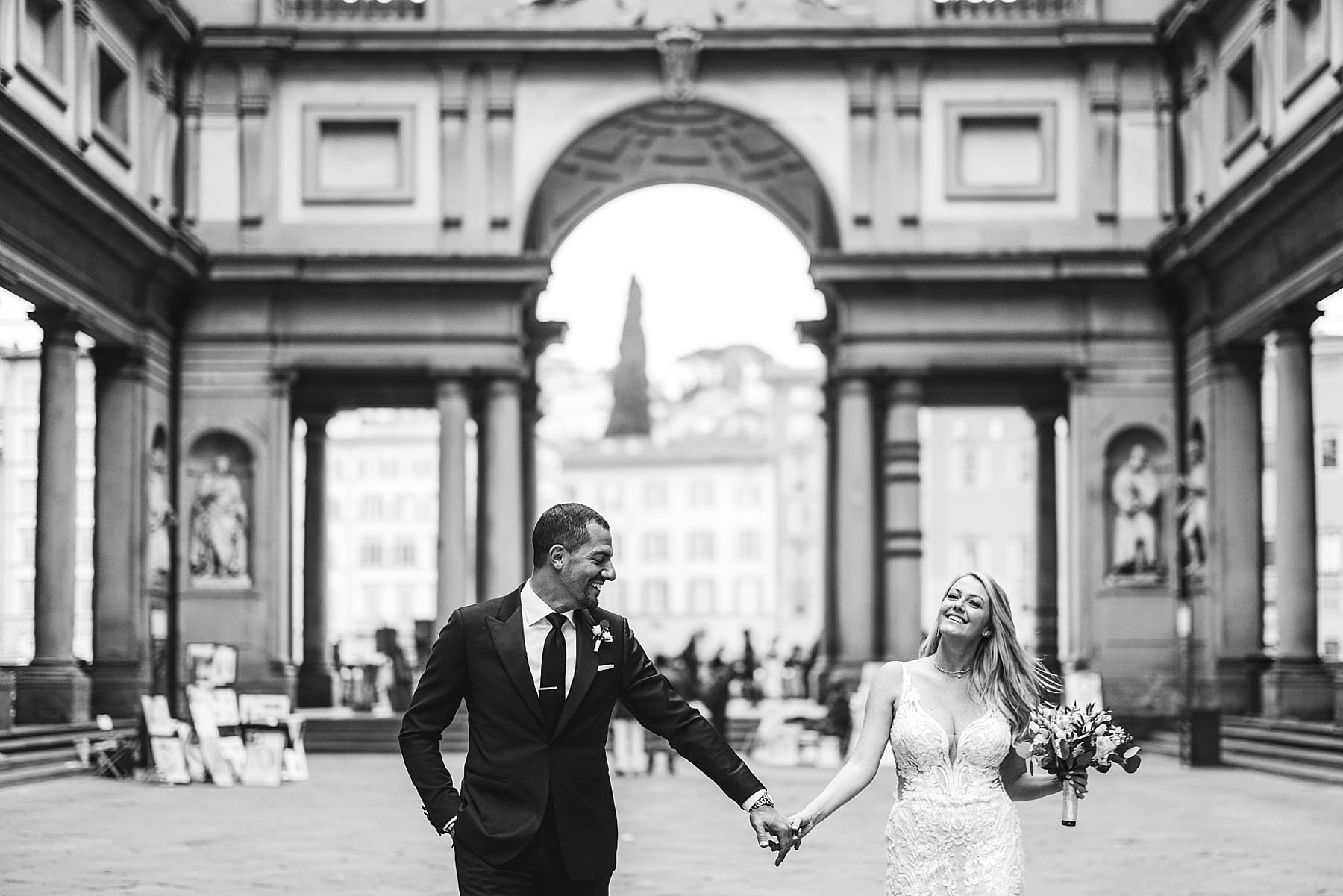 To get the most out of their elopement wedding, Stephanie and John hired a private driver who would take them all around Florence. The second part of the shooting, then, started at San Miniato al Monte, the most breathtaking panoramic point in the city, and continued in the beating heart of it. Palazzo Vecchio, the iconic Ponte Vecchio, the Arno riverbank, the Uffizi Gallery, and Piazza San Firenze were the perfect backgrounds for some timeless couple portraits.