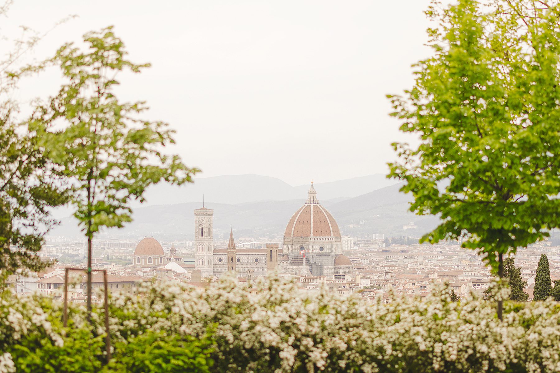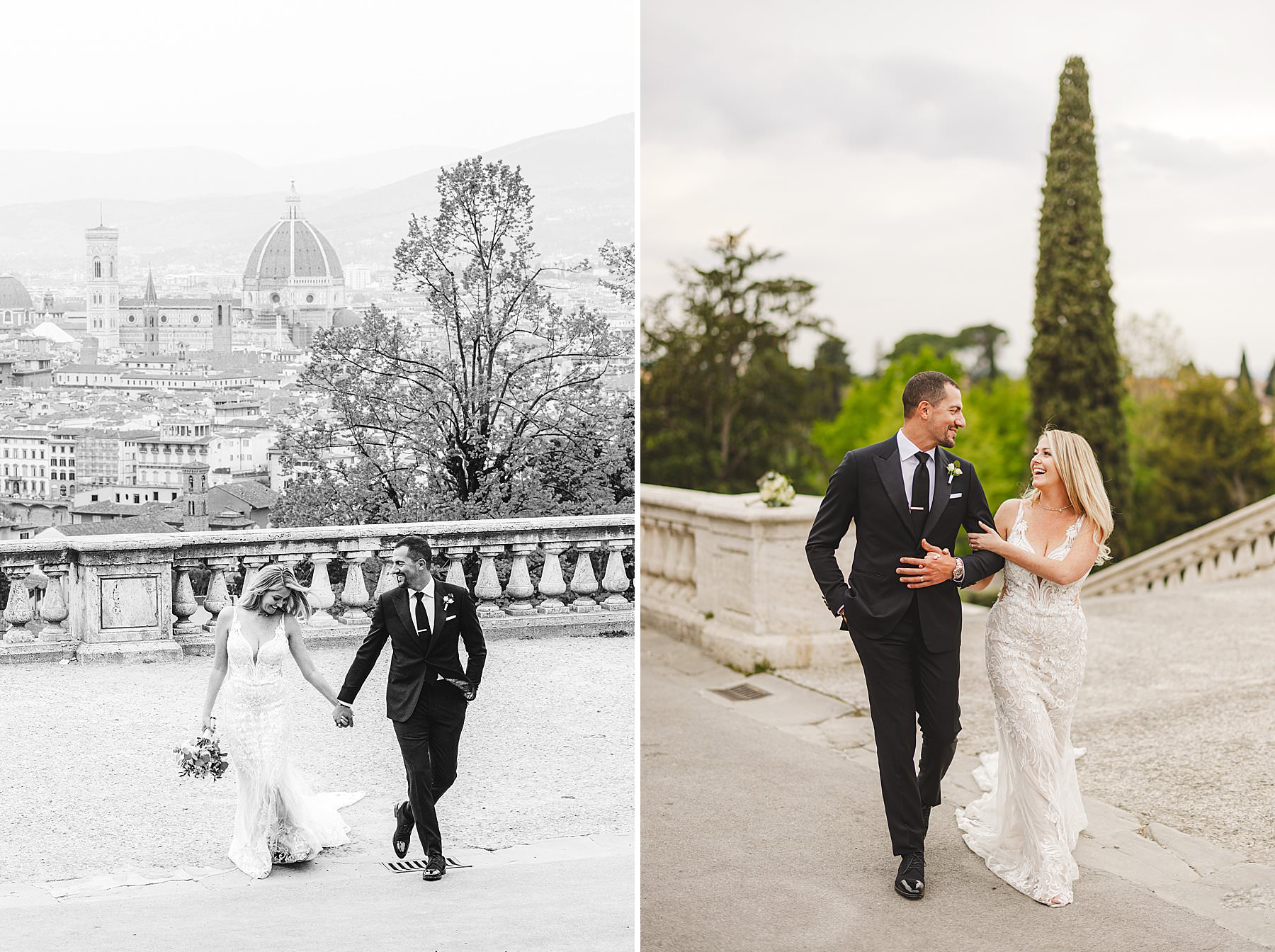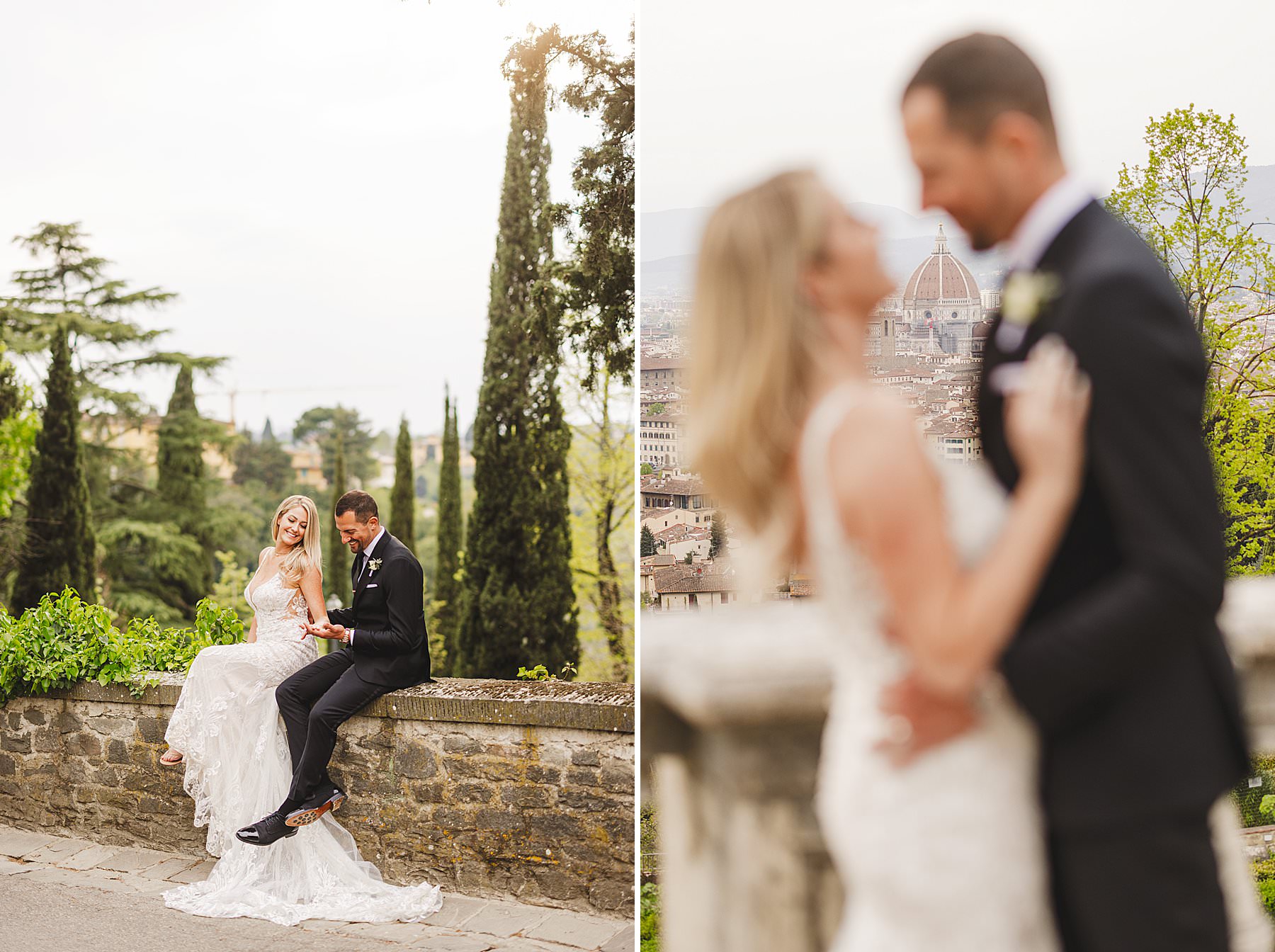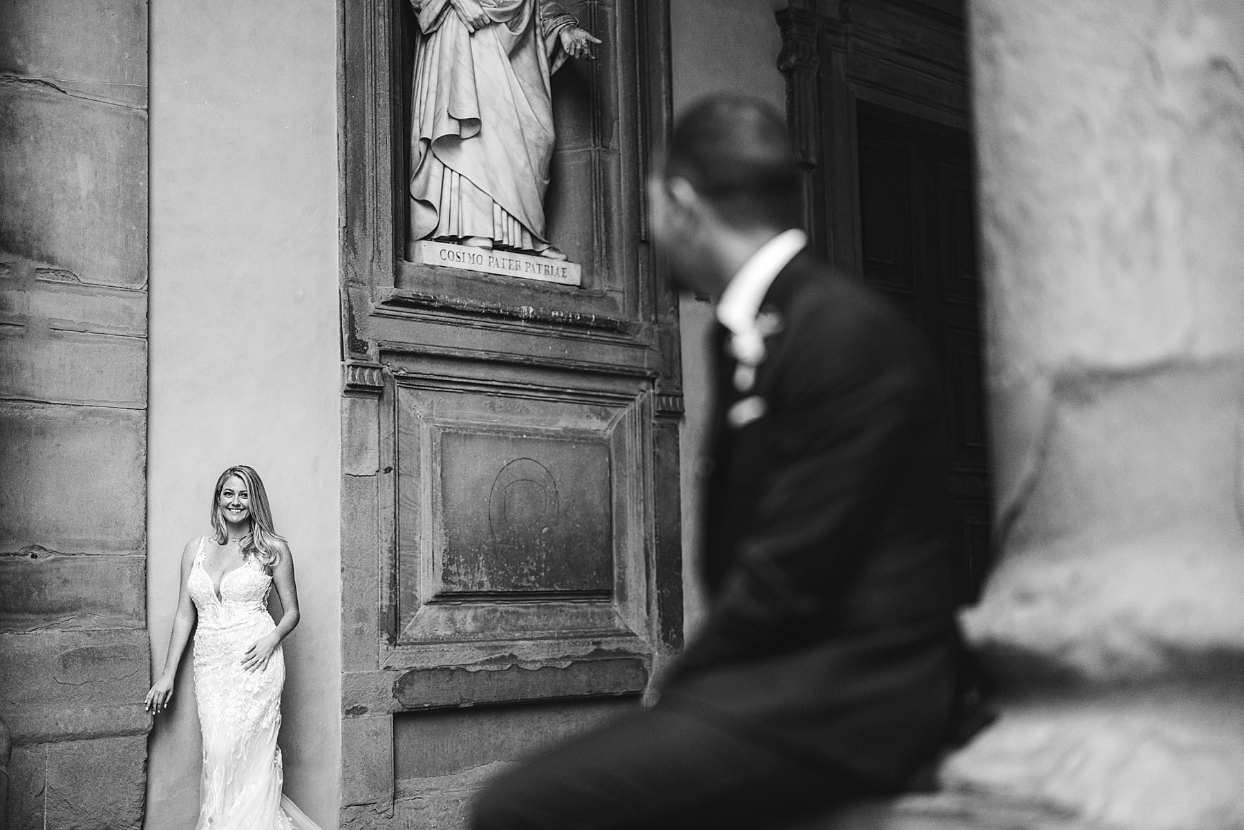 To get the most out of their elopement wedding, Stephanie and John hired a private driver who would take them all around Florence. The second part of the shooting, then, started at San Miniato al Monte, the most breathtaking panoramic point in the city, and continued in the beating heart of it. Palazzo Vecchio, the iconic Ponte Vecchio, the Arno riverbank, the Uffizi Gallery, and Piazza San Firenze were the perfect backgrounds for some timeless couple portraits.