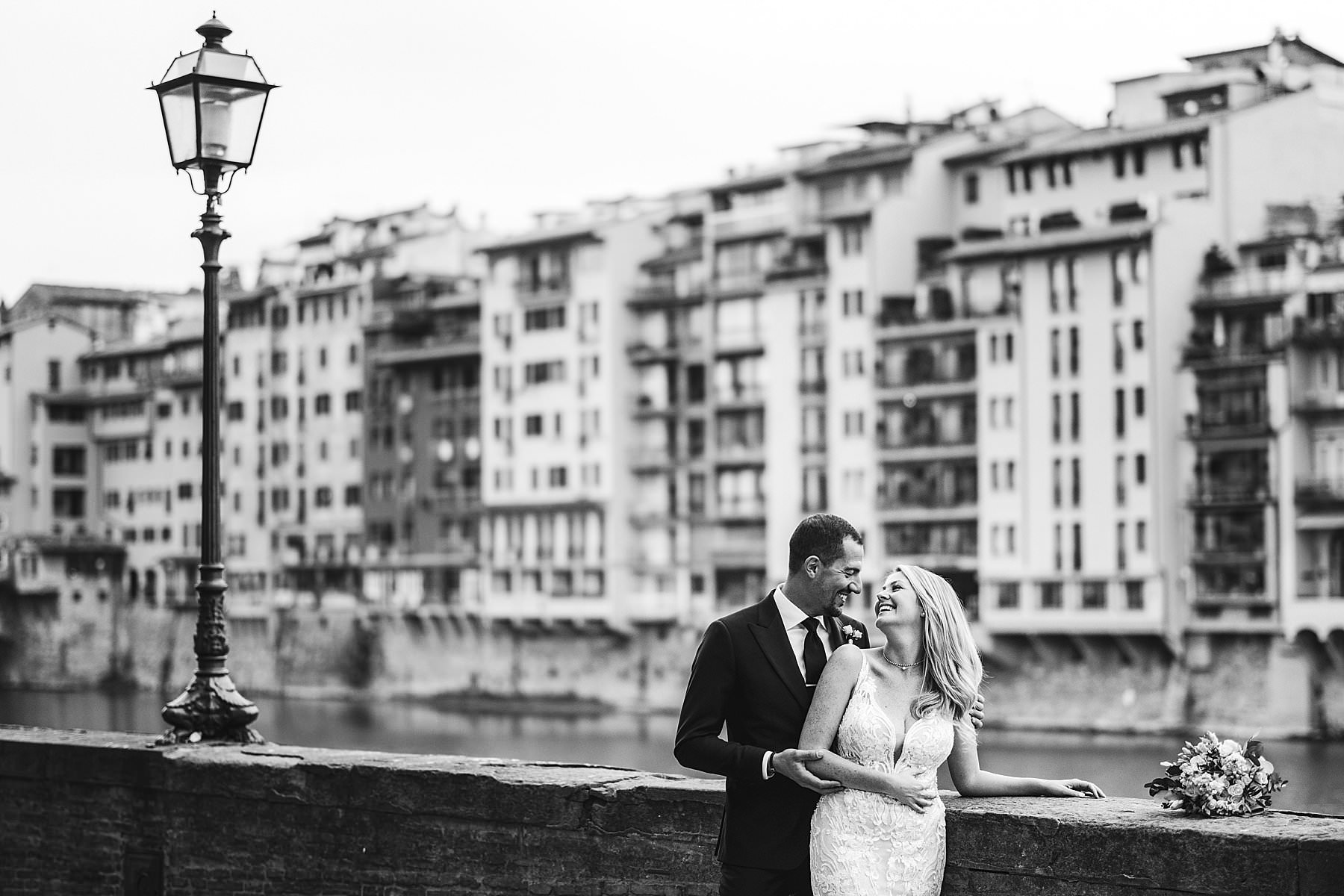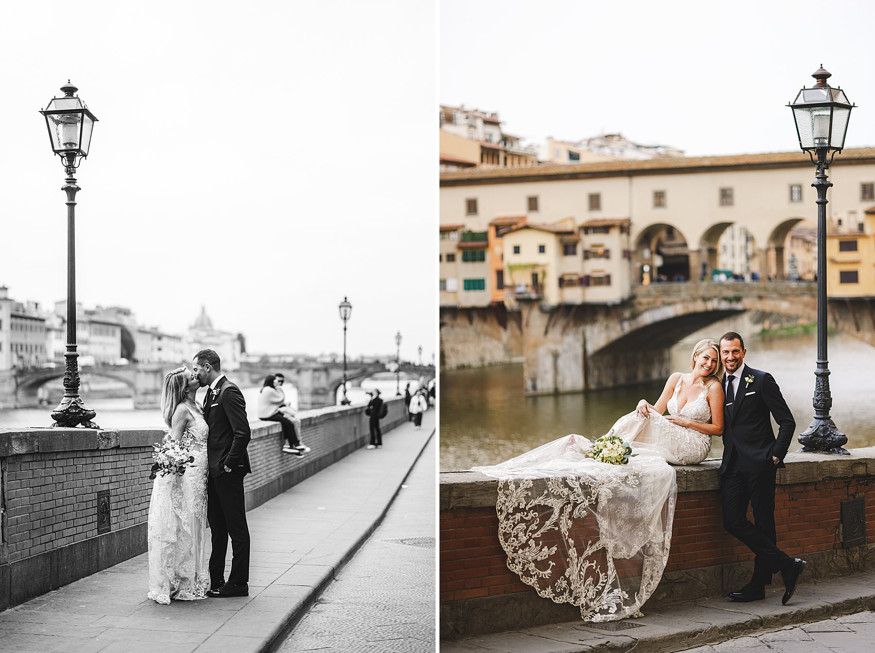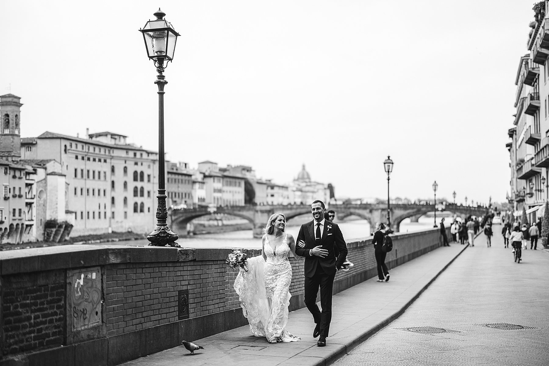 Bride and groom photo tour around the heart of Florence near most iconic Ponte Vecchio. Photo by the Italian elopement photographer in Tuscany based Florence Gabriele Fani.