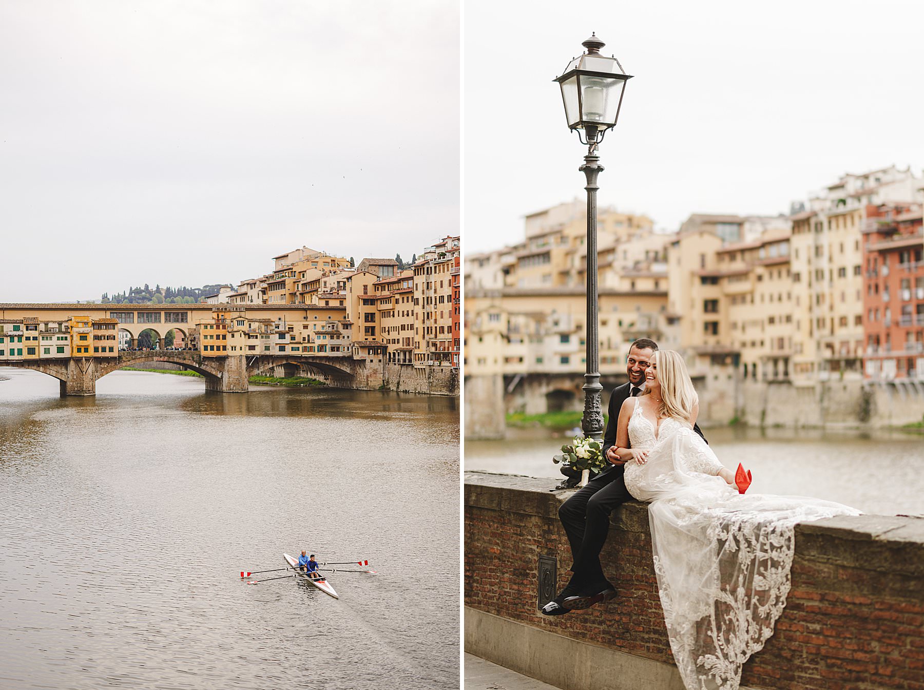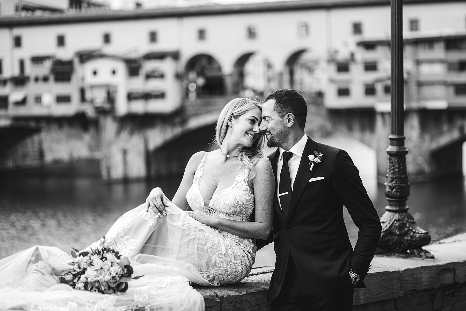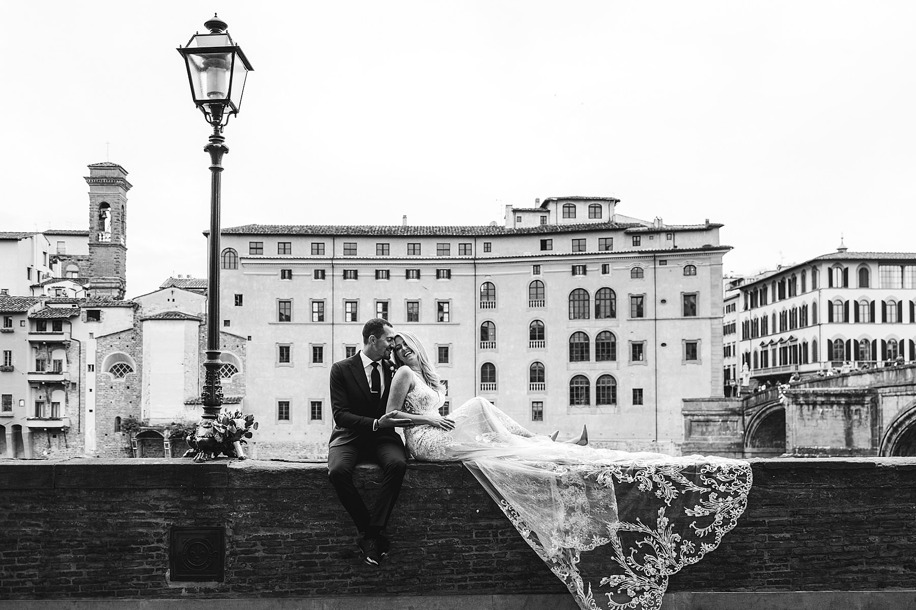 Bride and groom photo tour around the heart of Florence near most iconic Ponte Vecchio. Photo by the Italian elopement photographer in Tuscany based Florence Gabriele Fani.