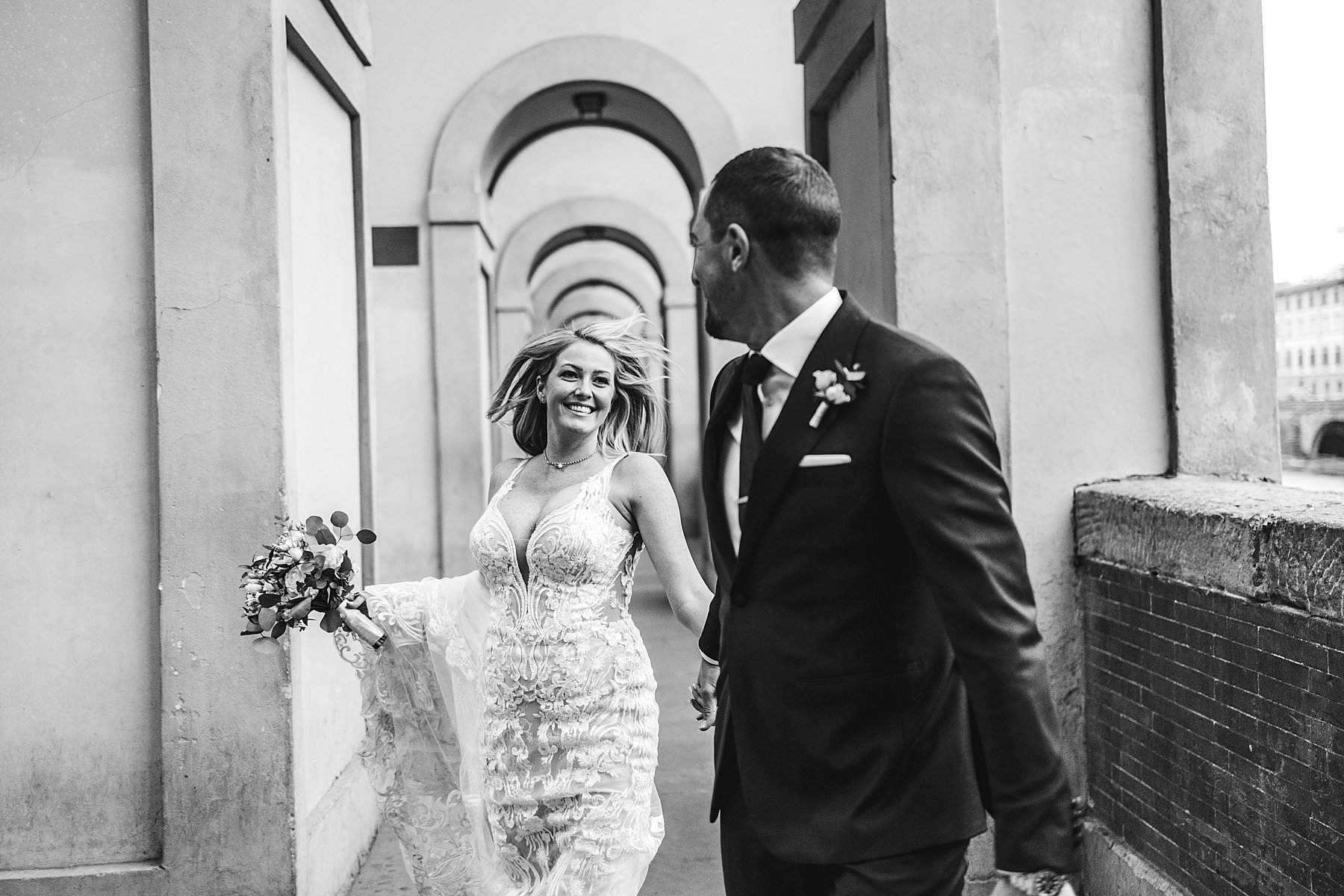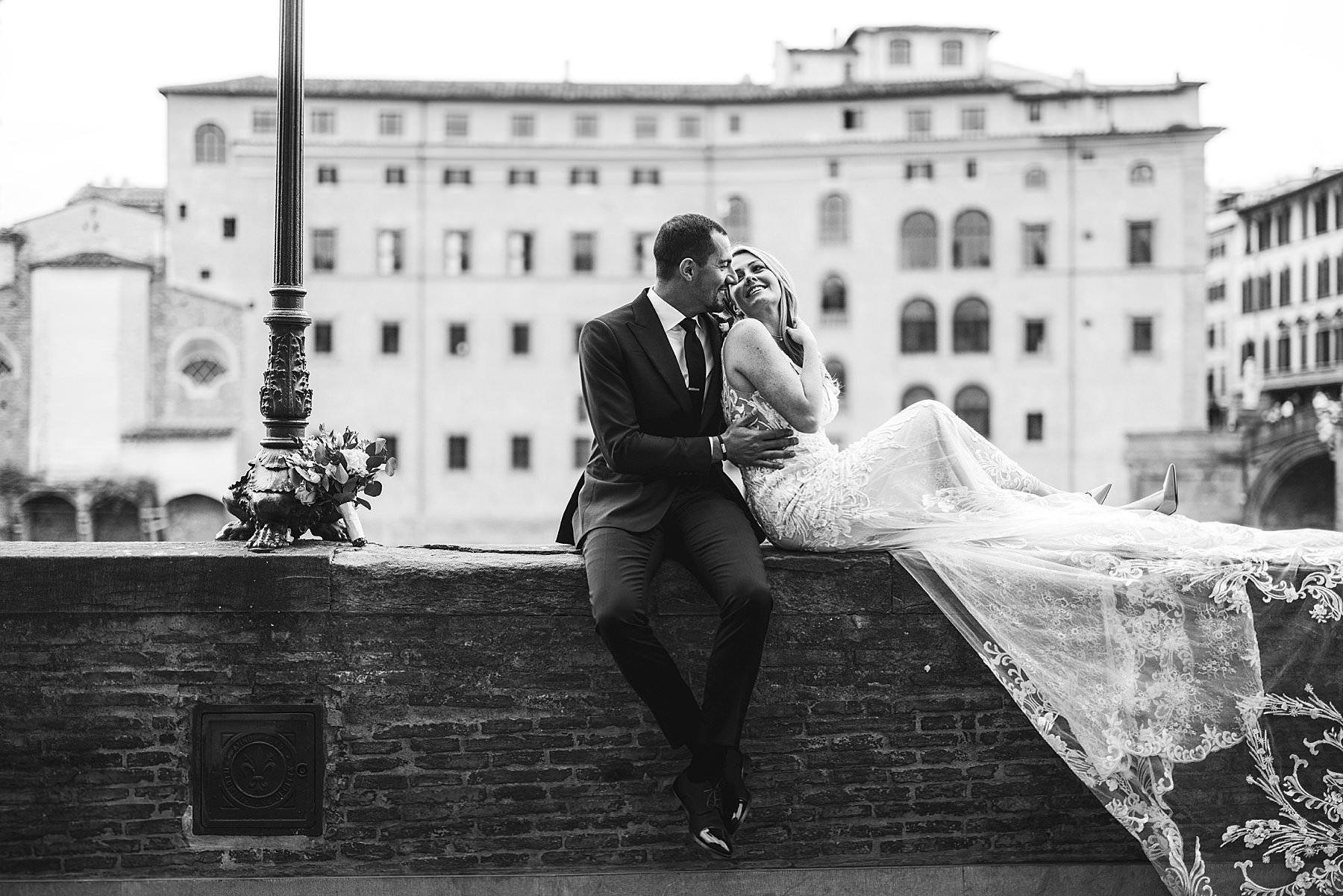 Exciting bride and groom photo tour around the heart of Florence near most iconic Ponte Vecchio. Photo by the Italian elopement photographer in Tuscany based Florence Gabriele Fani.