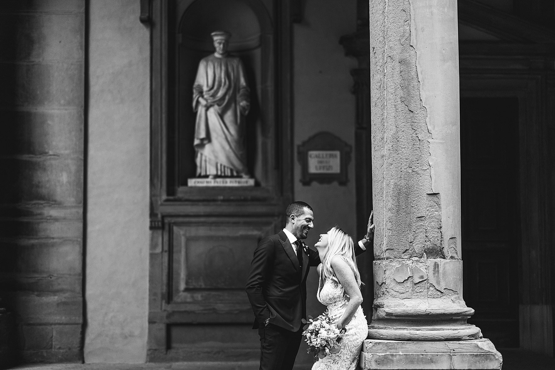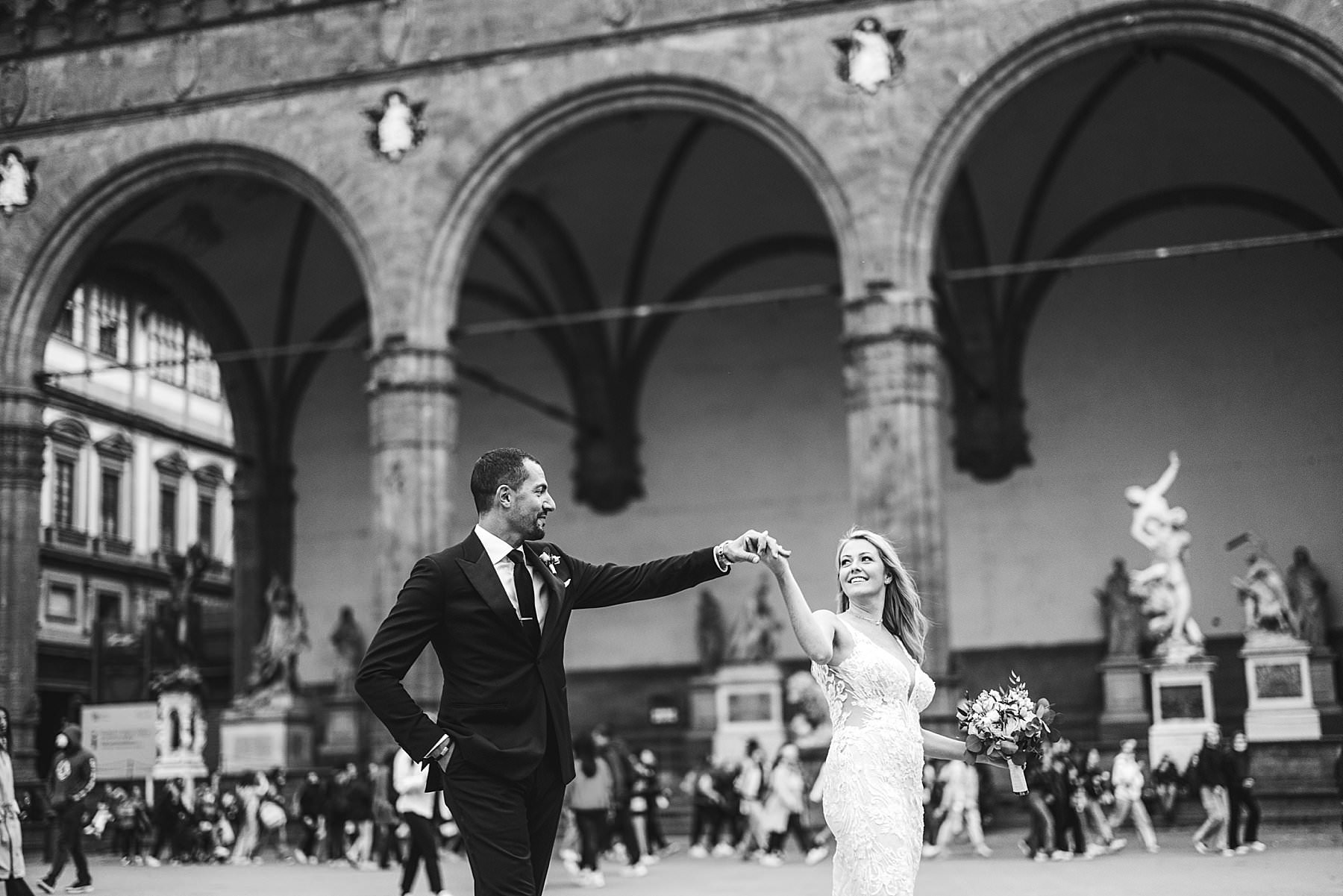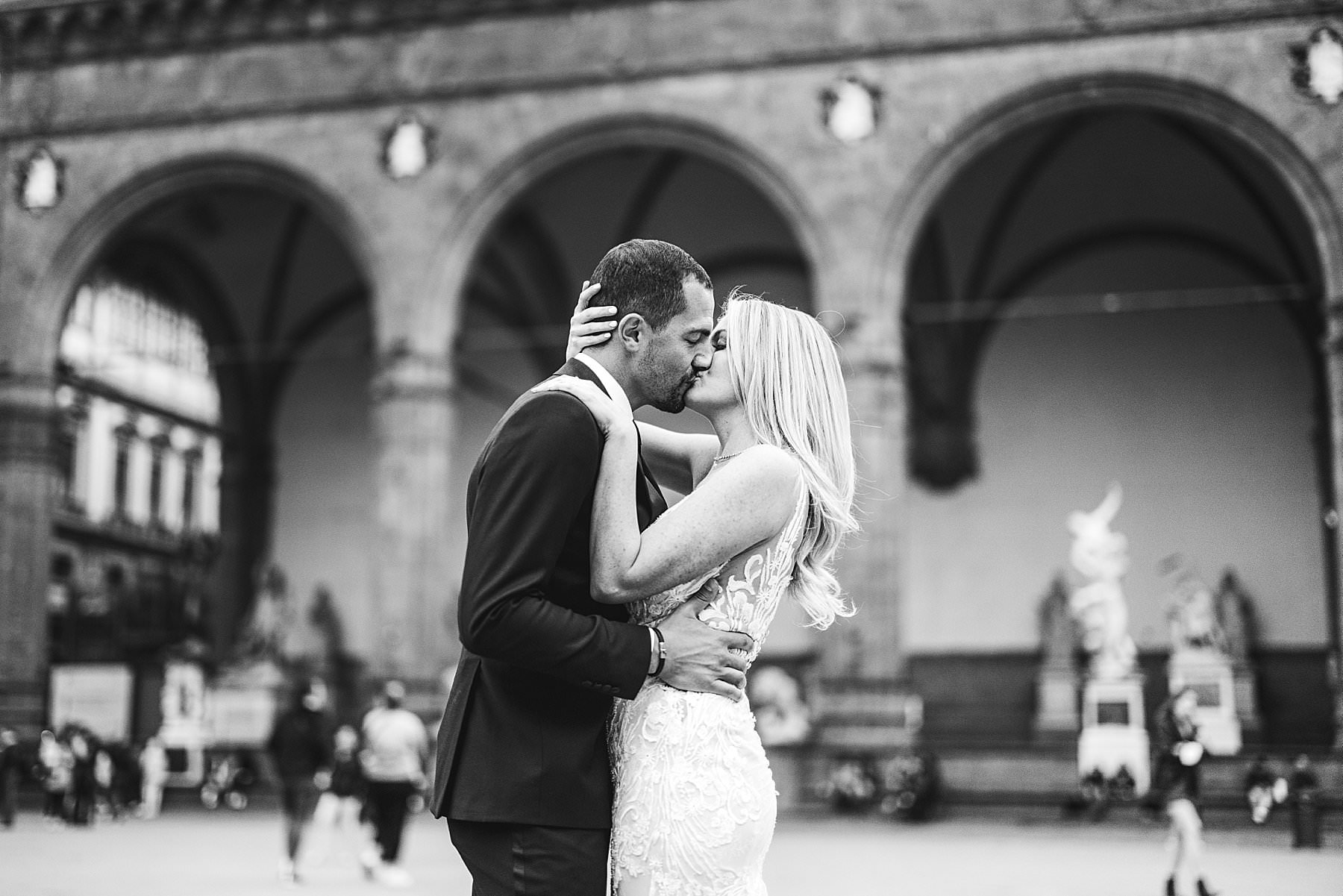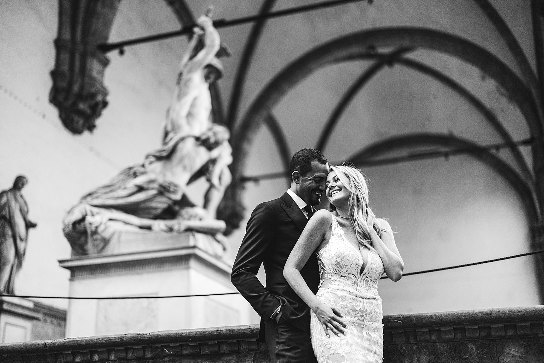 A unique setting for a unique celebration. Bride and groom elopement photo at Loggia de Lanzi near Uffizi Gallery in Florence. Photo by the Italian elopement photographer in Tuscany based Florence Gabriele Fani.