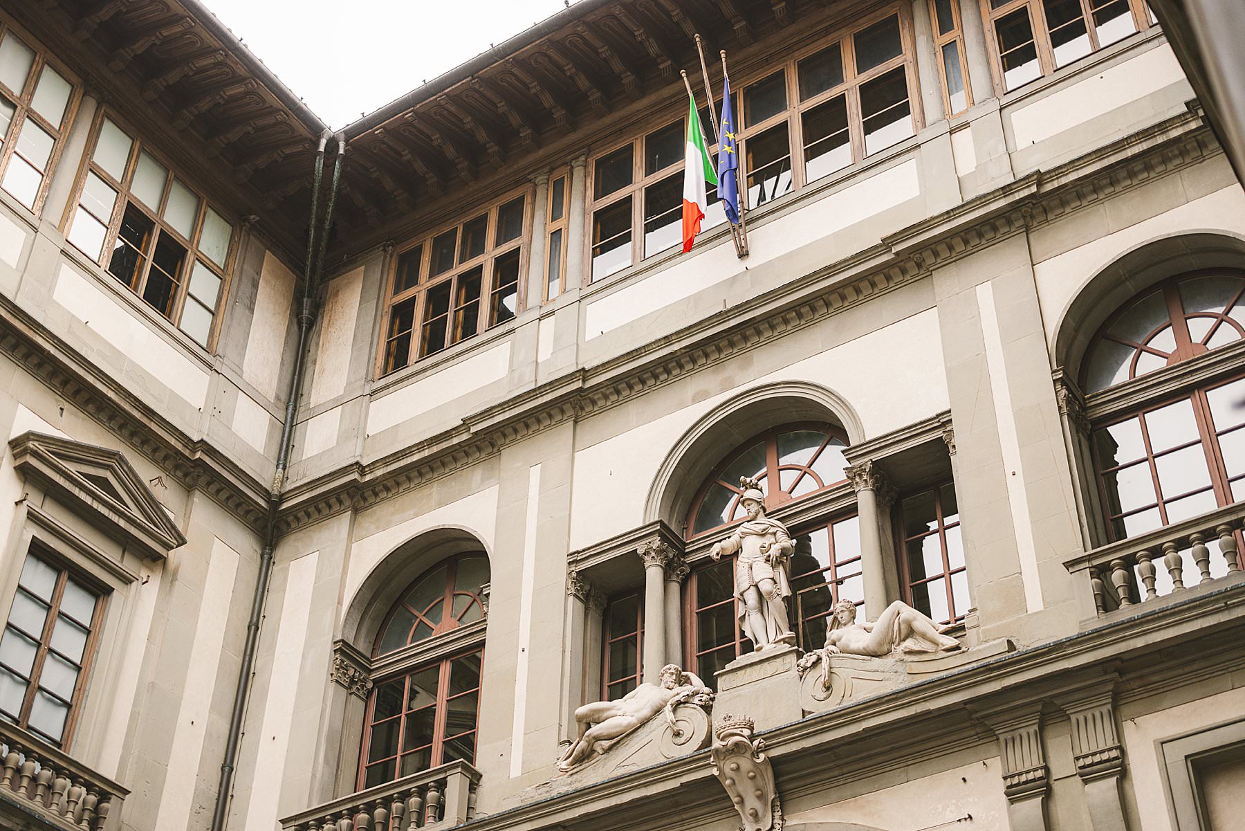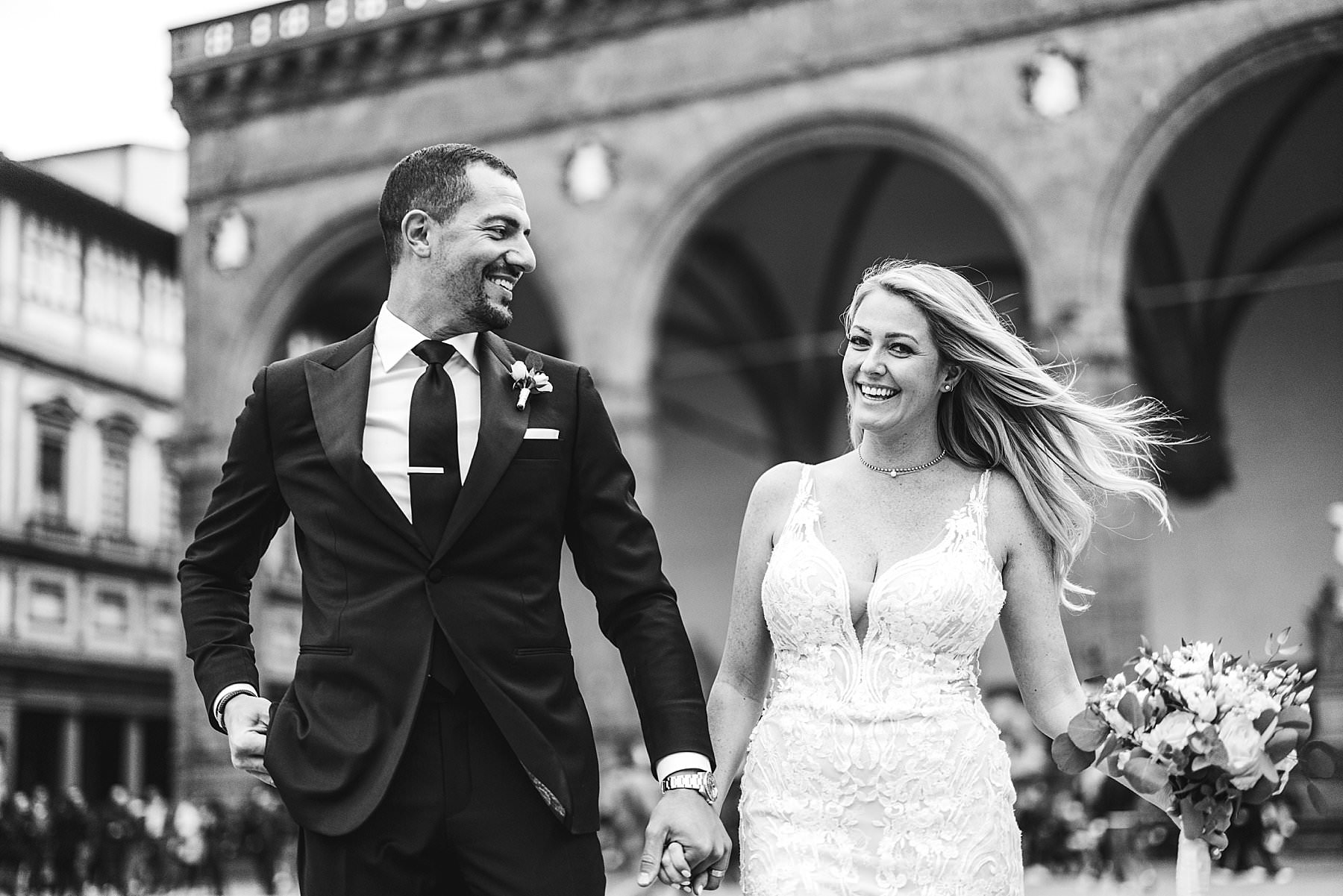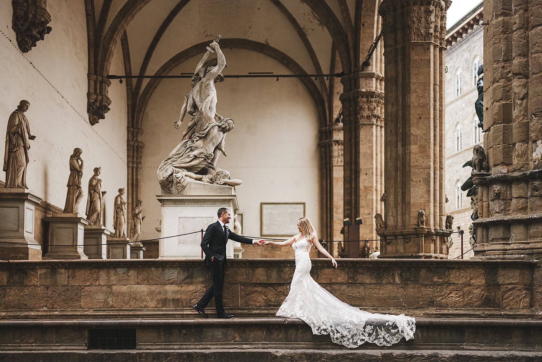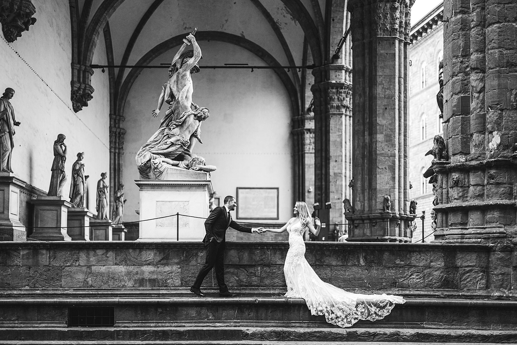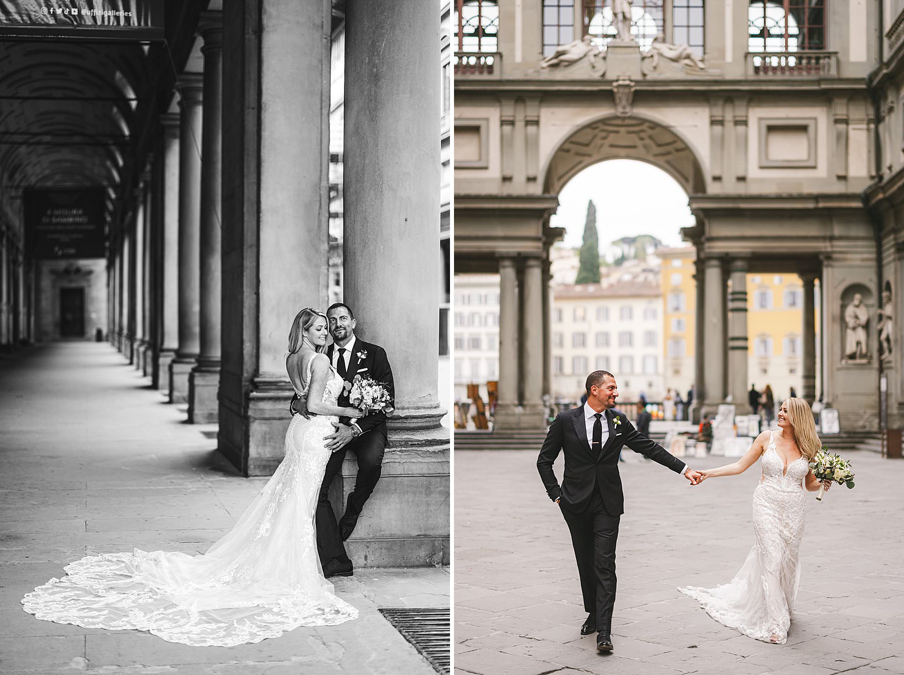 A unique setting for a unique celebration. Bride and groom elopement photo at Loggia de Lanzi near Uffizi Gallery in Florence. Photo by the Italian elopement photographer in Tuscany based Florence Gabriele Fani.