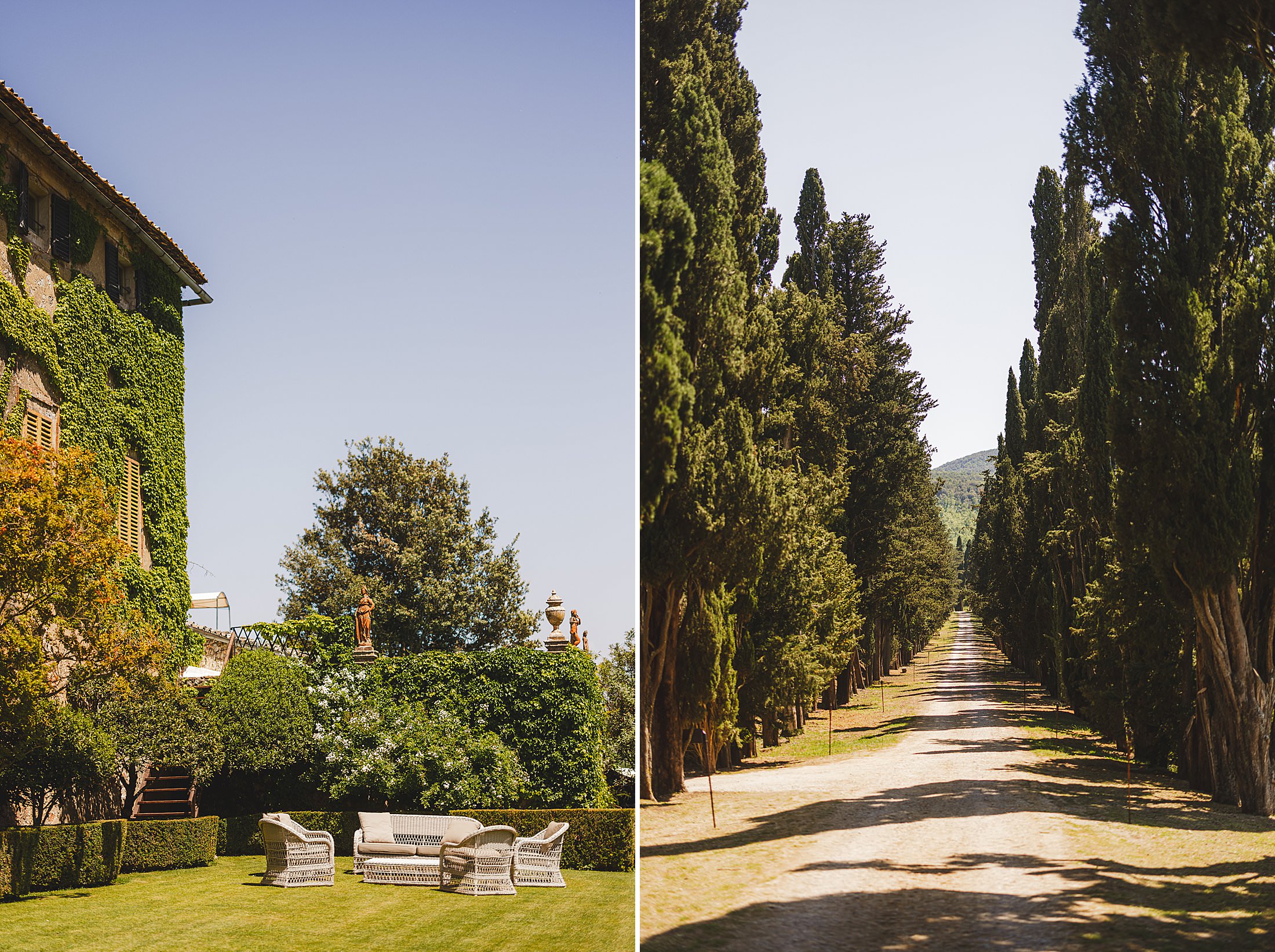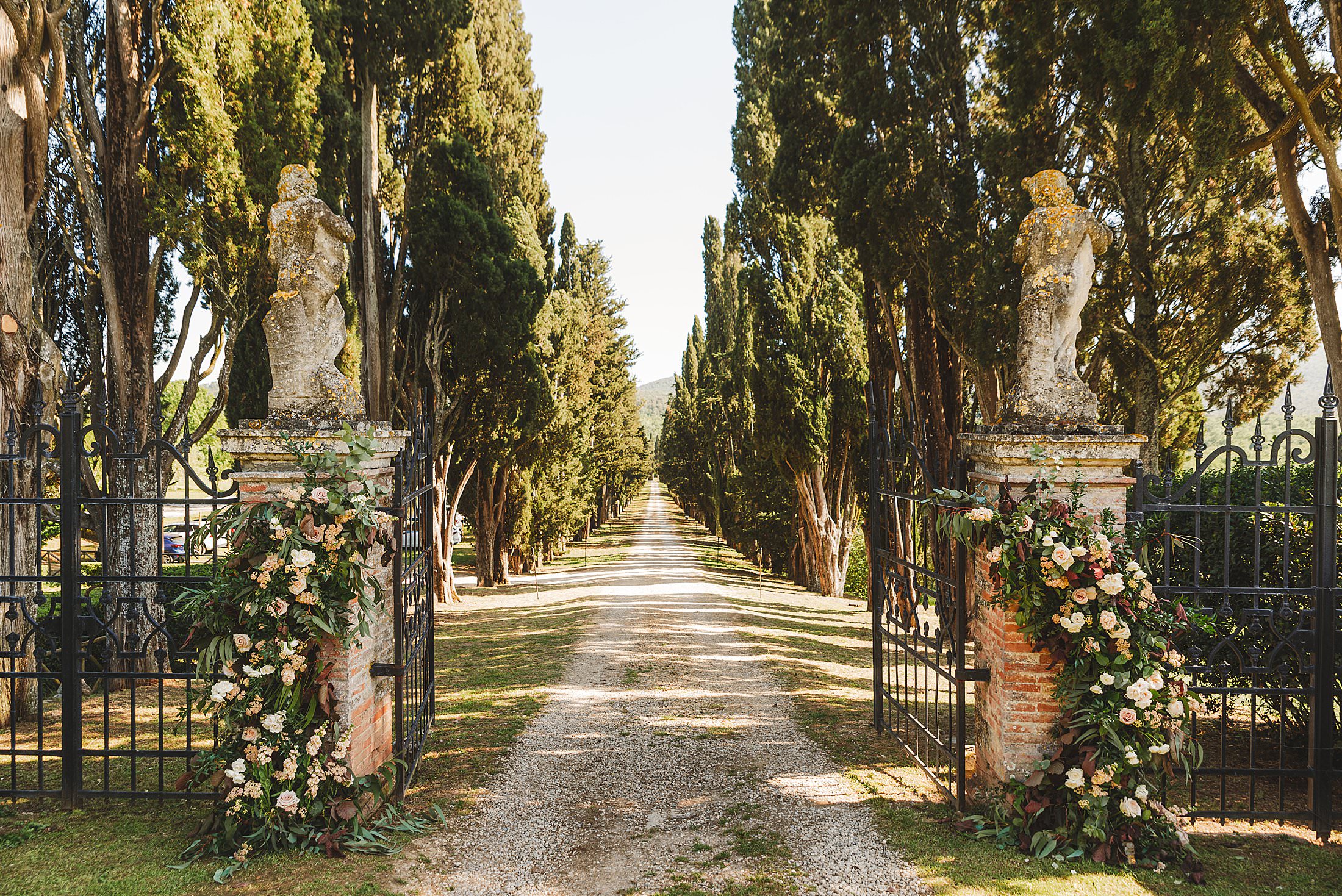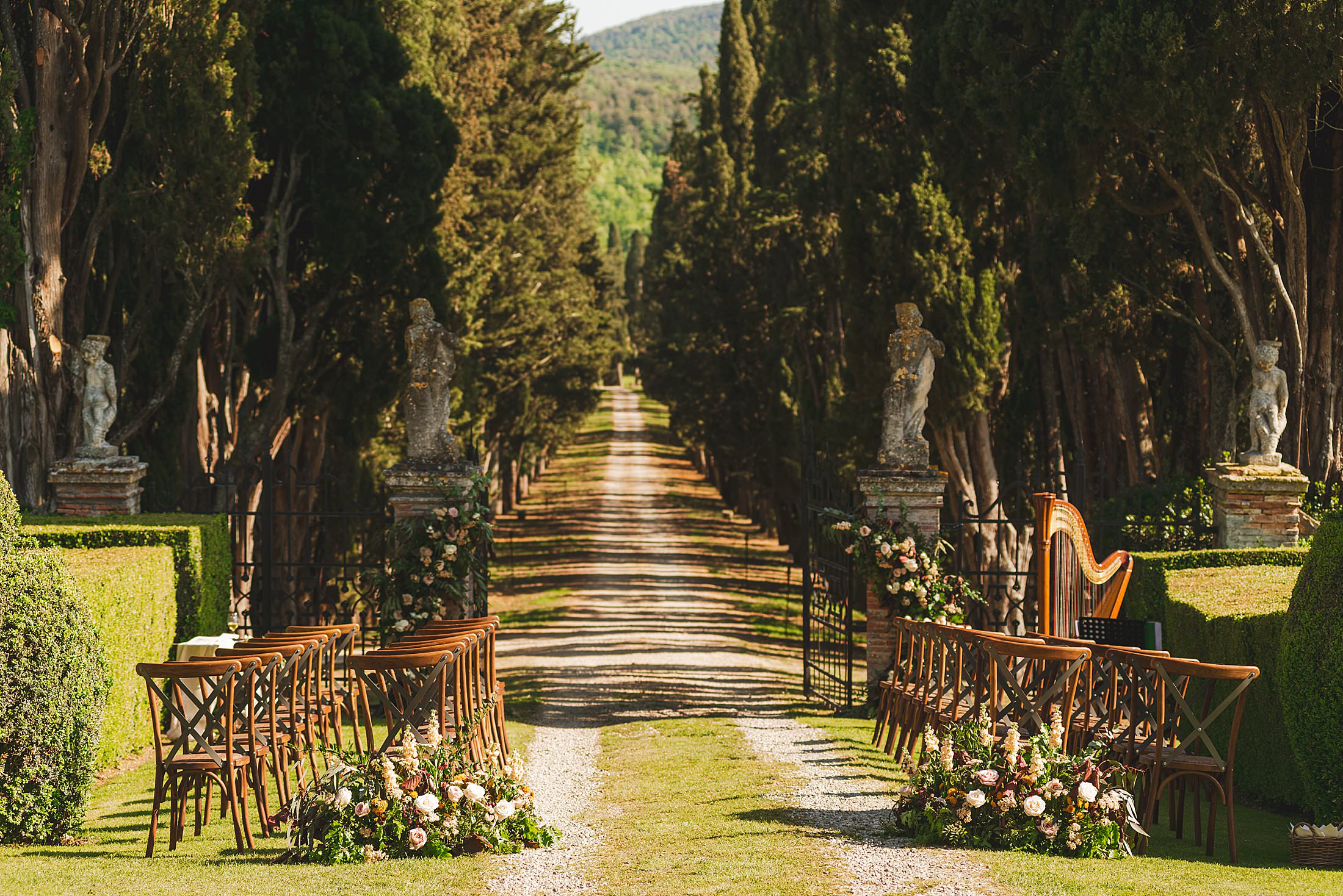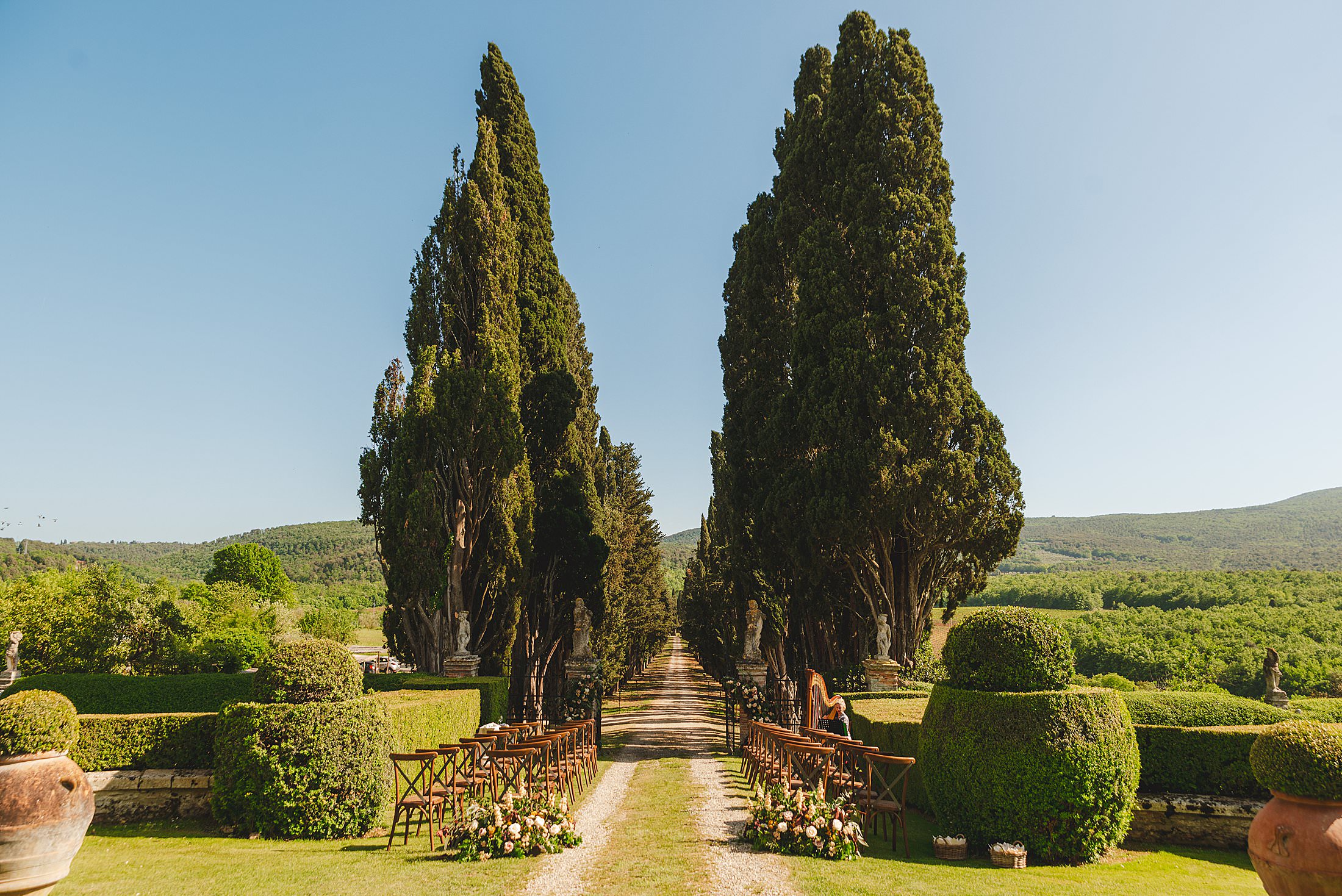 Unforgettable wedding ceremony setup picturesque view cypress trees entrance avenue breathtaking Borgo Stomennano. Photo by the elegant wedding photographer in Tuscany based Florence Gabriele Fani.