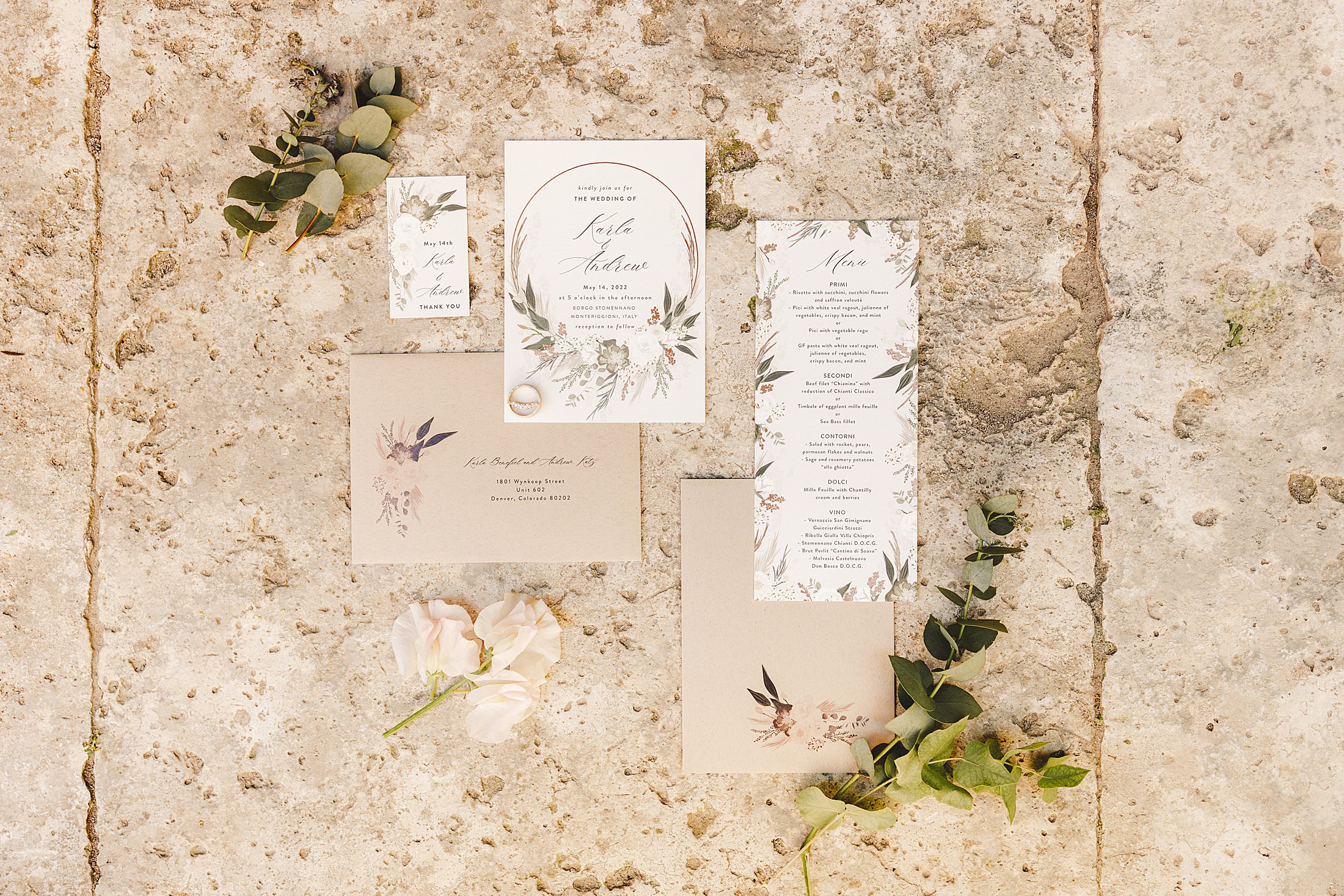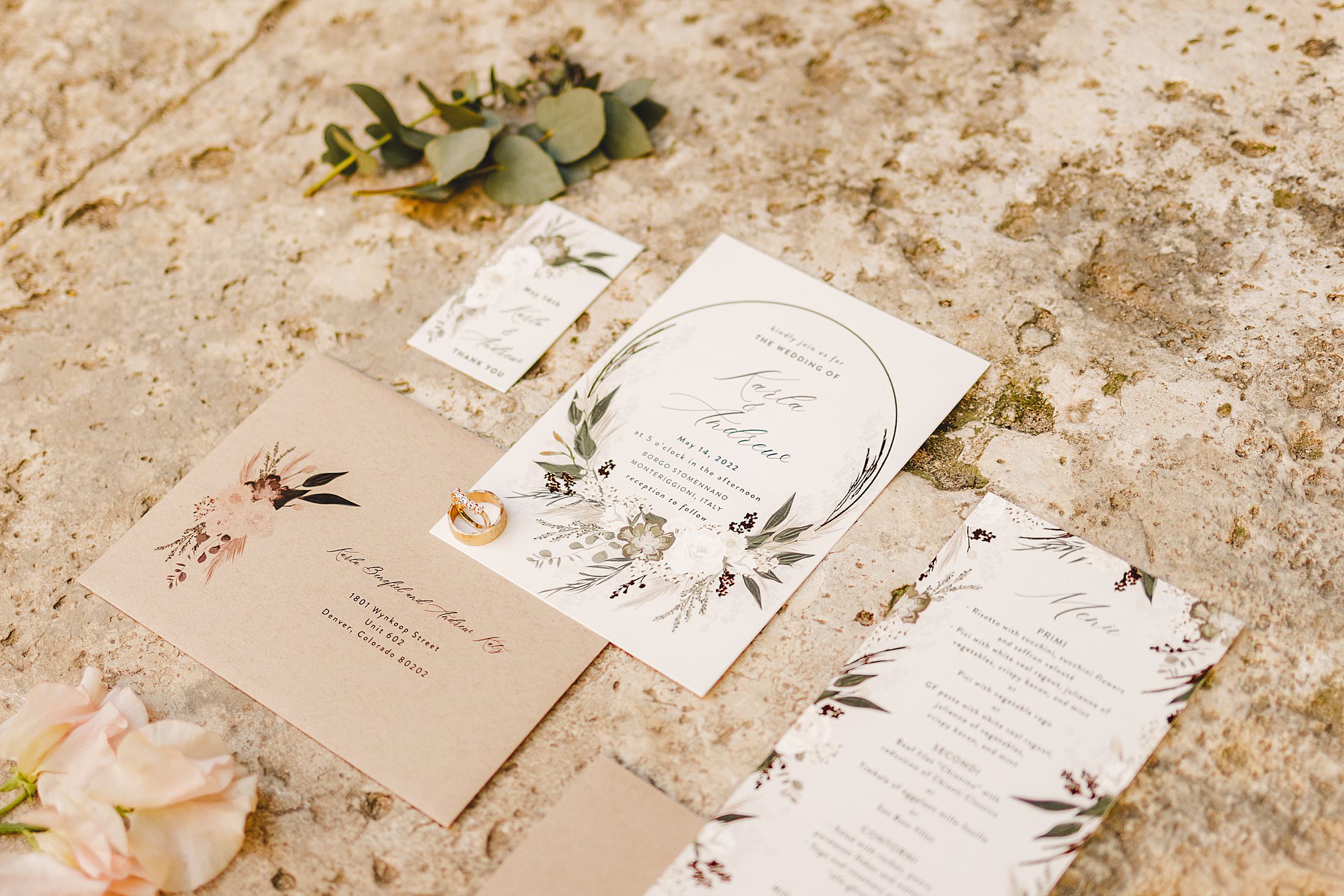 Flat lay wedding bridal details shoot with flower decor and real historic beige marble backdrop at Borgo Stomennano. Photo by the elegant wedding photographer in Tuscany based Florence Gabriele Fani.