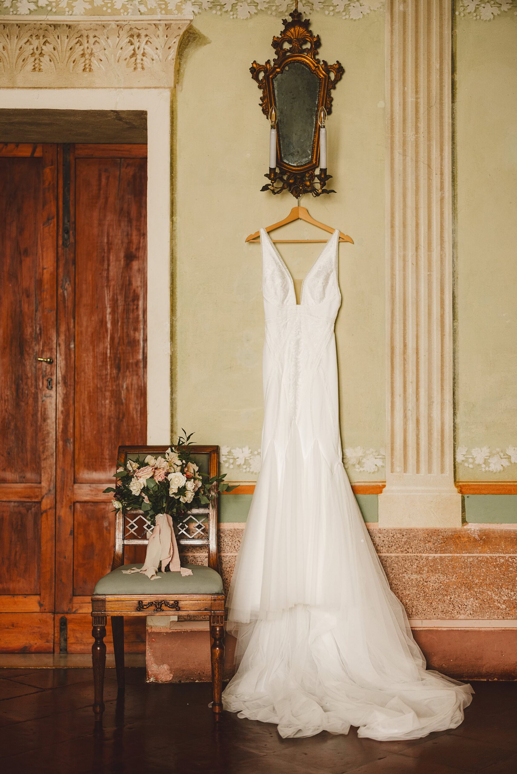 Elegant bridal accessories photo with dress and flower bouquet at Borgo Stomennano suite. Photo by the elegant wedding photographer in Tuscany based Florence Gabriele Fani.