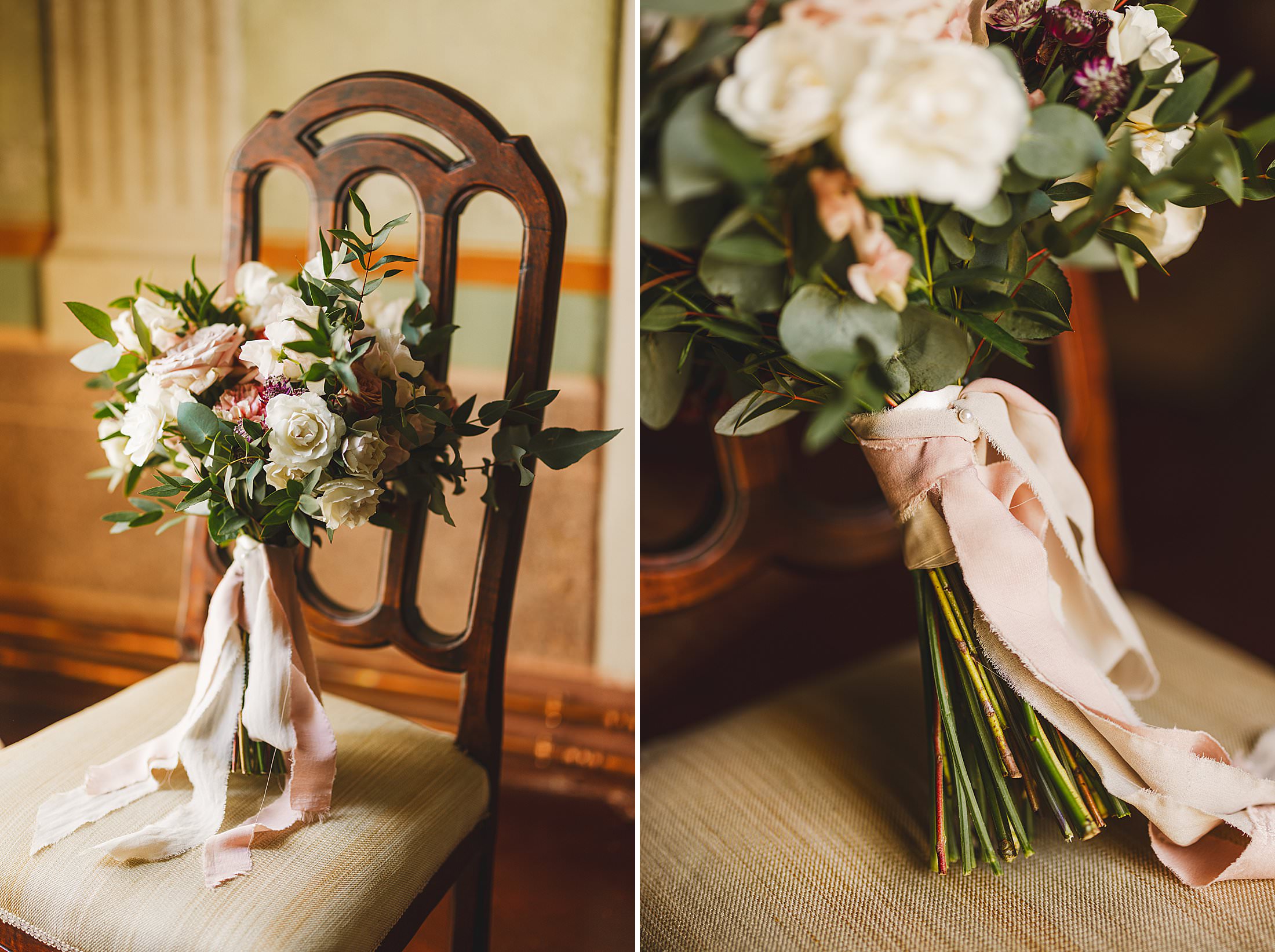 Stunning bridal flower bouquet graces a chair, adorned with a delicate rose ribbon in classic Italian beauty venue of Borgo Stomennano. Photo by the elegant wedding photographer in Tuscany based Florence Gabriele Fani.