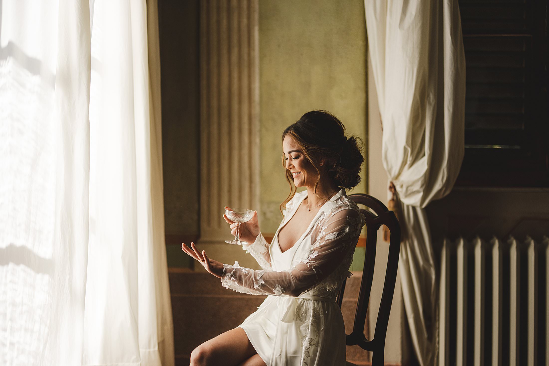 Elegant bride preparation photo taken in suite room of Borgo Stomennano luxury venue in the heart of Tuscany countryside near Siena. Photo by the elegant wedding photographer in Tuscany based Florence Gabriele Fani.