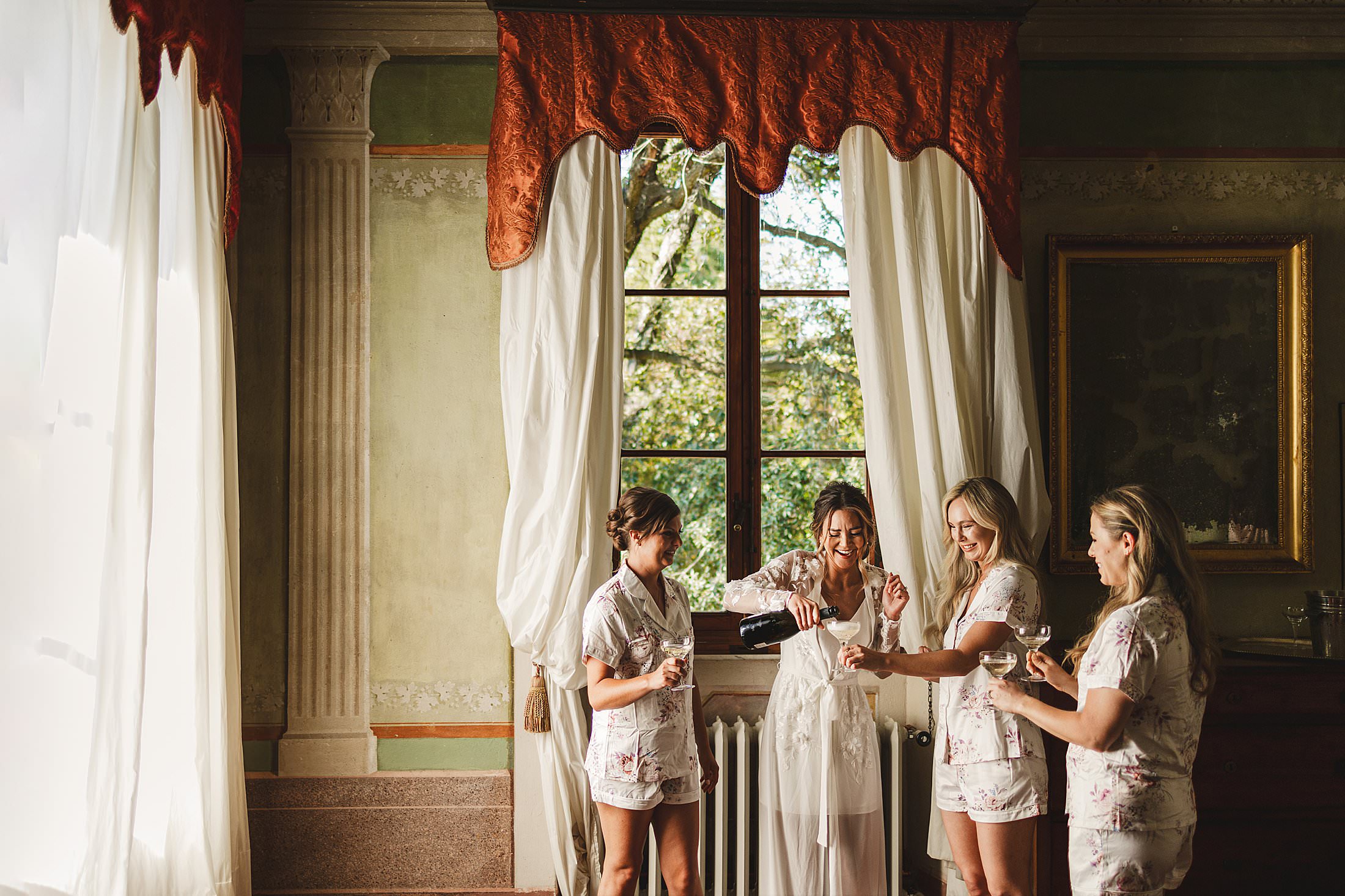 Elegant bride and bridesmaids portrait at Borgo Stomennano suite just before to wear the wedding gown. Photo by the elegant wedding photographer in Tuscany based Florence Gabriele Fani.