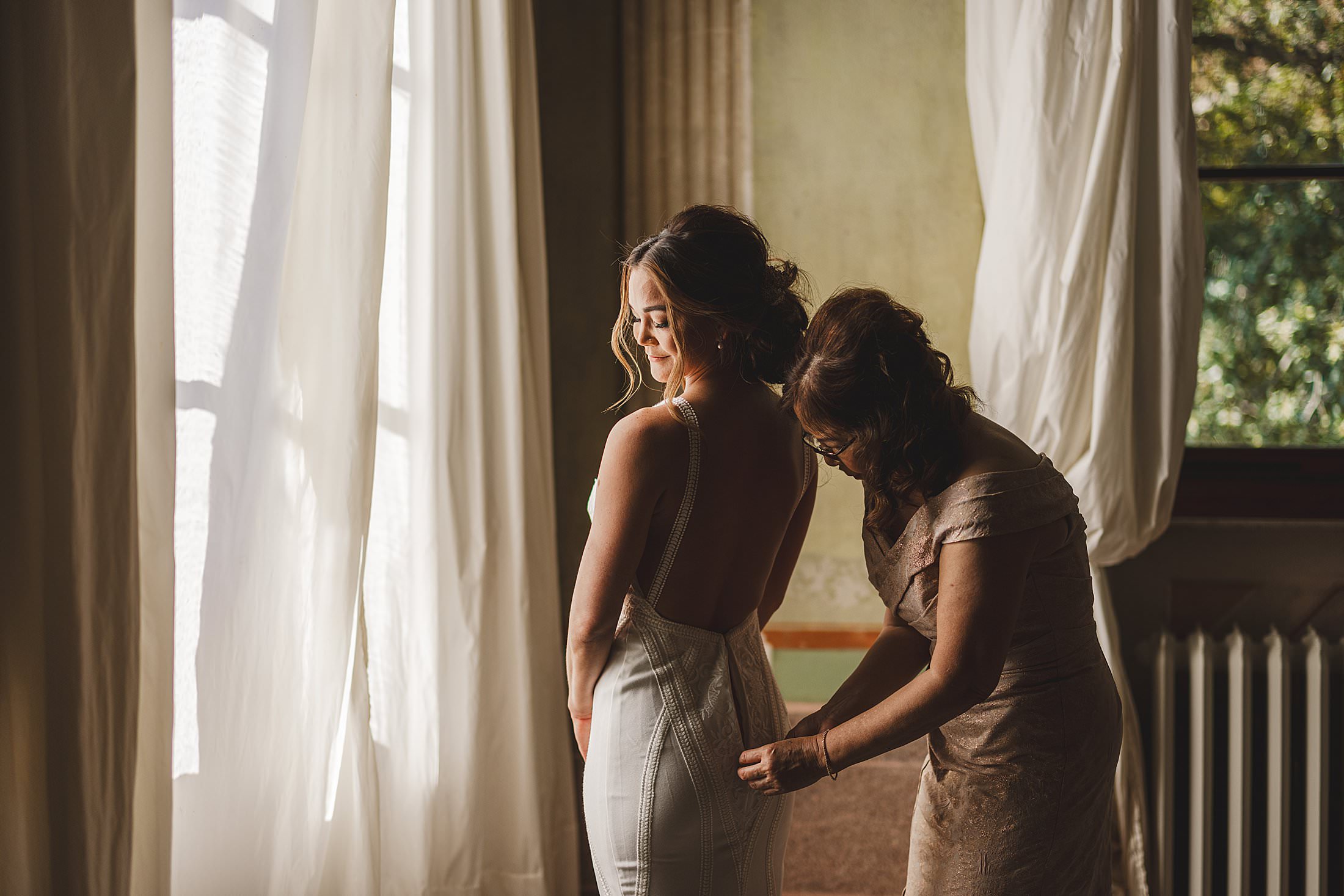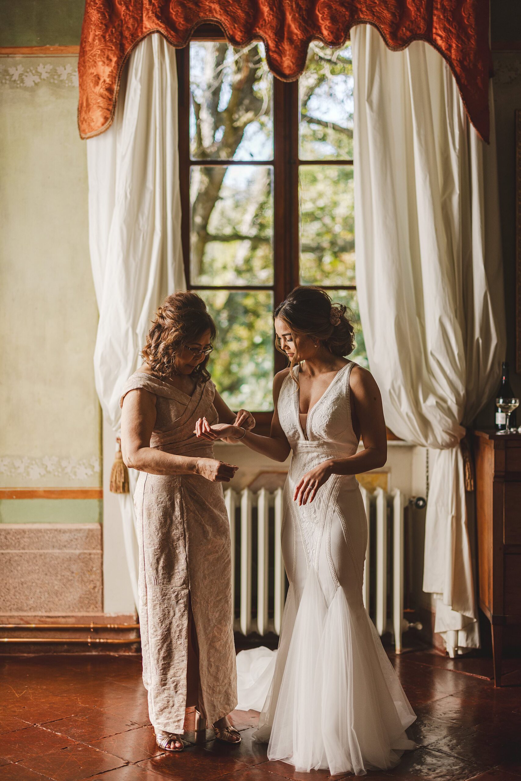 touching moments of the getting-ready as the mother of the bride lends a helping hand, delicately fastening a cherished bracelet. A glimpse into the love and support that surrounds the bride on her special day in the classic Italian venue of Borgo Stomennano. Photo by the elegant wedding photographer in Tuscany based Florence Gabriele Fani.