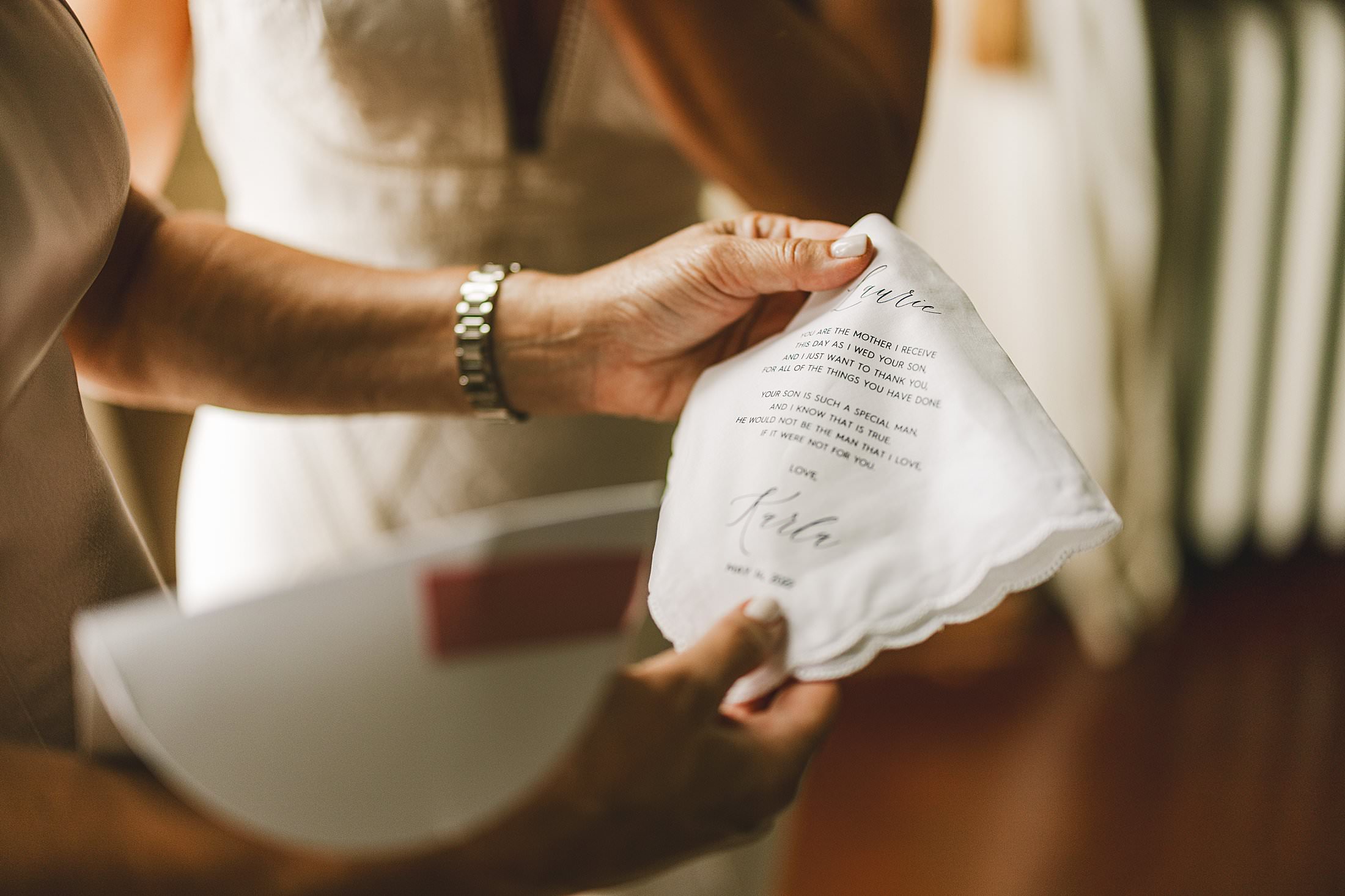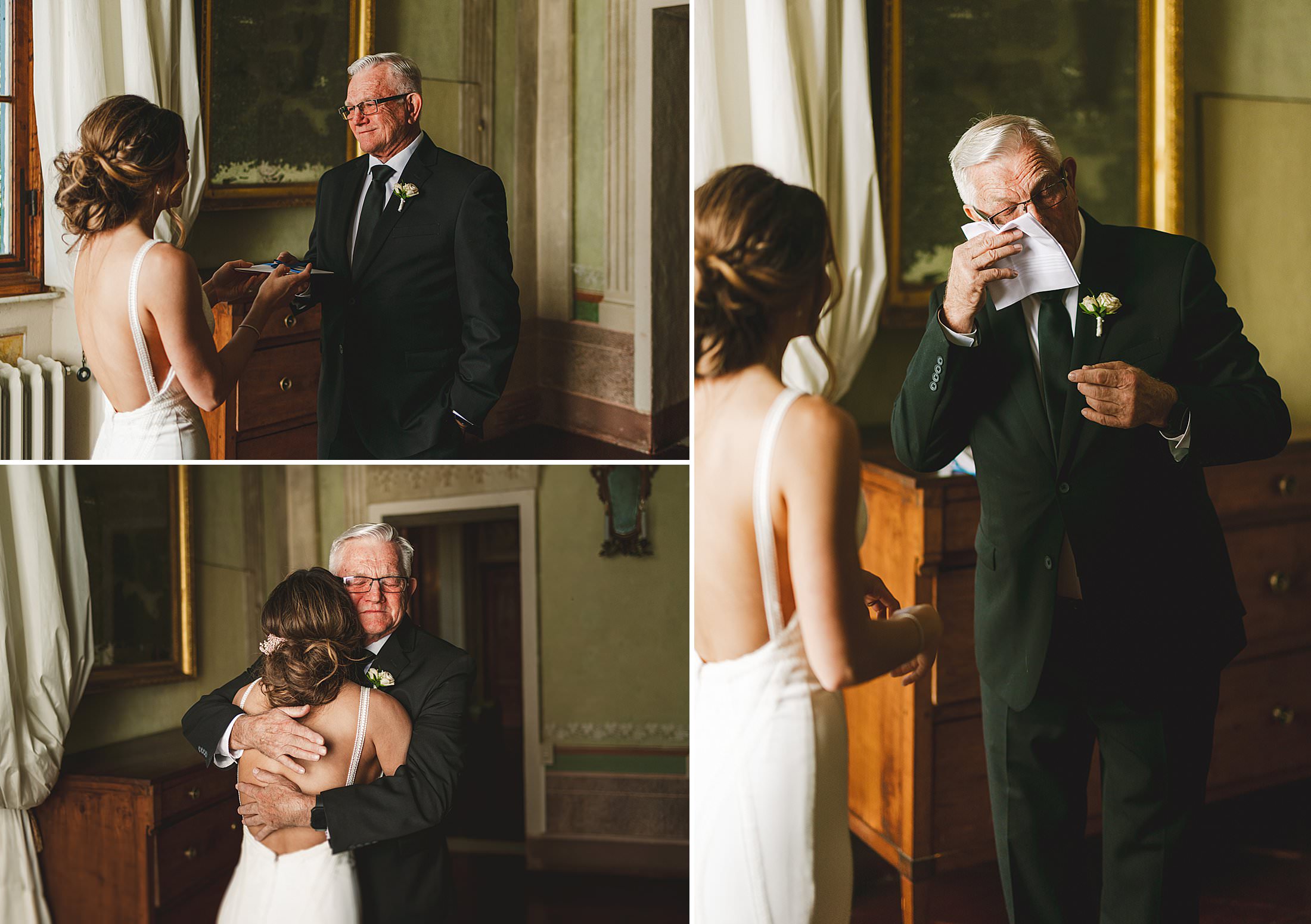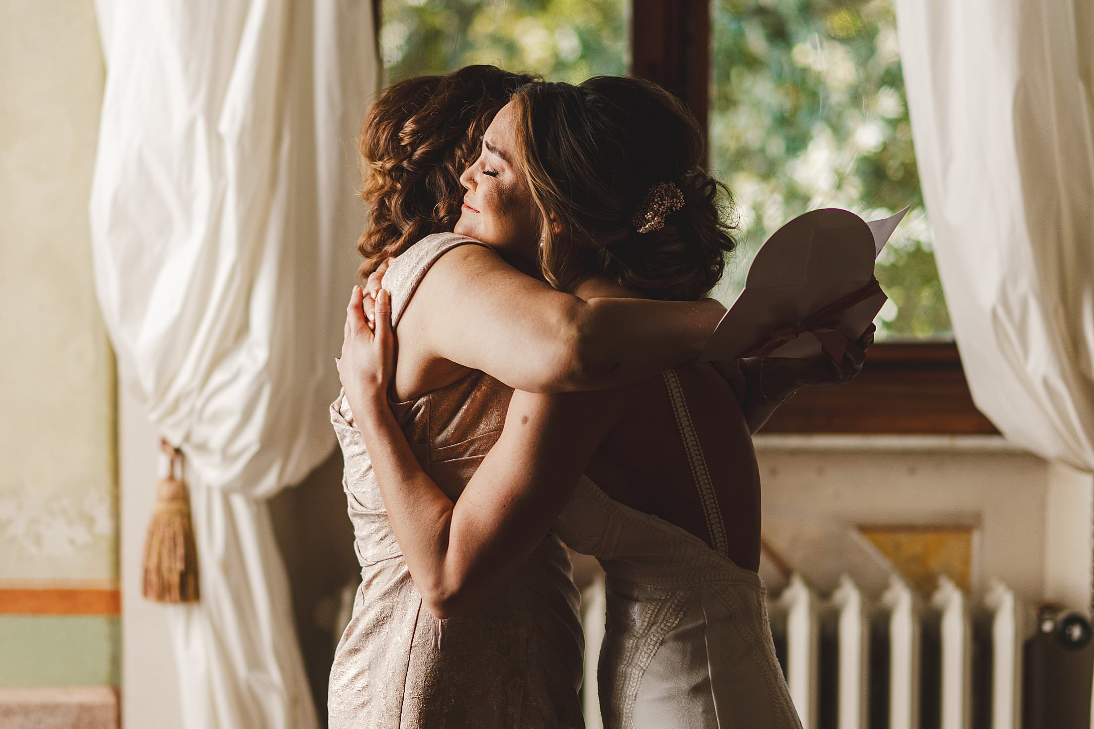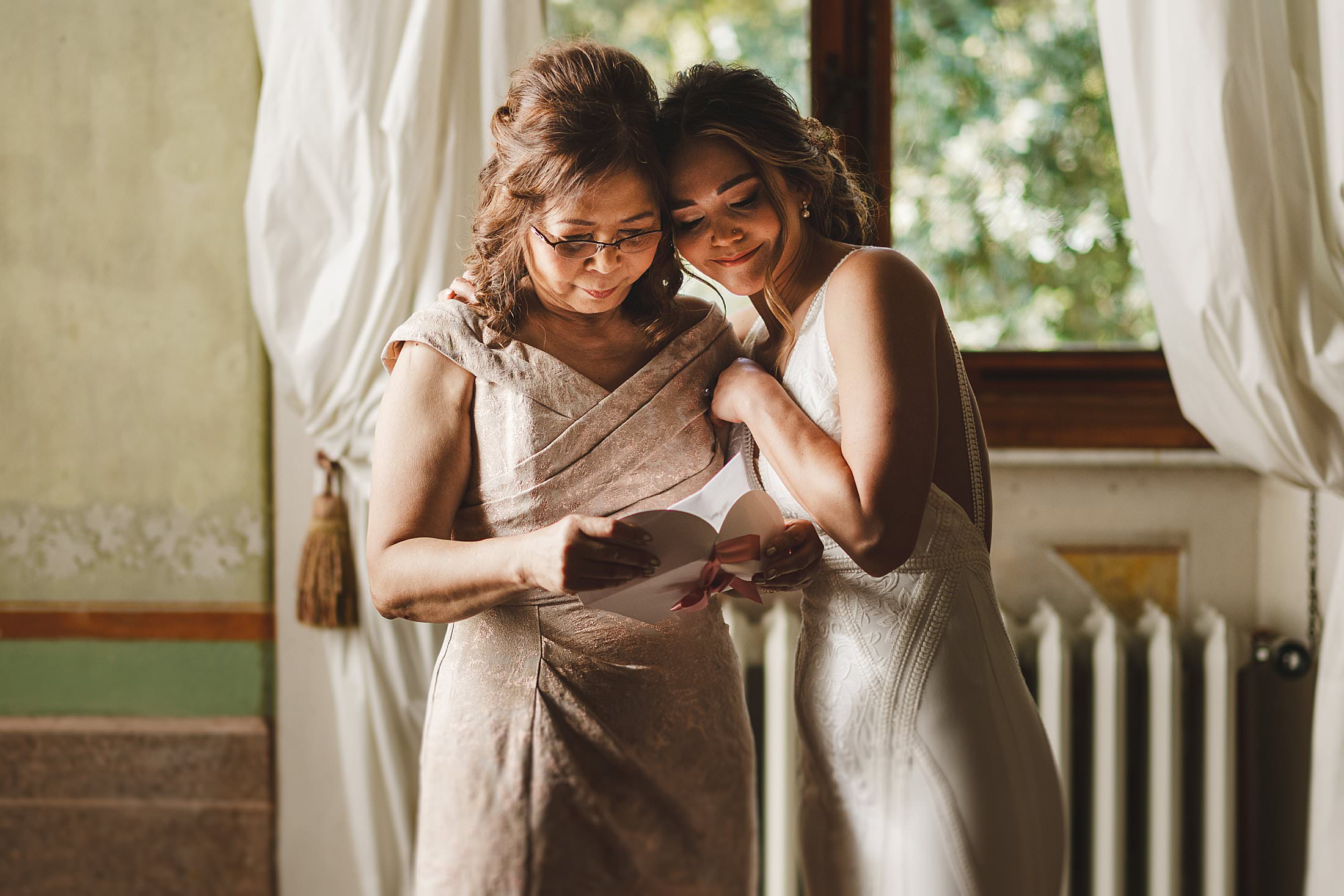 A tender moment captured at Borgo Stomennano during a wedding the bride warmly embraces her mother while the latter reads a heartfelt letter. A moment of love and emotion that tells the profound connection between mother and daughter on this special day. Photo by the elegant wedding photographer in Tuscany based Florence Gabriele Fani.