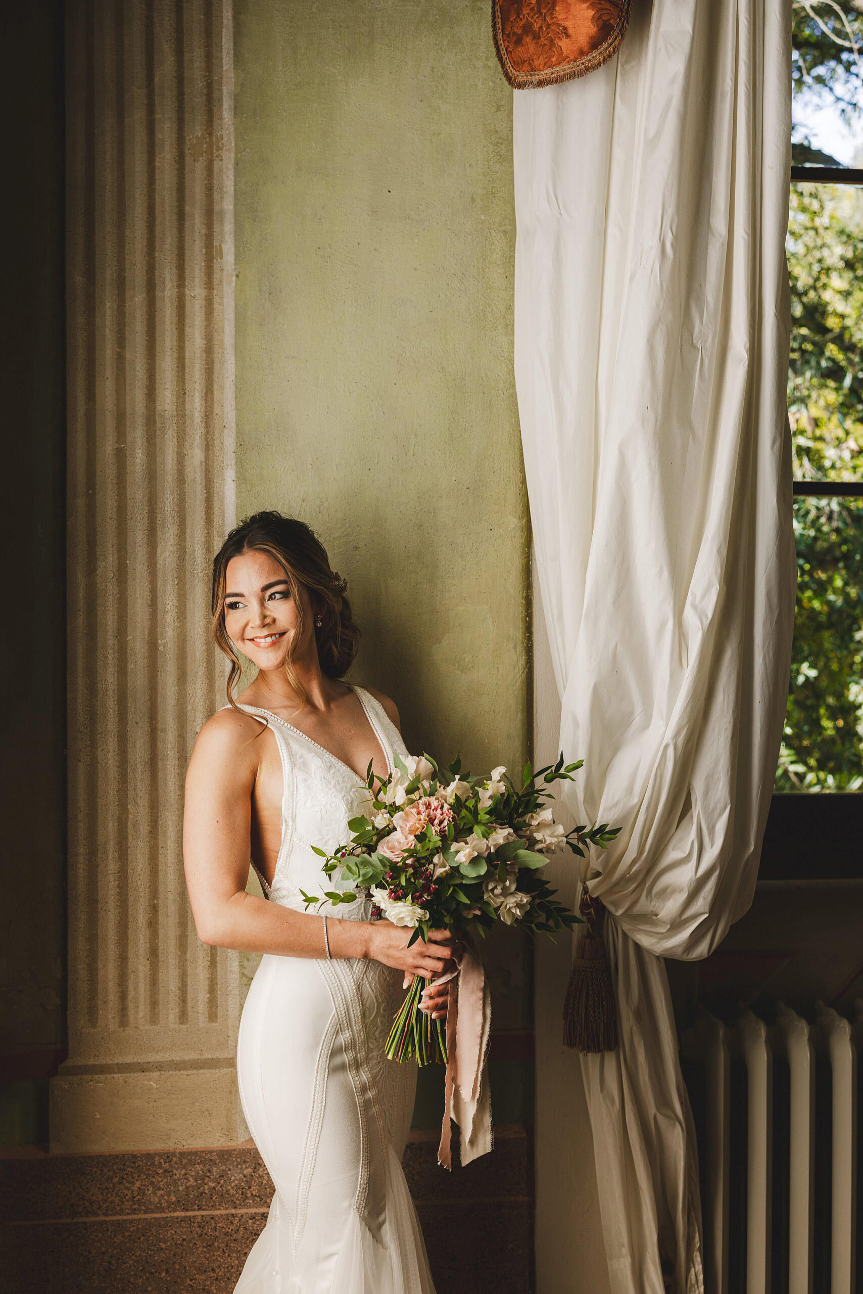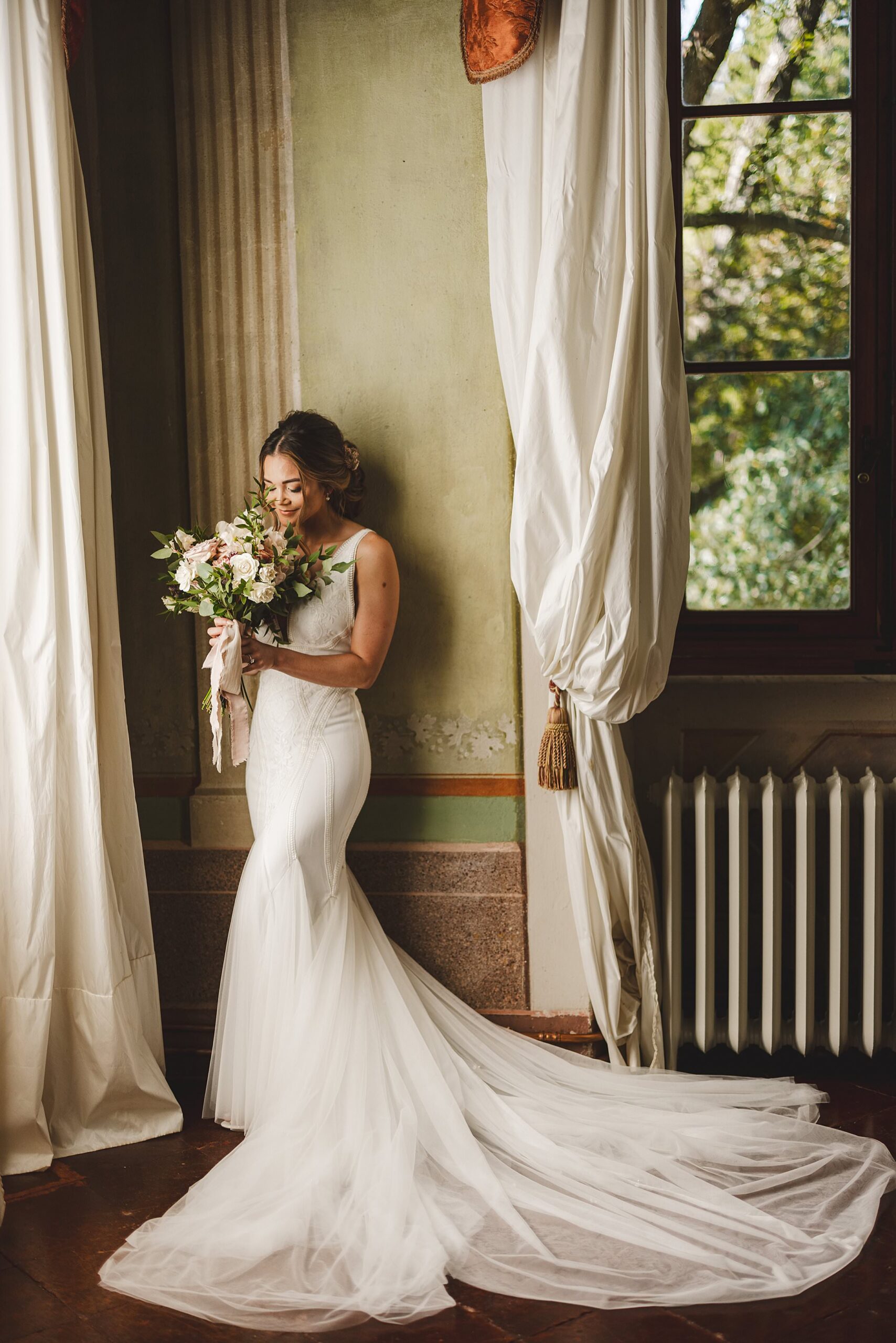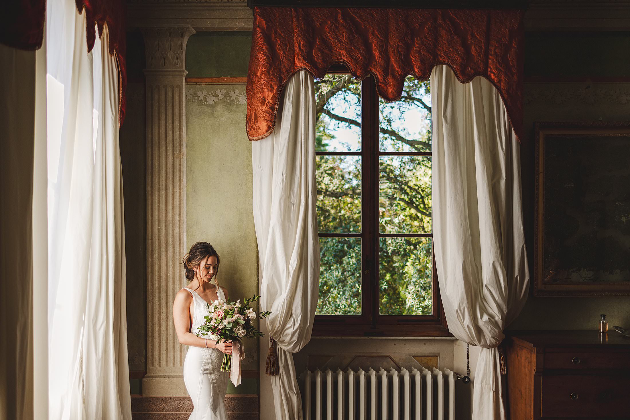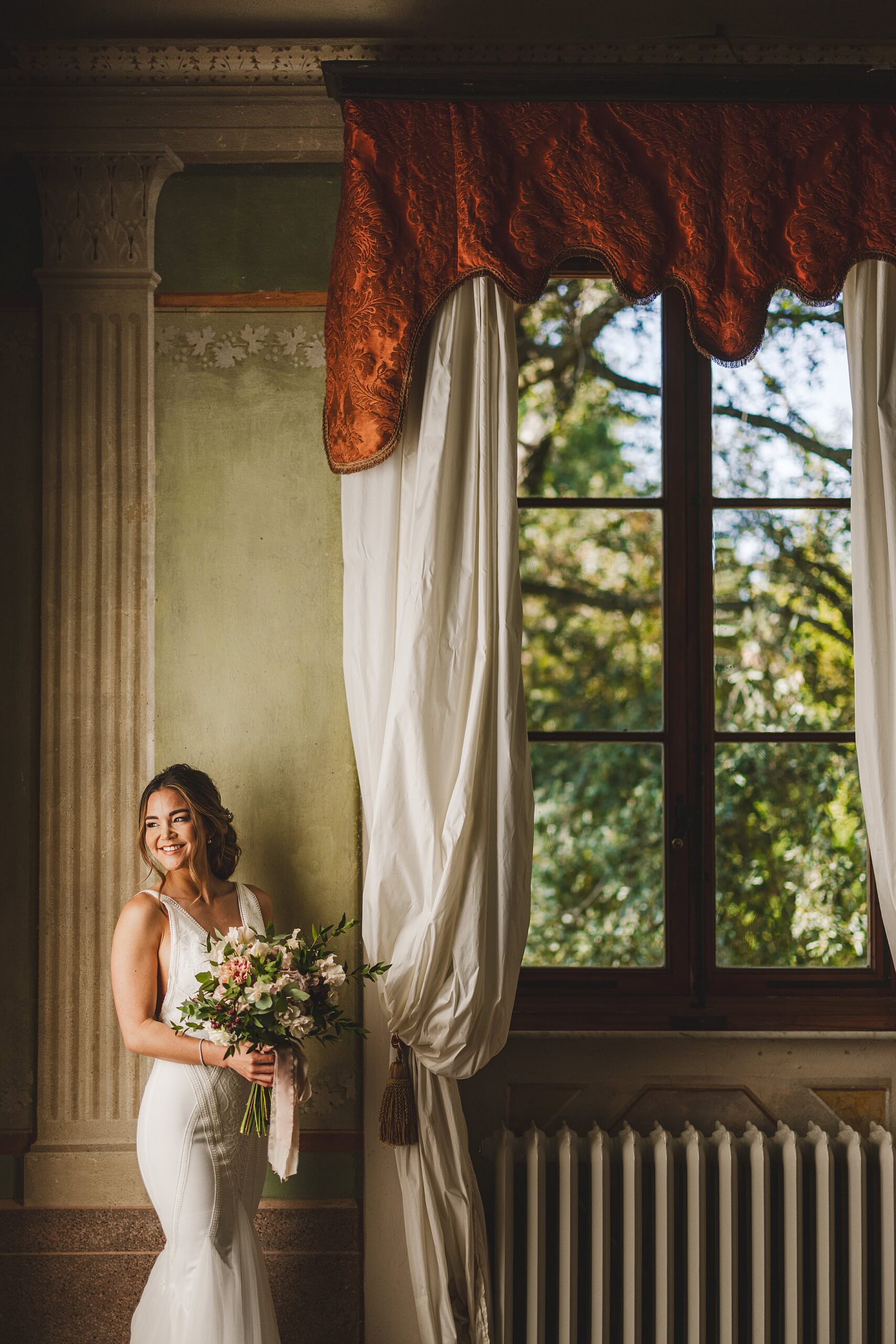 Elegance meets enchantment in this stunning bridal portrait captured in the suite of Borgo Stomennano during a destination wedding. The bride, adorned in timeless grace, holds a beautiful flower bouquet, standing beside a grand window. A moment of beauty and anticipation in the heart of Tuscany, as love unfolds in the most picturesque setting. Photo by the elegant wedding photographer in Tuscany based Florence Gabriele Fani.