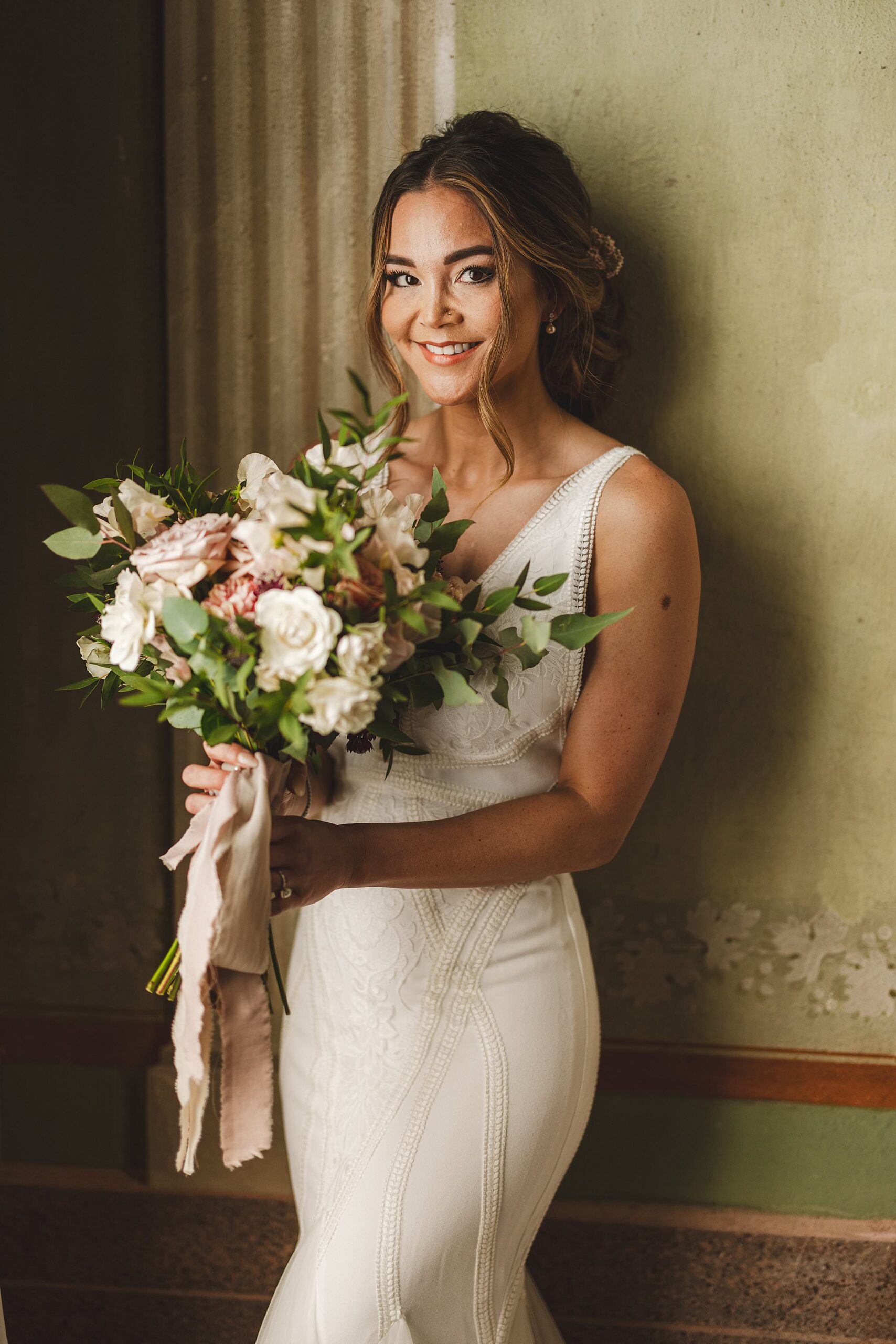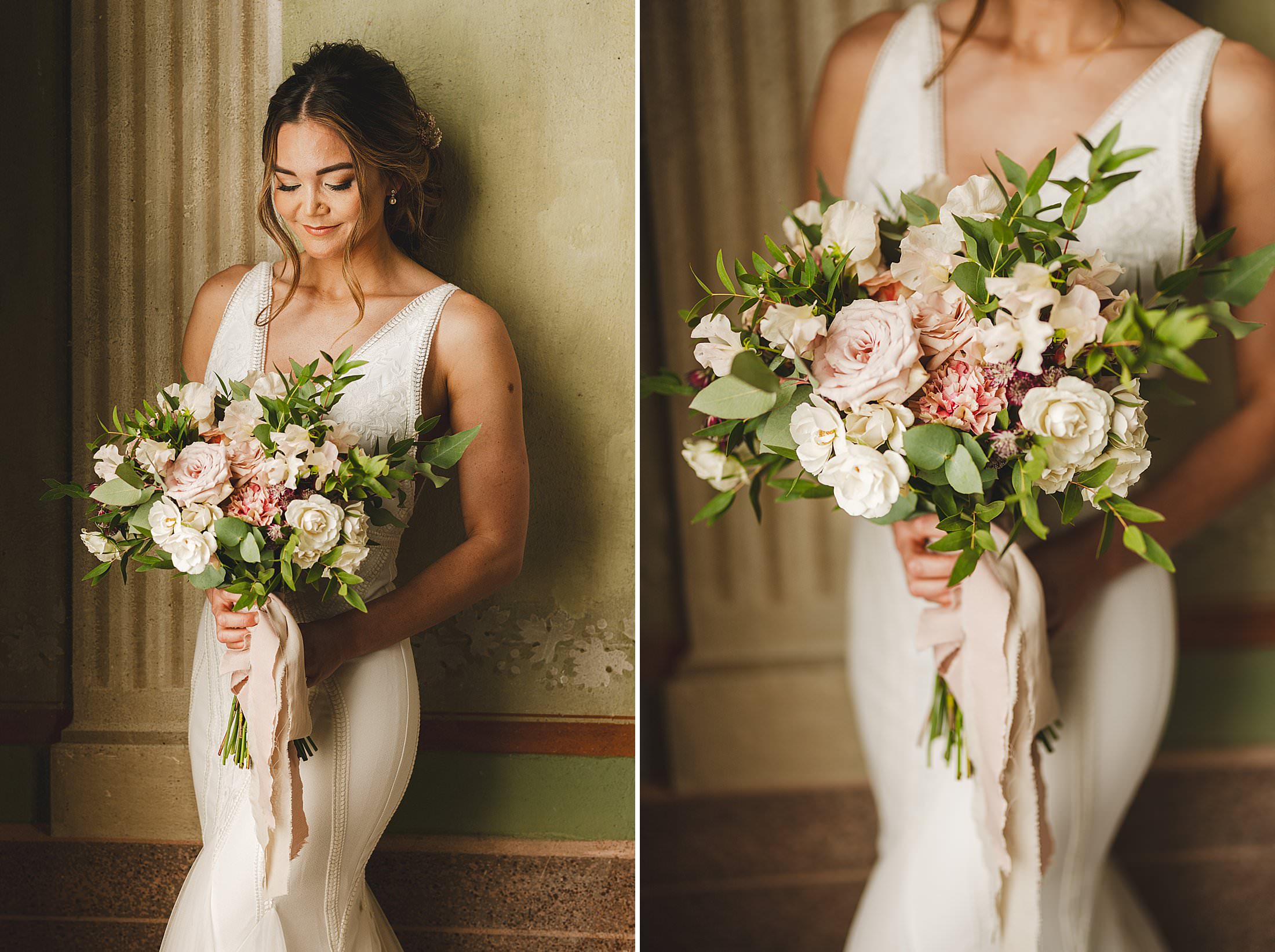 Timeless elegant and classic bridal portrait with lovely bouquet at Borgo Stomennano suite. Photo by the elegant wedding photographer in Tuscany based Florence Gabriele Fani.