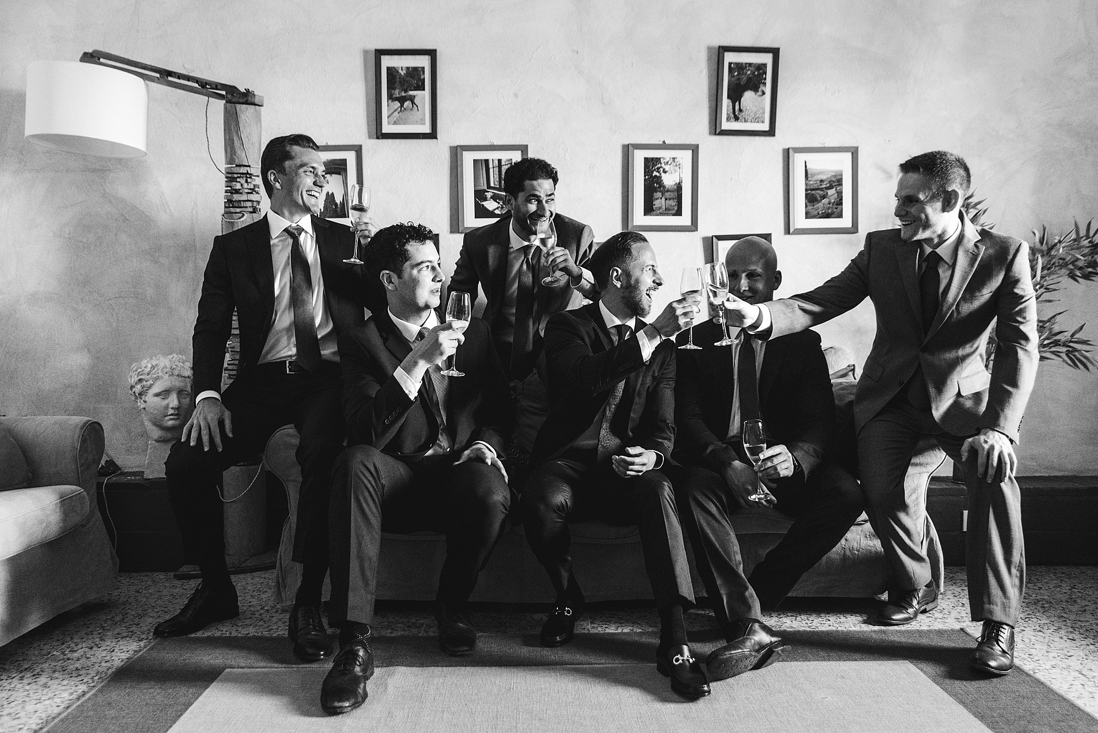 Groom with groomsmens candid shoot during toast before the ceremony at Borgo Stomennano real wedding. Photo by the elegant wedding photographer in Tuscany based Florence Gabriele Fani.