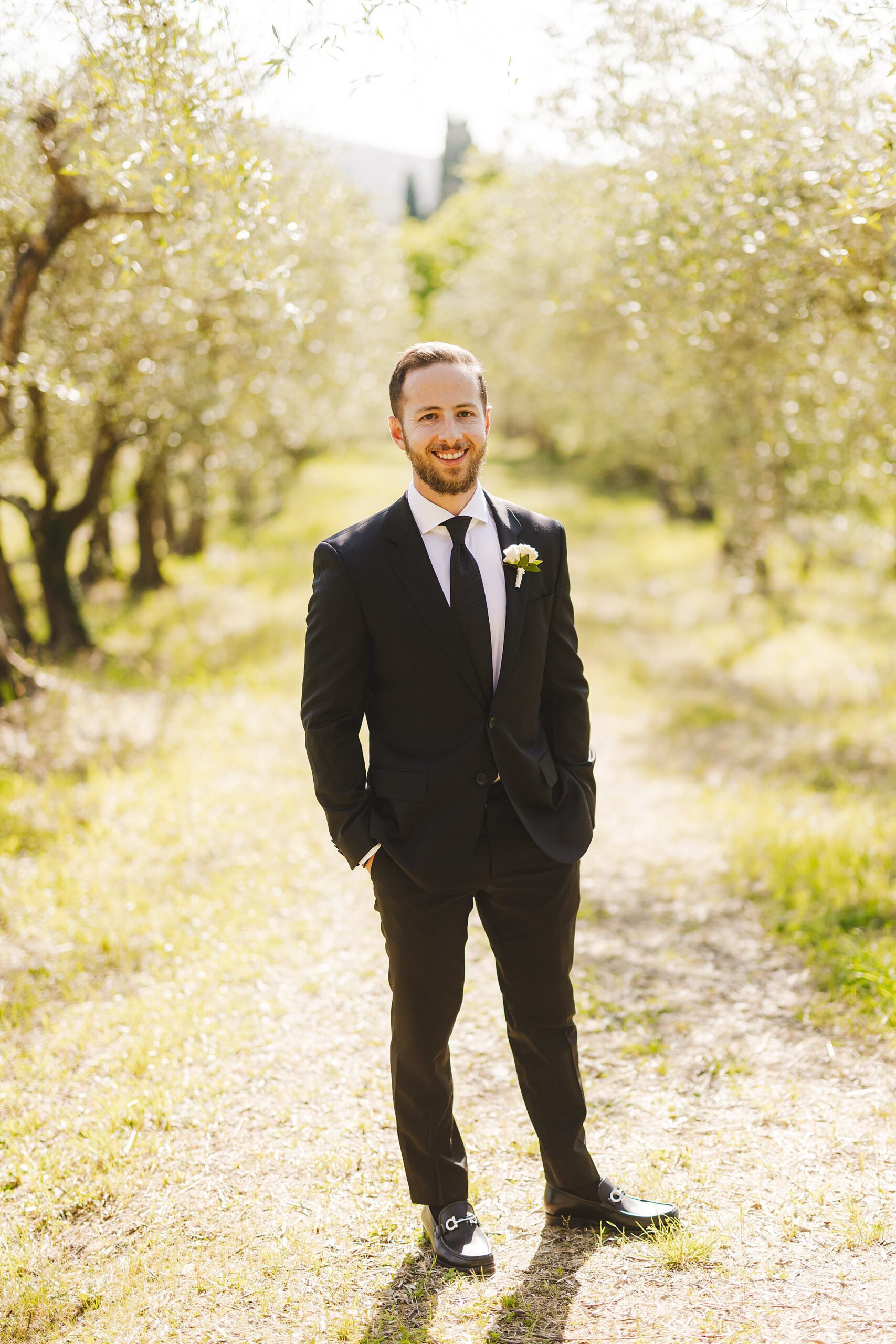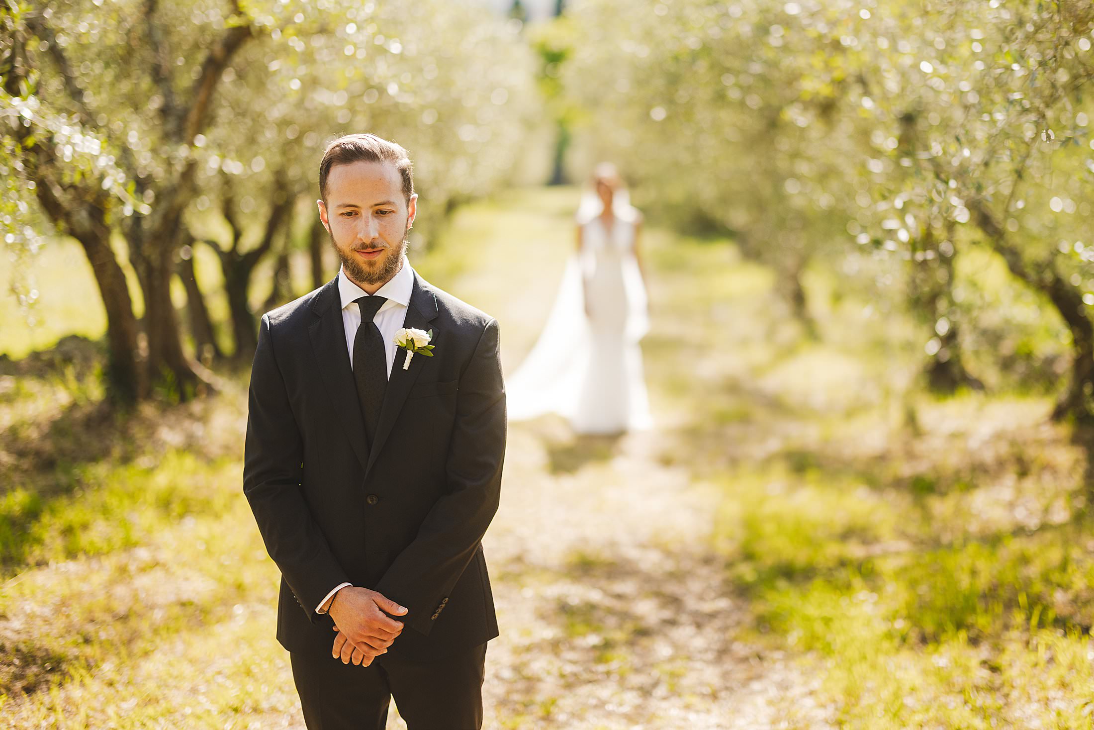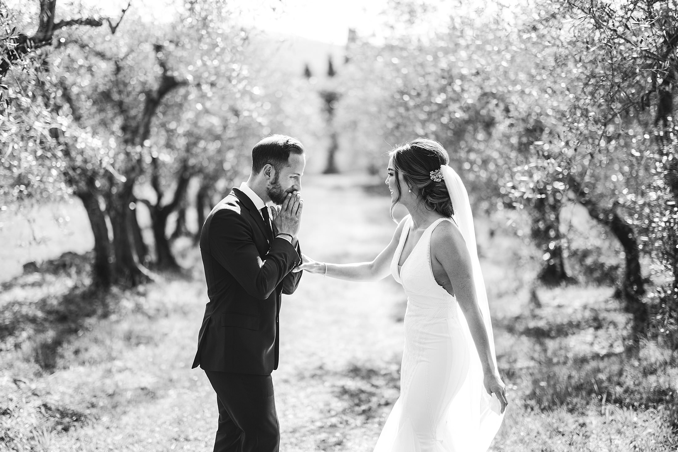 Elegant and unforgettable bride groom first look in enchanting olive groves of Borgo Stomennano in the heart of Tuscany. Photo by the elegant wedding photographer in Tuscany based Florence Gabriele Fani.
