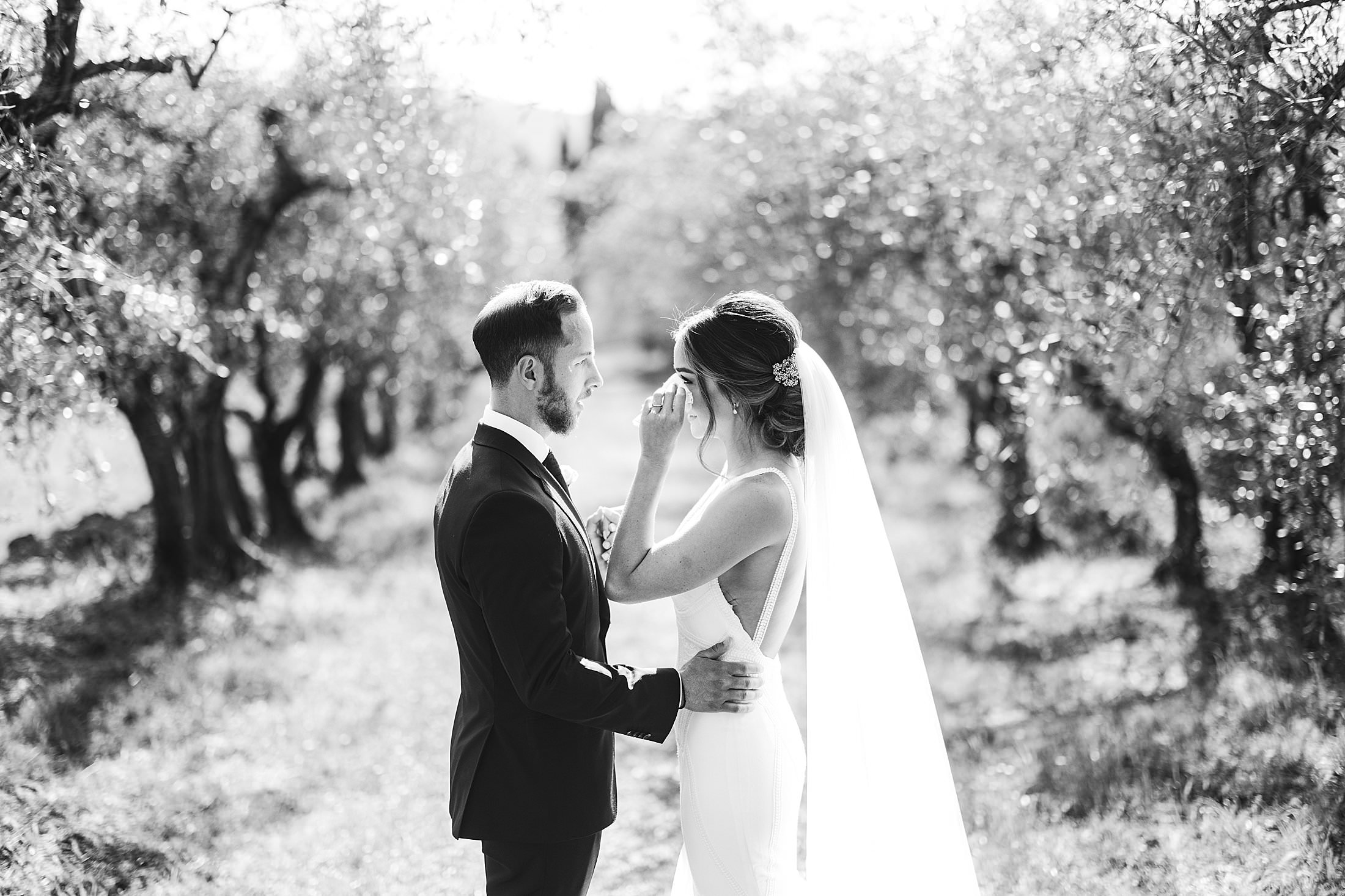 Emotional bride groom first look in enchanting olive groves of Borgo Stomennano in the heart of Tuscany. Photo by the elegant wedding photographer in Tuscany based Florence Gabriele Fani.