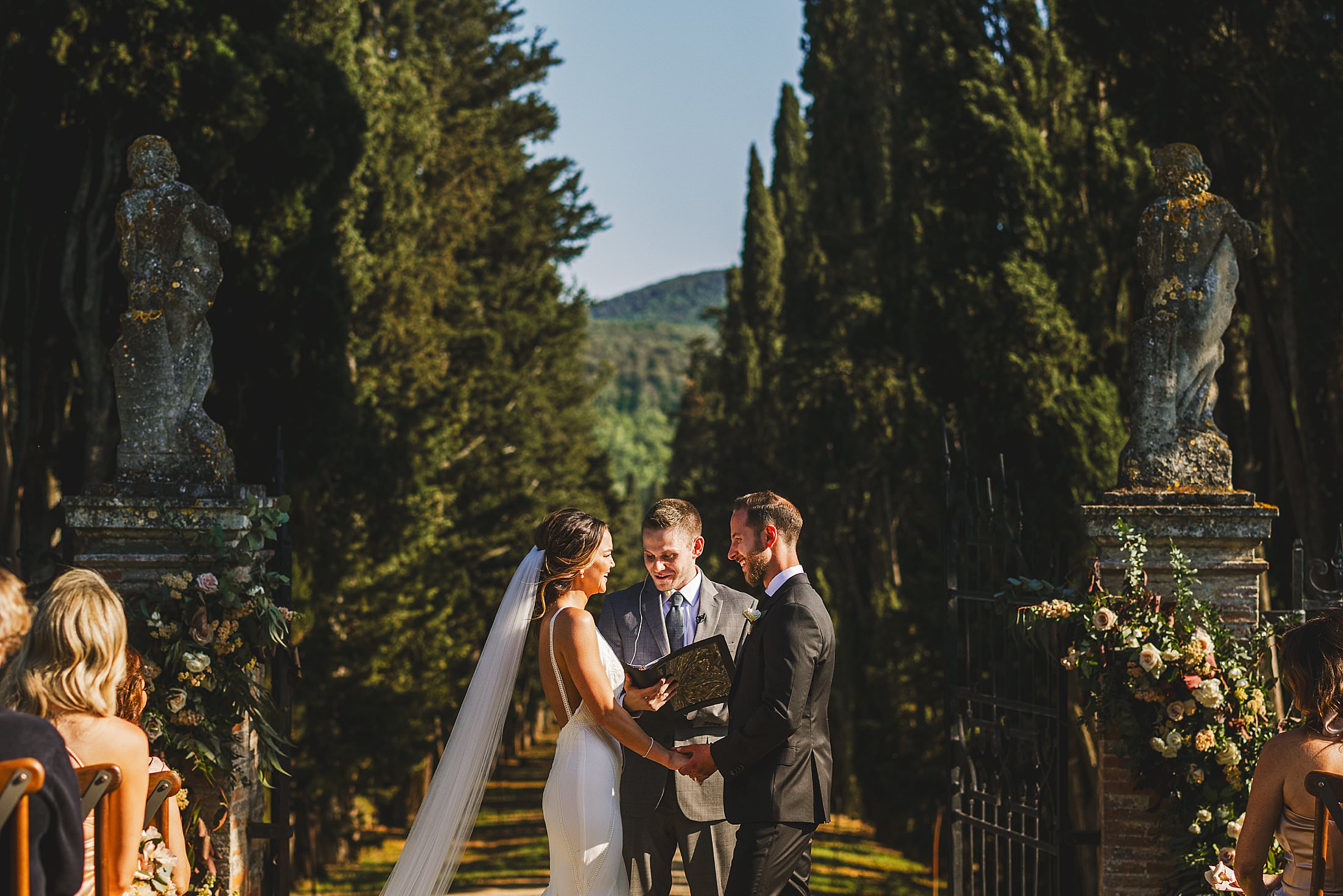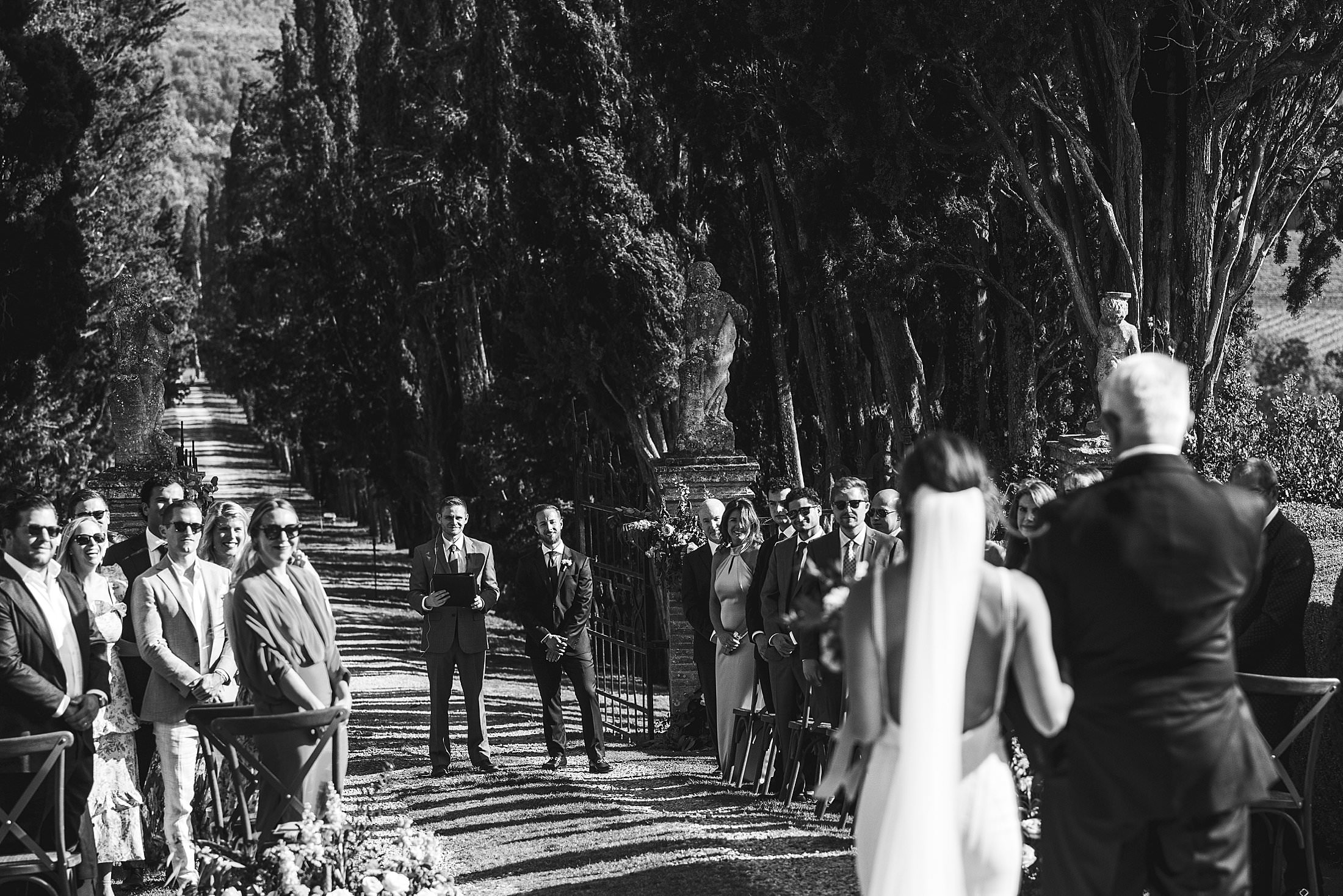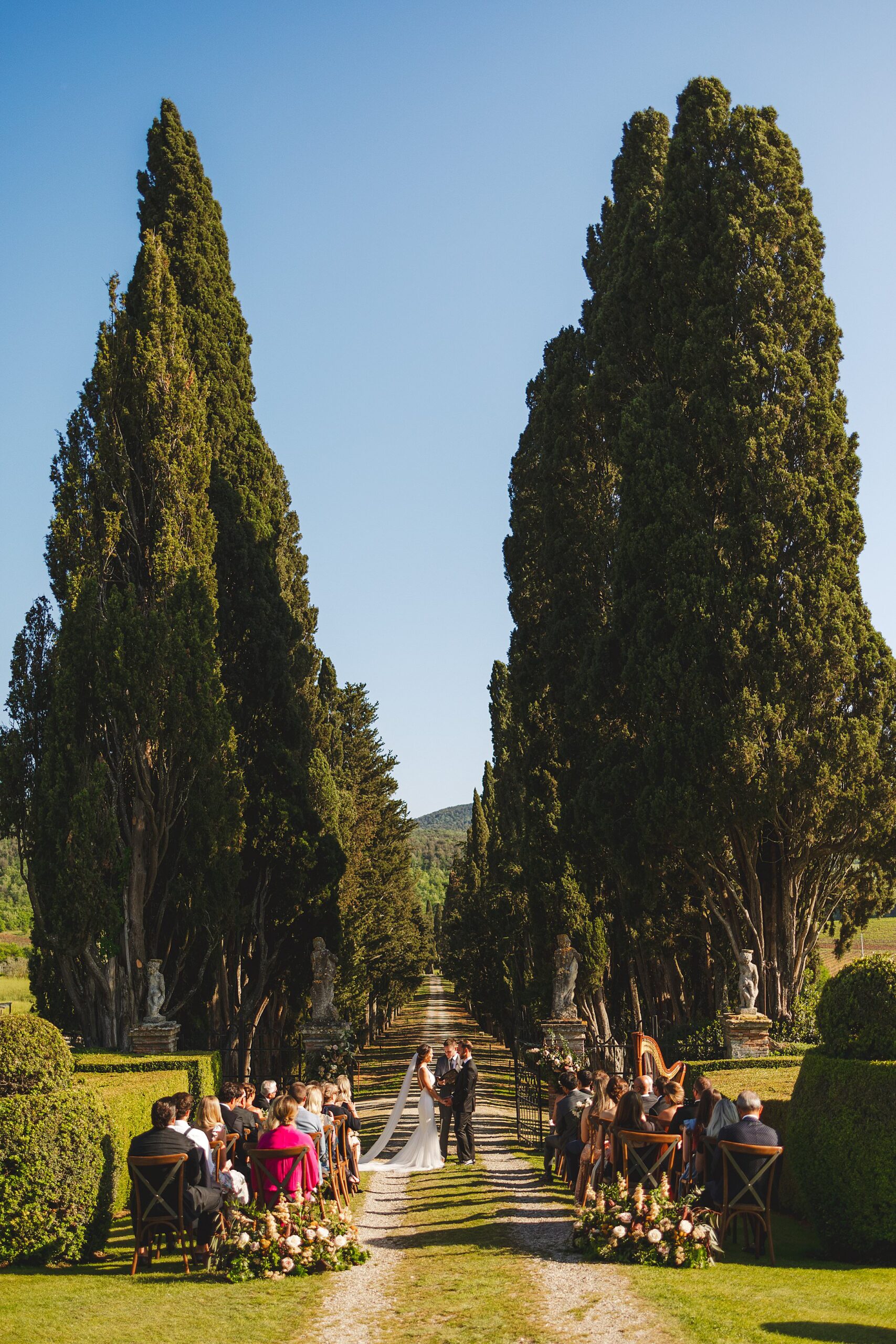 Outdoor wedding ceremony in the characteristic entrance avenue of Borgo Stomennano classic Italian venue, offering a picturesque view of cypress trees that stood witness to their union. Photo by the elegant wedding photographer in Tuscany based Florence Gabriele Fani.