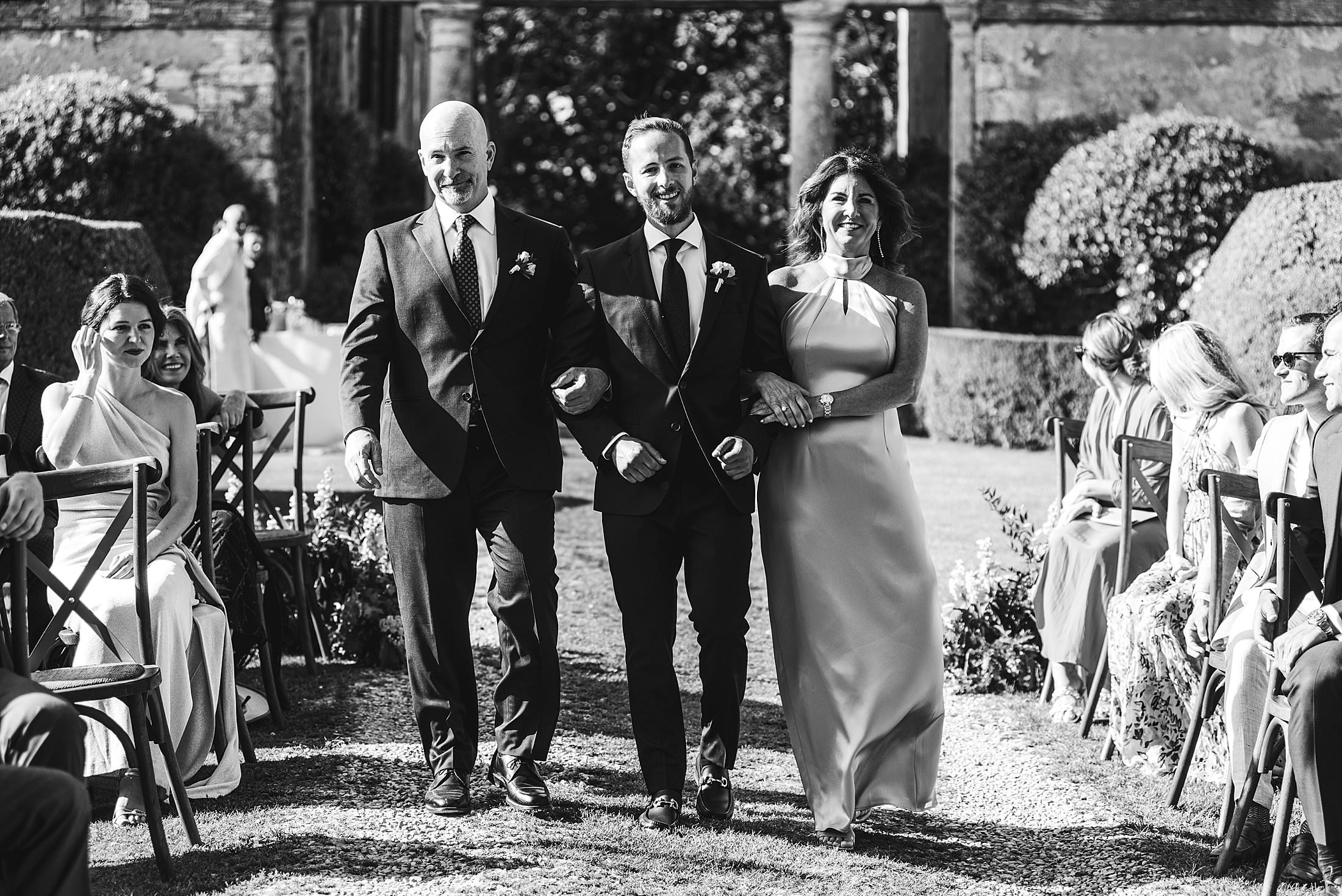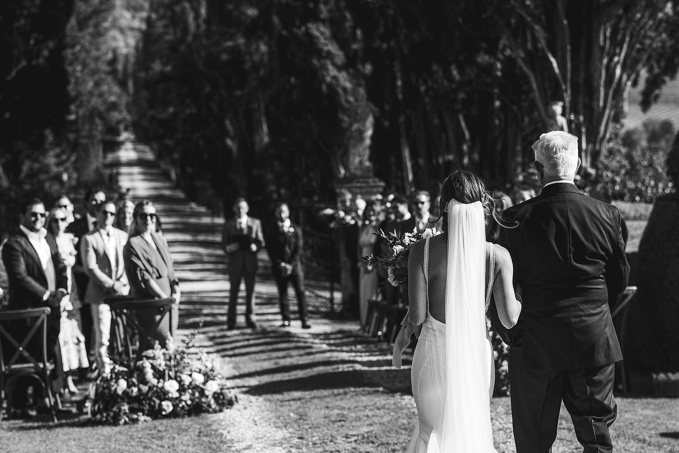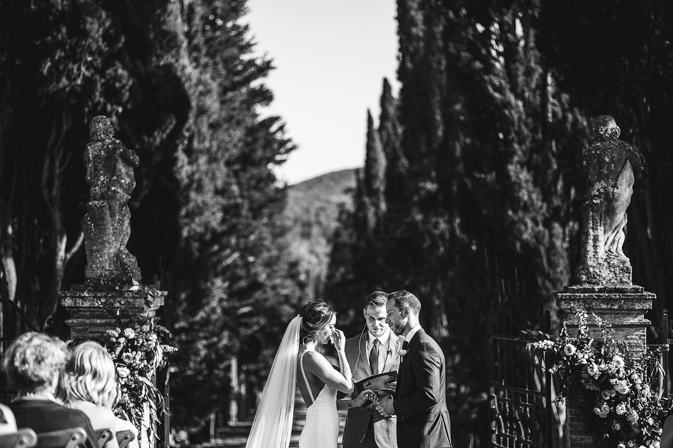 Outdoor wedding ceremony in the characteristic entrance avenue of Borgo Stomennano classic Italian venue, offering a picturesque view of cypress trees that stood witness to their union. Photo by the elegant wedding photographer in Tuscany based Florence Gabriele Fani.
