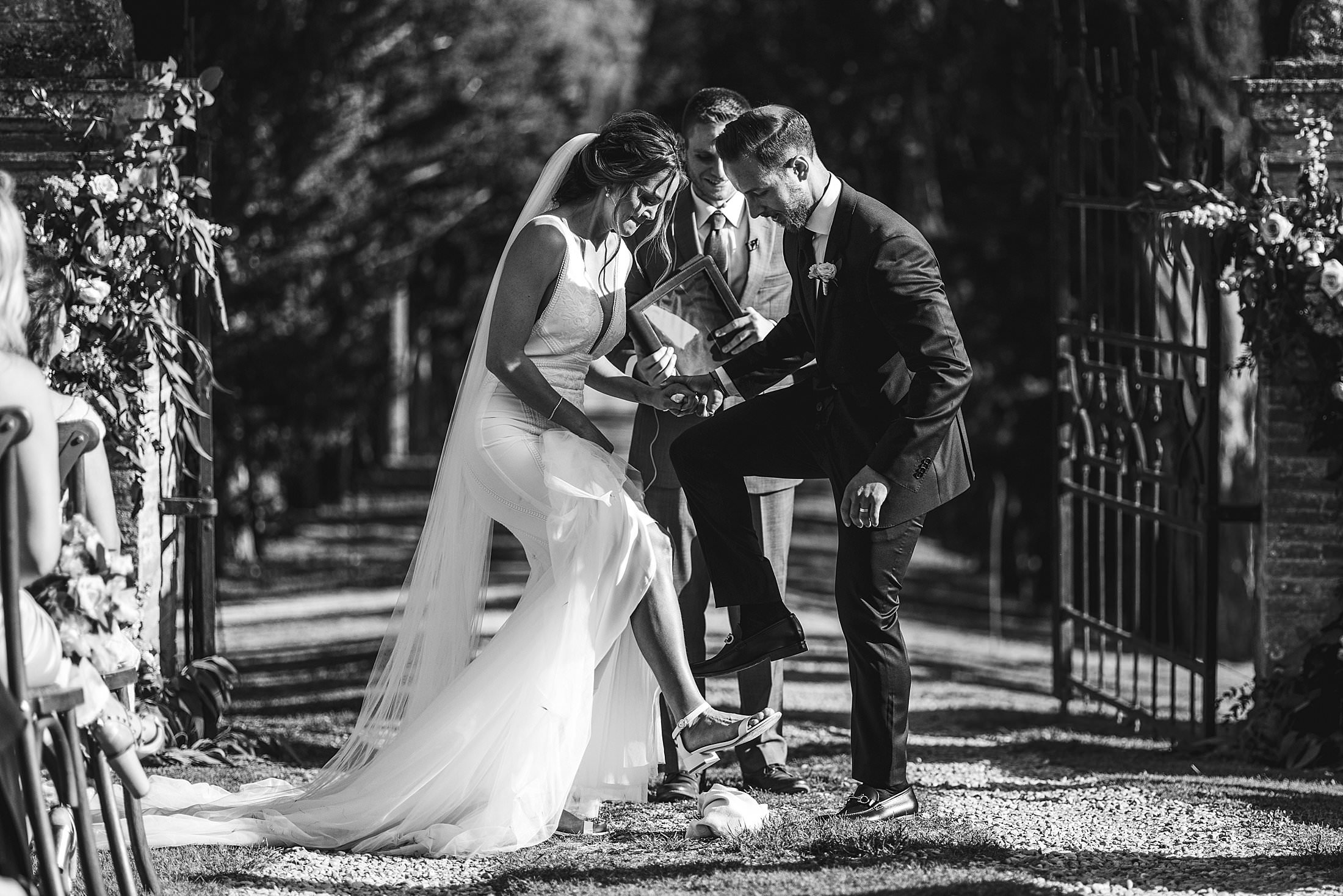 Magic and tradition, the Breaking of the Glass in the Jewish ceremony at Borgo Stomennano. Amidst the timeless beauty of Borgo Stomennano, the couple sealed their union with the symbolic breaking of the glass, surrounded by loved ones. This cherished tradition marks the beginning of a journey filled with joy, love, and lasting memories. An enchanting moment in a truly unforgettable wedding celebration. Photo by the elegant wedding photographer in Tuscany based Florence Gabriele Fani.